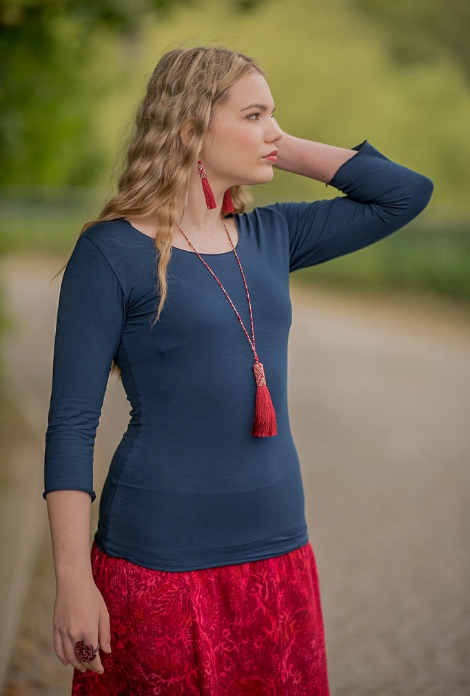 Naše copywriterka Hanka trička s tříčtvrtečním rukávem miluje a napsala nám o nich: „Když jsem s tričky Pachamama začínala, koupila jsem si 2 odstíny fialové a počítala s tím, že příští sezónu je nahradím zase jinou barvou. Chyba lávky, po dvou a půl letech nošení nemají jediný žmolek, neřídnou v podpaží, prostě drží jak helvétská víra! Nevadí, stejně si pořídím ještě modré a tyrkysové.“