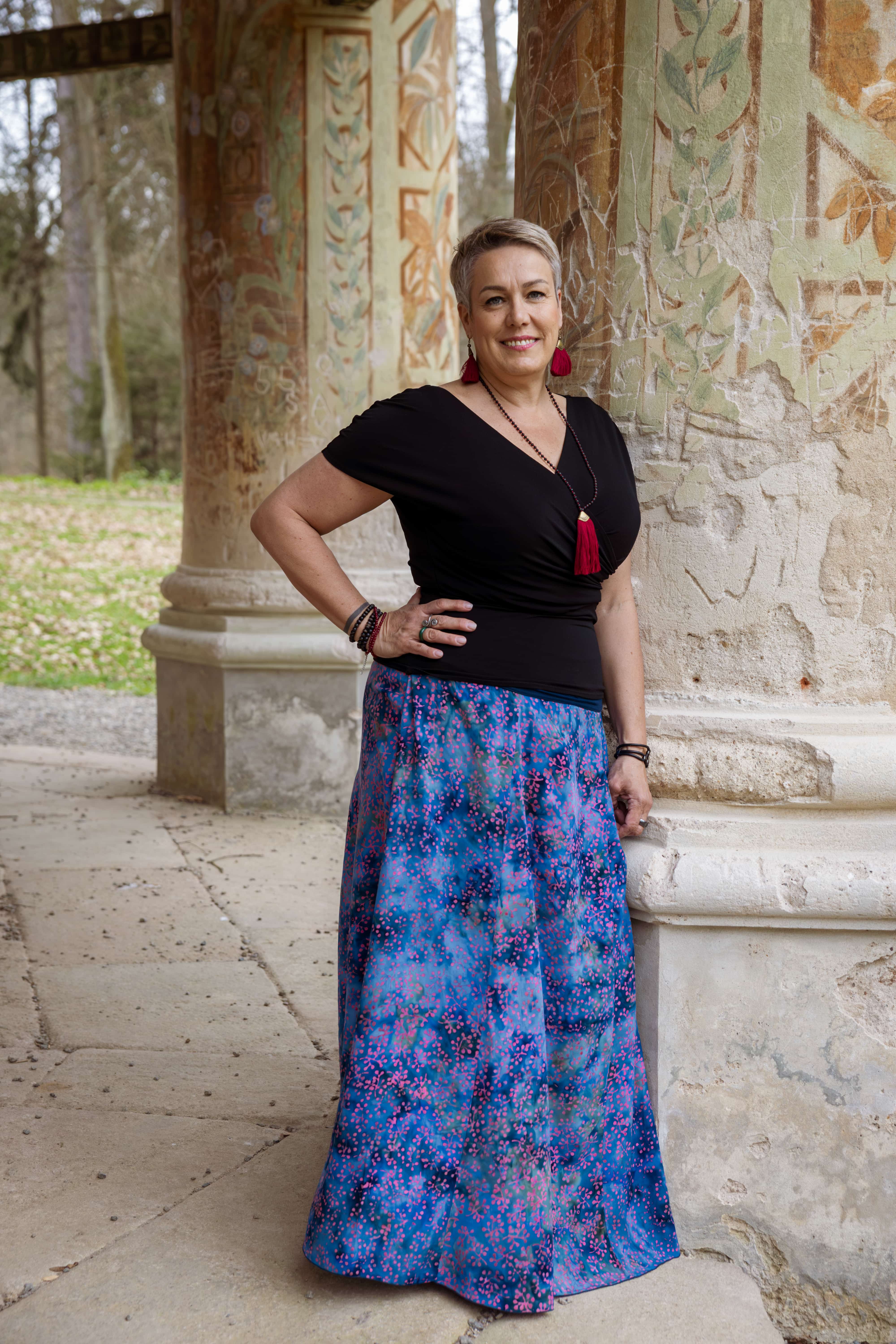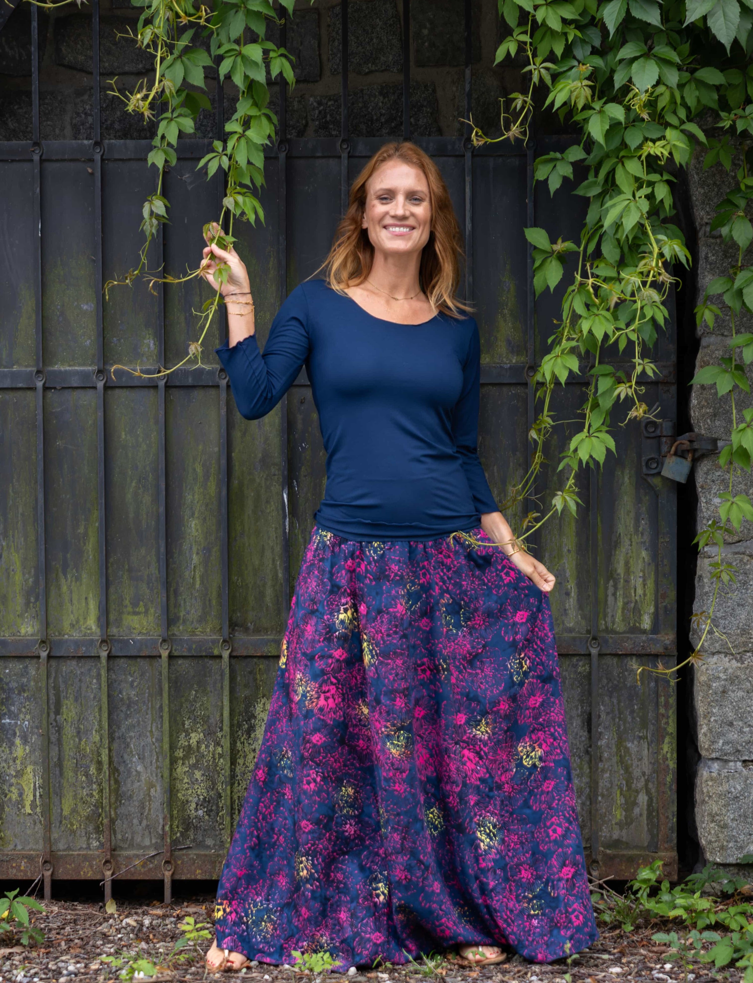 Indigo Amazonia je sukně pro dny, kdy chcete zůstat pevně ve svém středu, i když vás proud života nese kamkoli. Stačí přidat jednoduchý top v tmavě modré nebo švestkové, aby její barvy vynikly naplno.