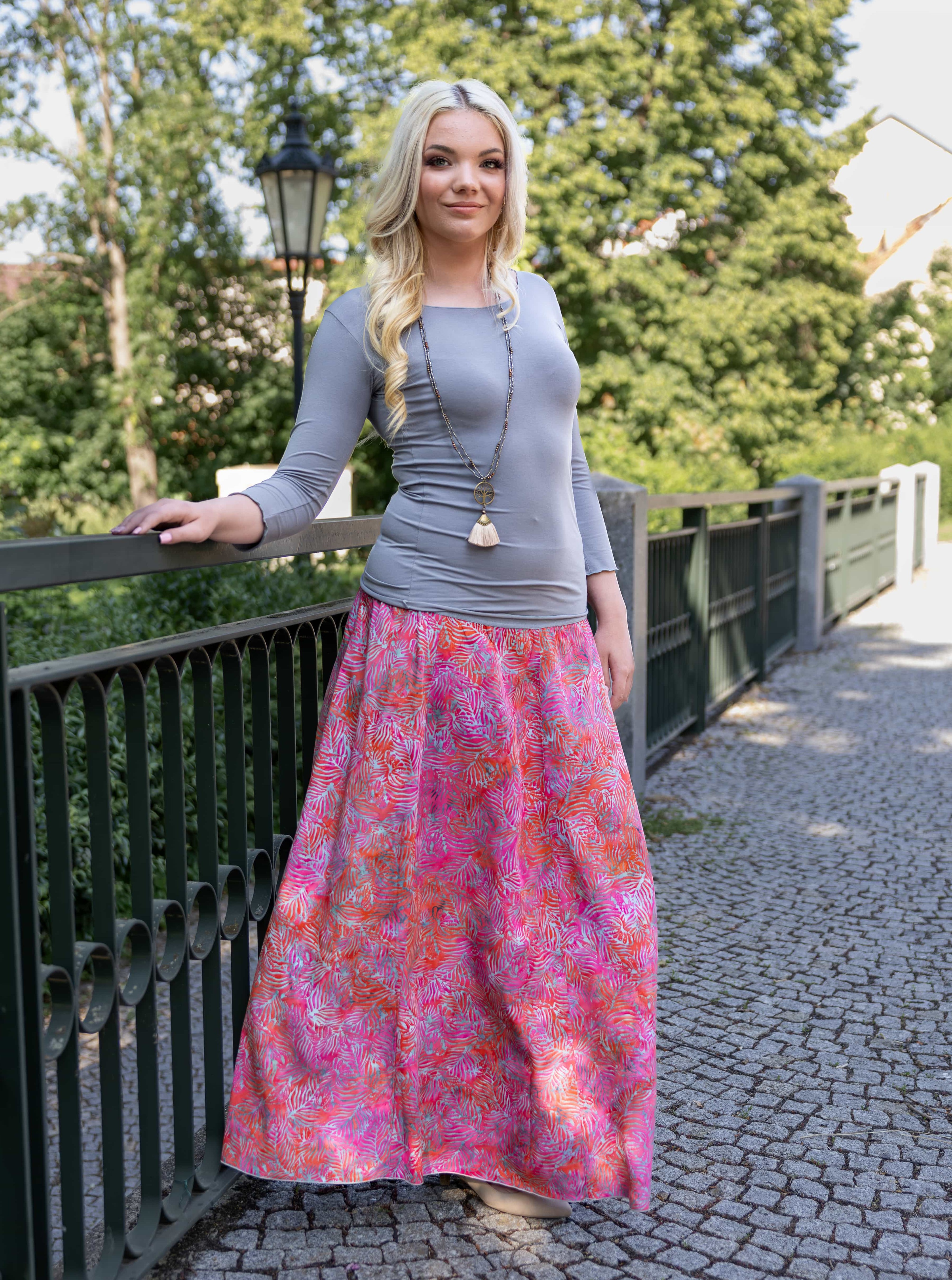 Coralina je sukně pro ženy, které mají rády teplo barev, ale nestojí o křiklavost. Korálová dodává energii, růžová ženskost a chladnější listy rovnováhu. Celek působí lehce, vzdušně a přirozeně.