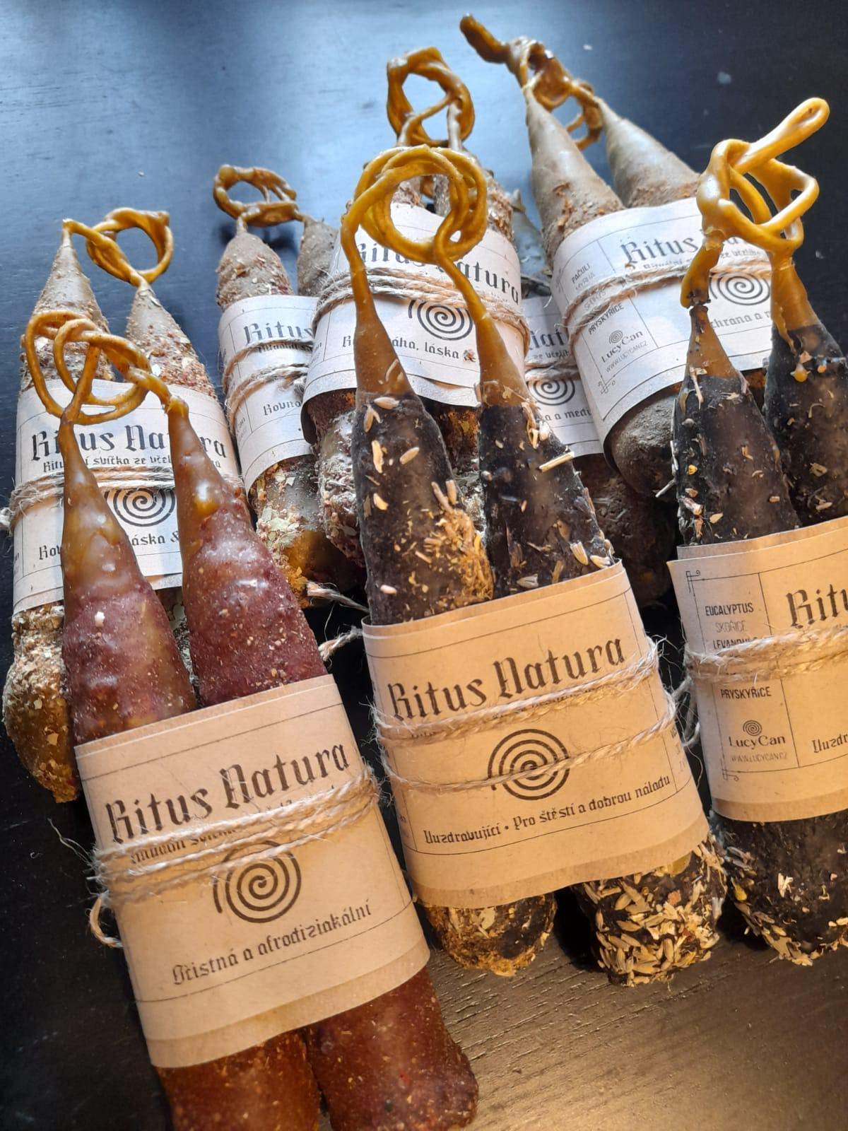 Rituální svíčky jsou opravdu určené pro fajnšmekry. Svíčky jsou vyrobené z domácí produkce včelího vosku přímo od včelaře, žádný čištěný vosk. Jsou určené tak trochu pro čarodějnice, které praktikují rituály. Každá ručně máčená svíce je velmi náročná na výrobu a díky složení bylin a koření má v sobě jiný účel. Svíčky jsou máčené za úplňku, takže jejich působení je o to magičtější.