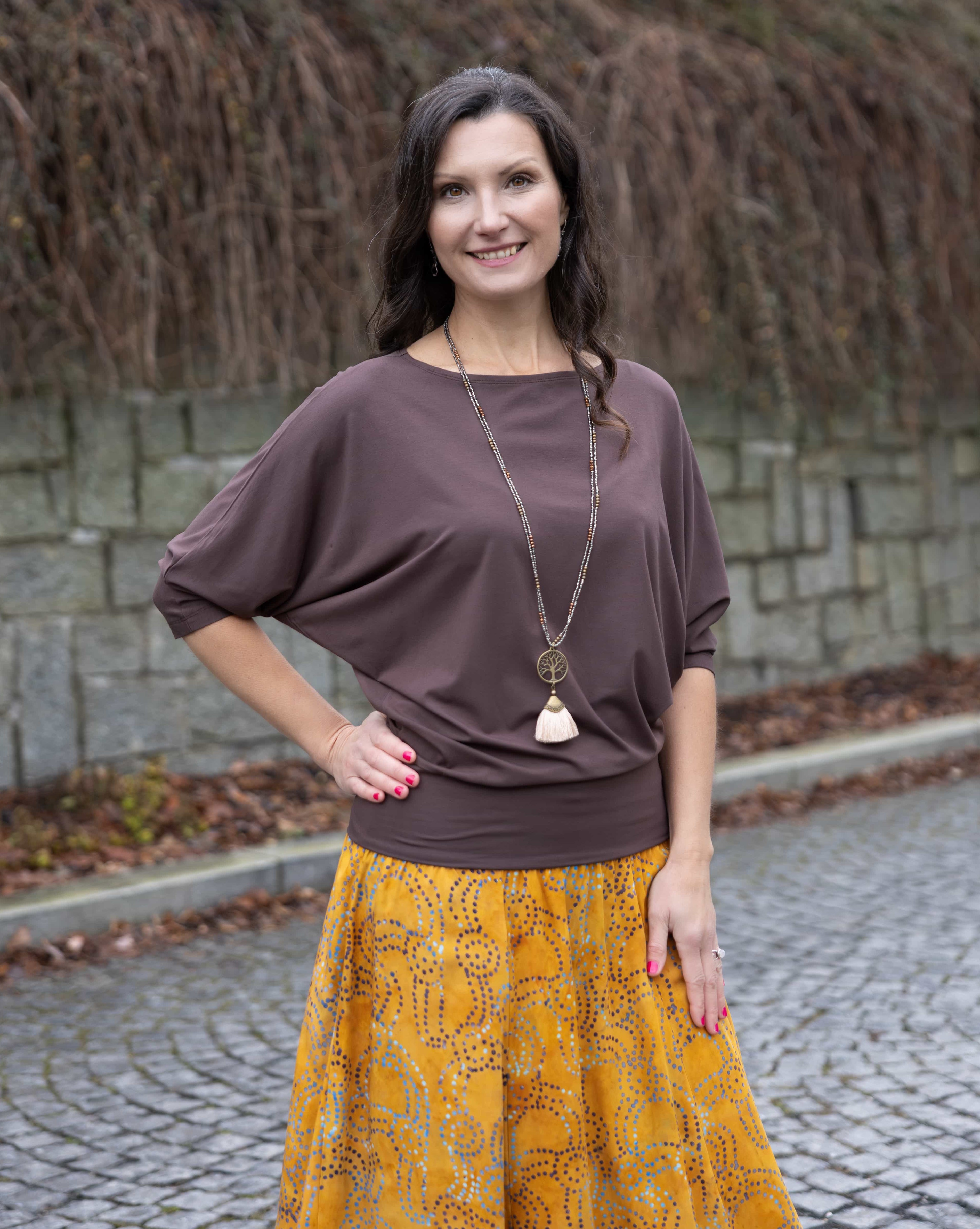Jestli nevíš, jaký top bys k ní nosila, podívej se na náš e-shop. Právě jsme naskladnily jednobarevná trika s ¾ rukávem – vyzkoušej k Mahiře třeba tmavě modré triko Keira v odstínu Navy nebo nový odstín Cocoa Brown.