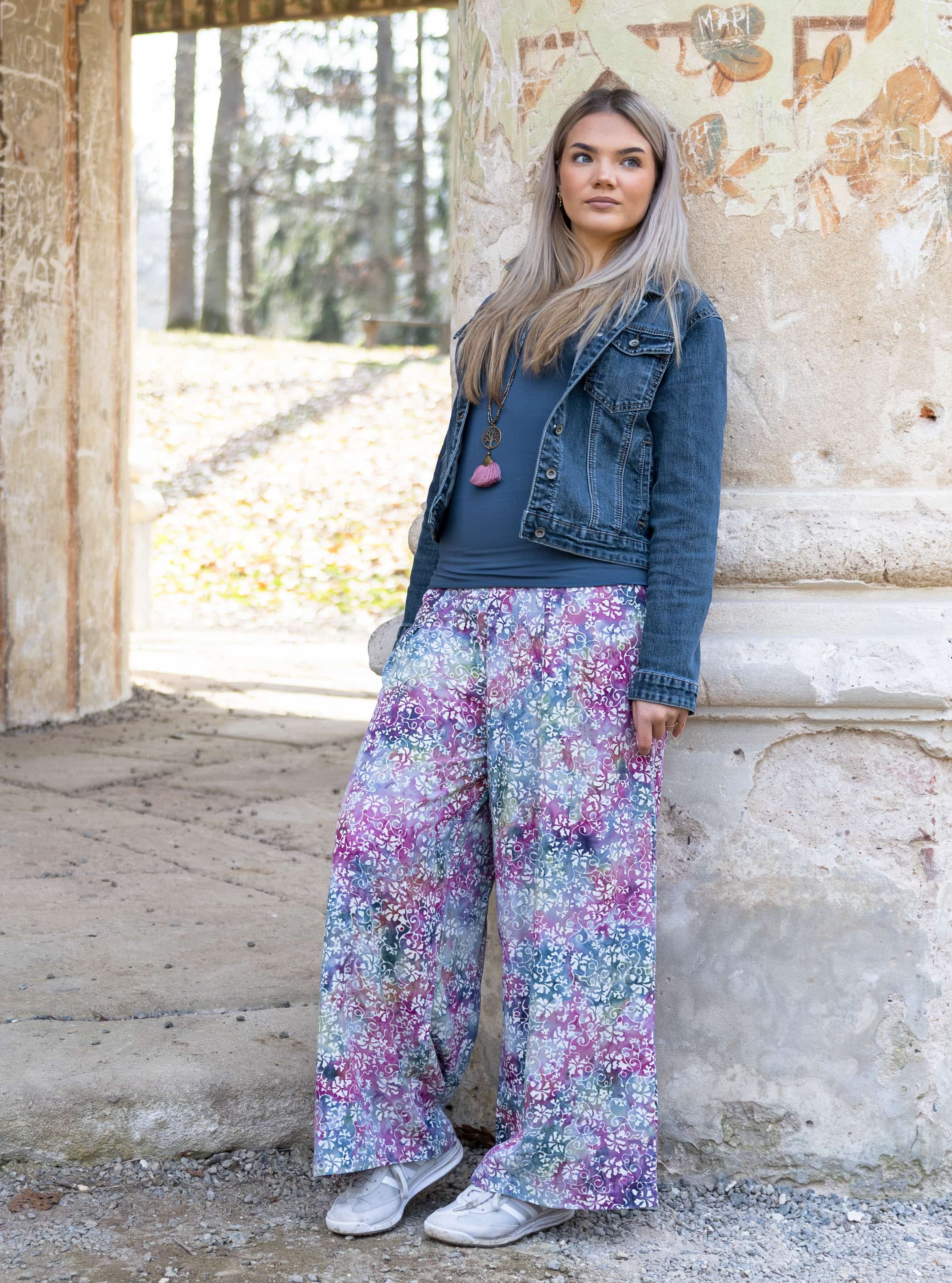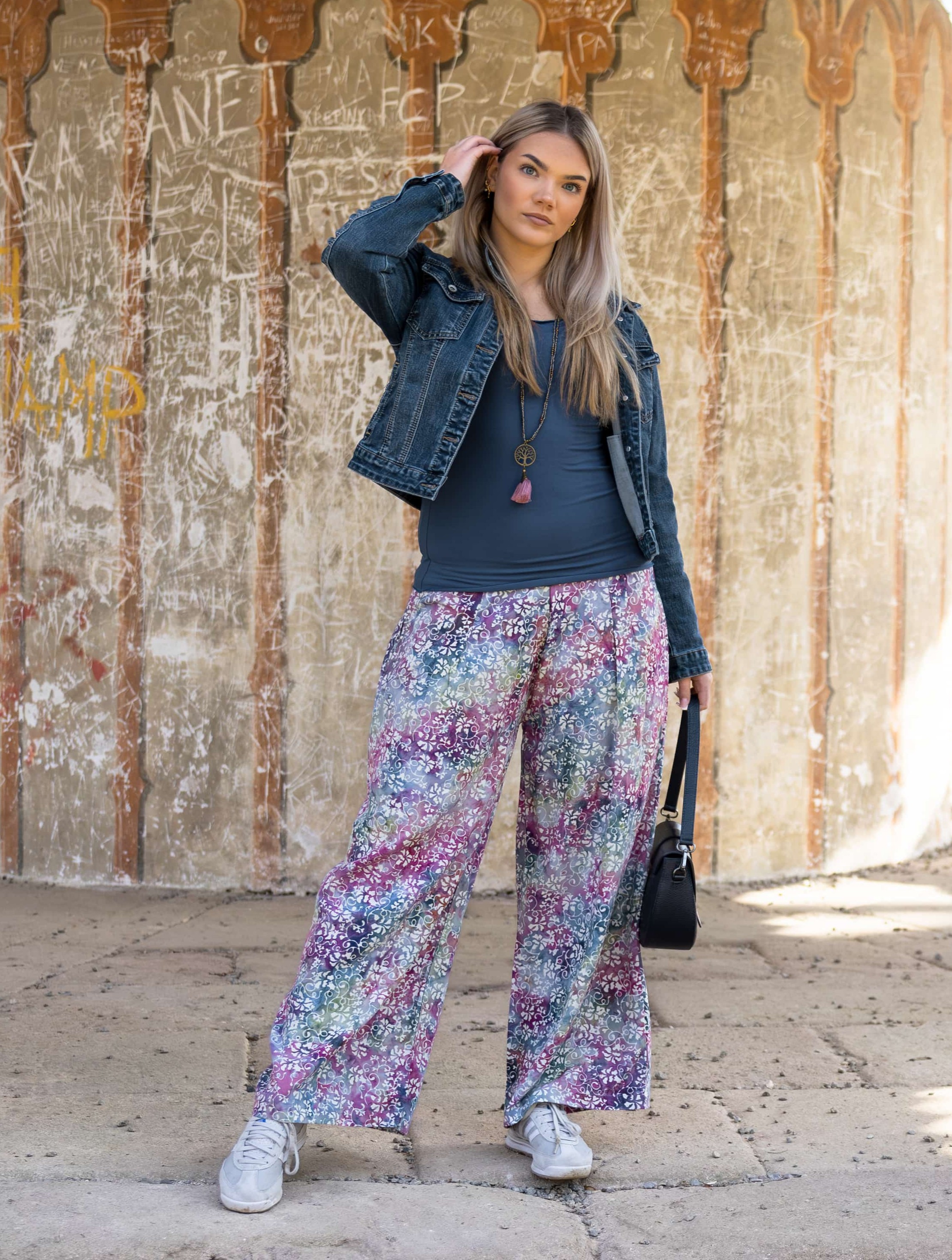 Jsou vyrobeny z lehké, splývavé viskózy a zdobeny jedinečným ručně batikovaným vzorem, který dodává každému kusu originalitu. Široký pružný pas se přizpůsobí vaší postavě a zajišťuje komfort po celý den. Trendy široký střih nohavic nejen skvěle vypadá, ale také poskytuje volnost pohybu.