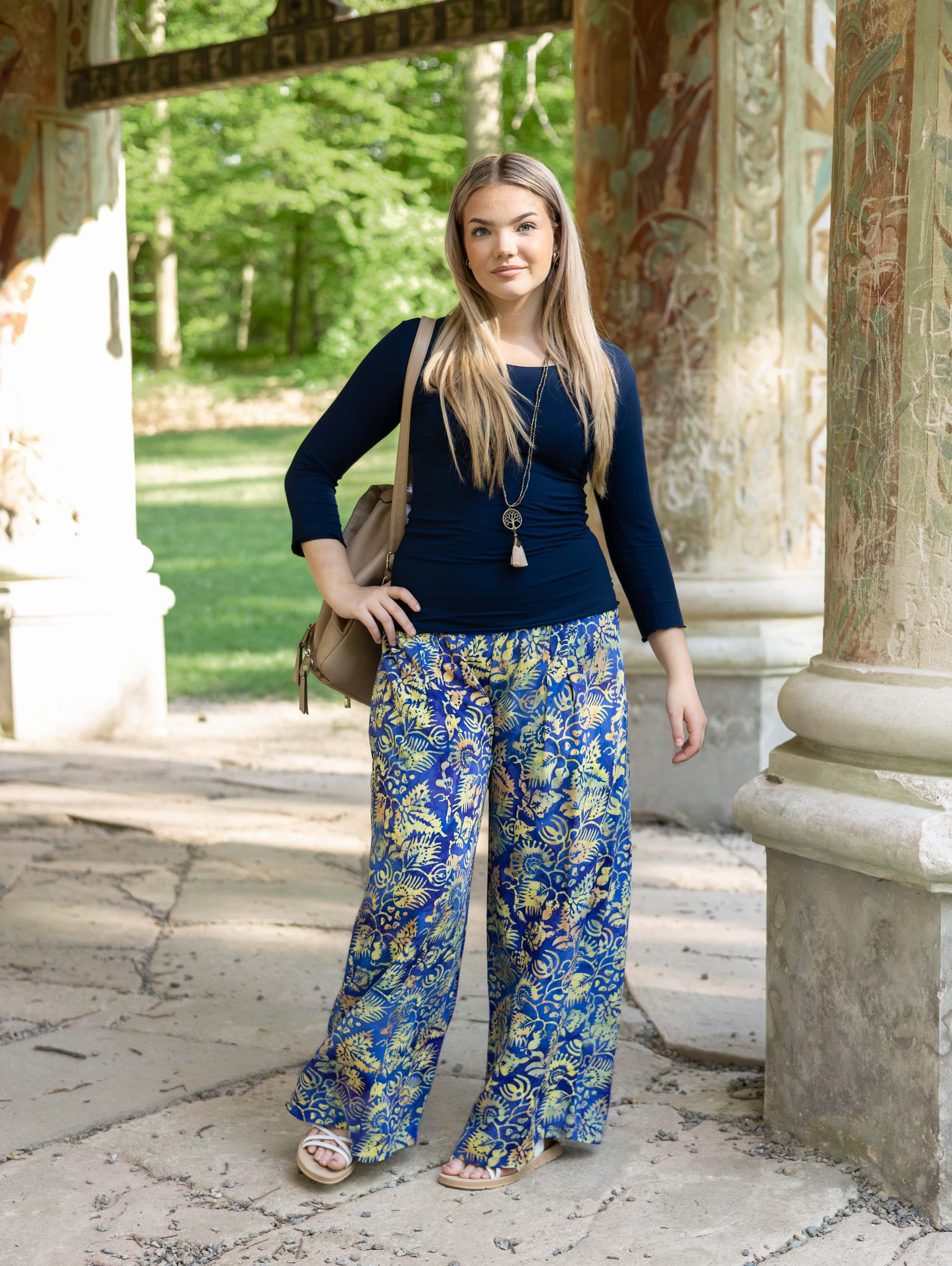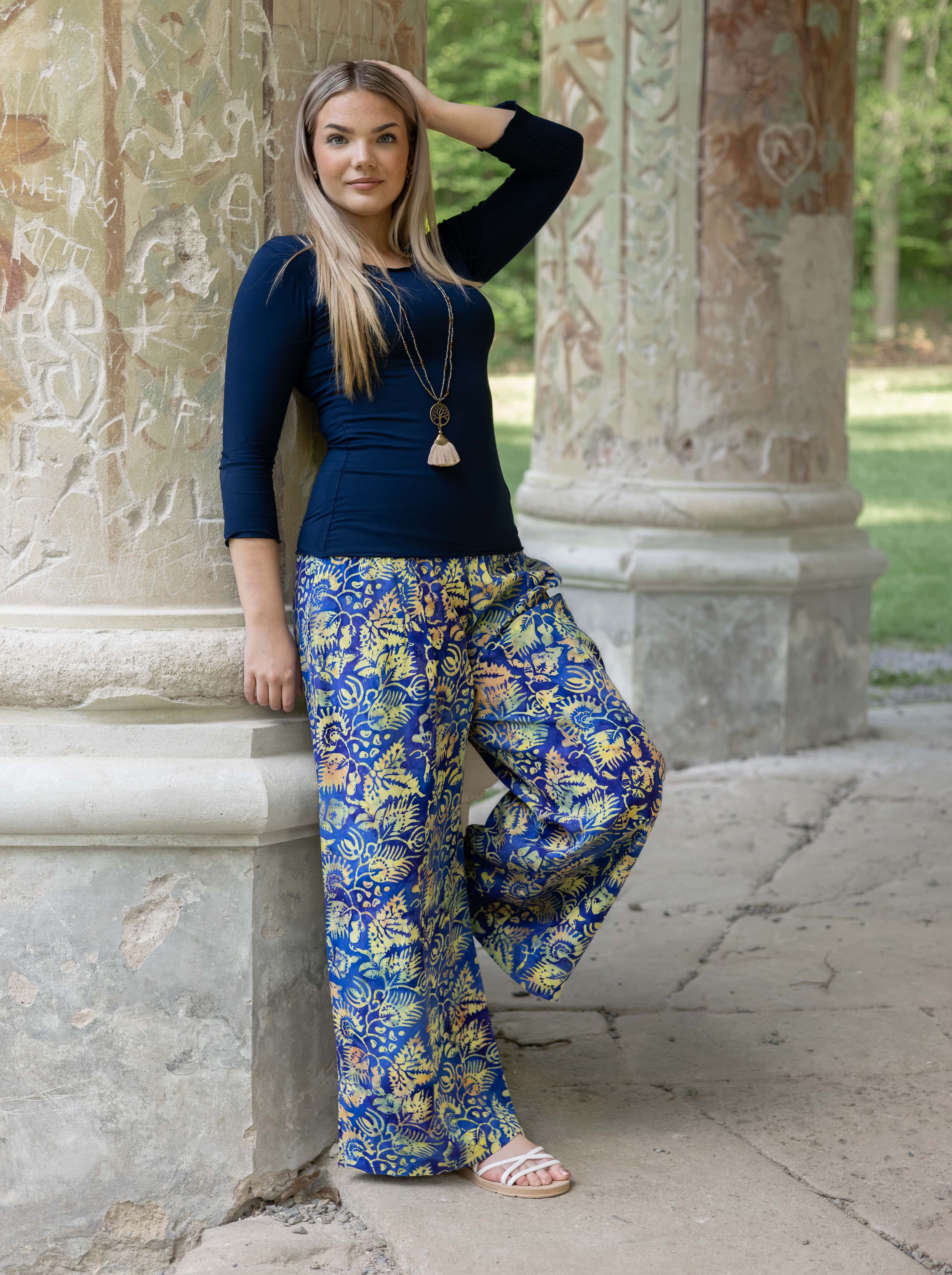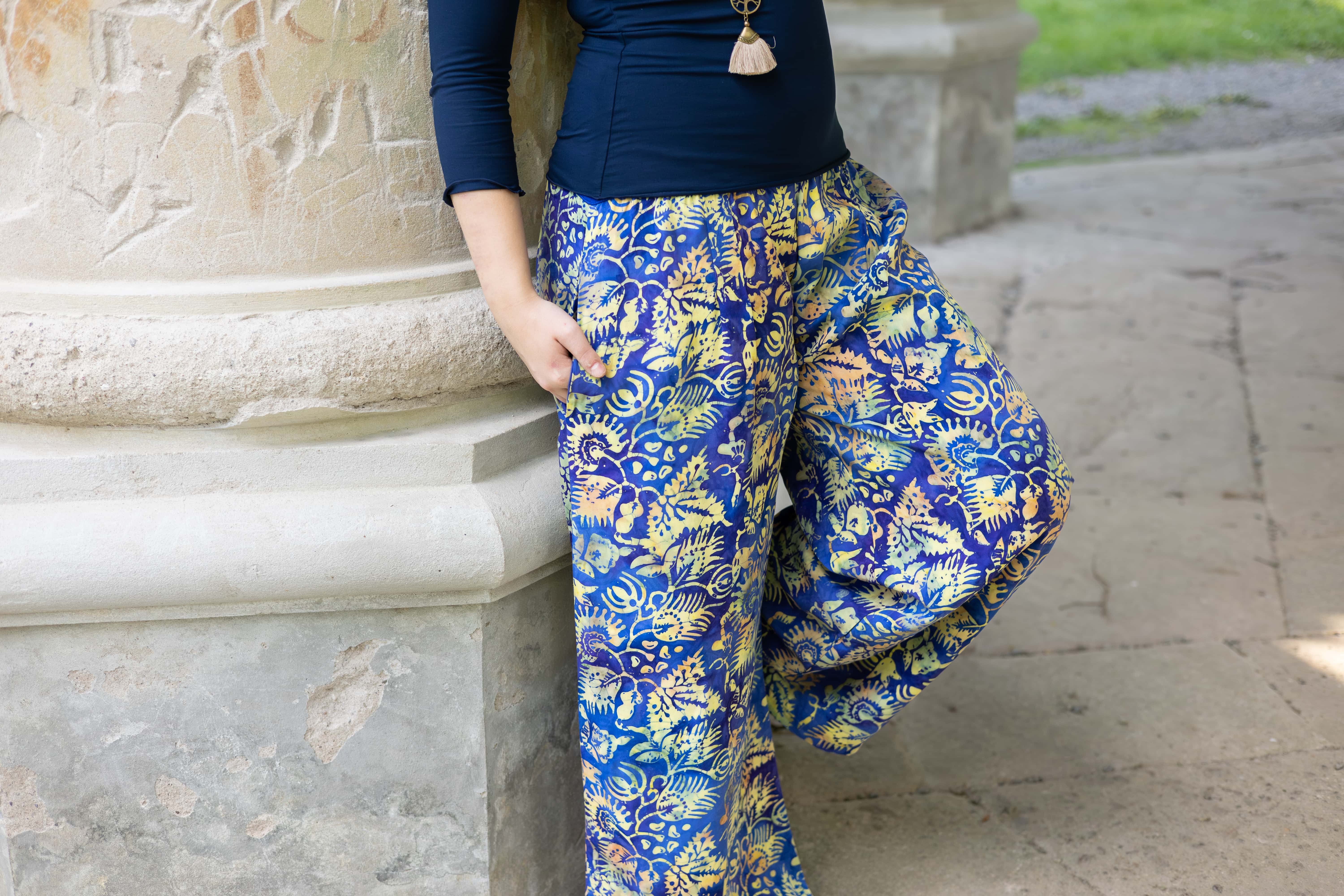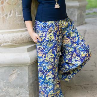 Jsou vyrobeny z lehké, splývavé viskózy a zdobeny jedinečným ručně batikovaným vzorem, který dodává každému kusu originalitu. Široký pružný pas se přizpůsobí vaší postavě a zajišťuje komfort po celý den. Trendy široký střih nohavic nejen skvěle vypadá, ale také poskytuje volnost pohybu.