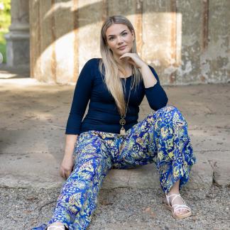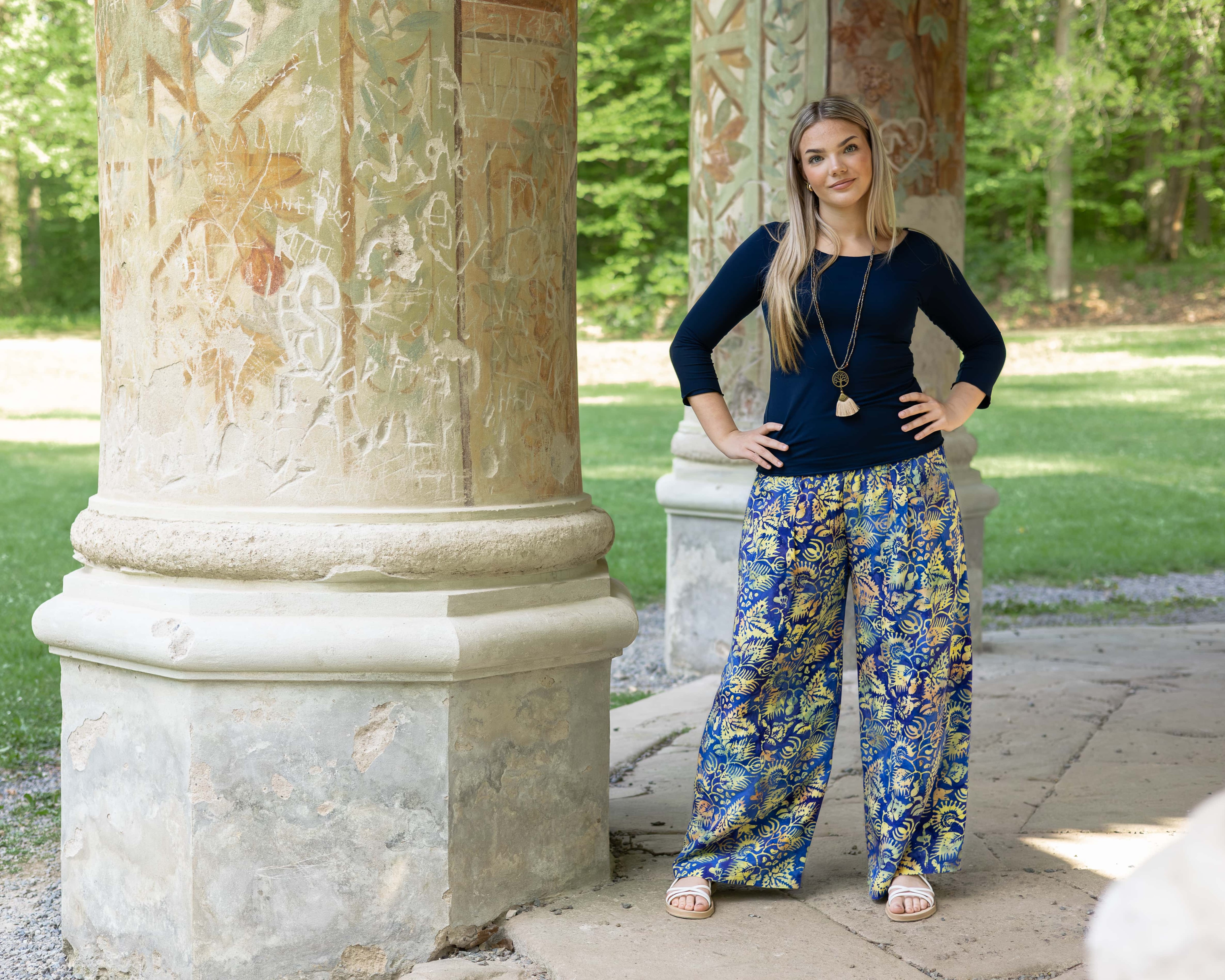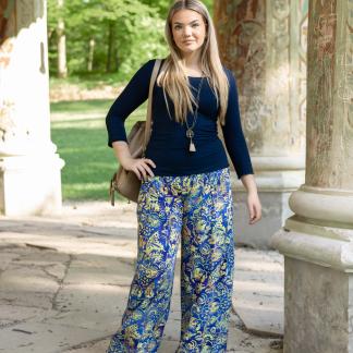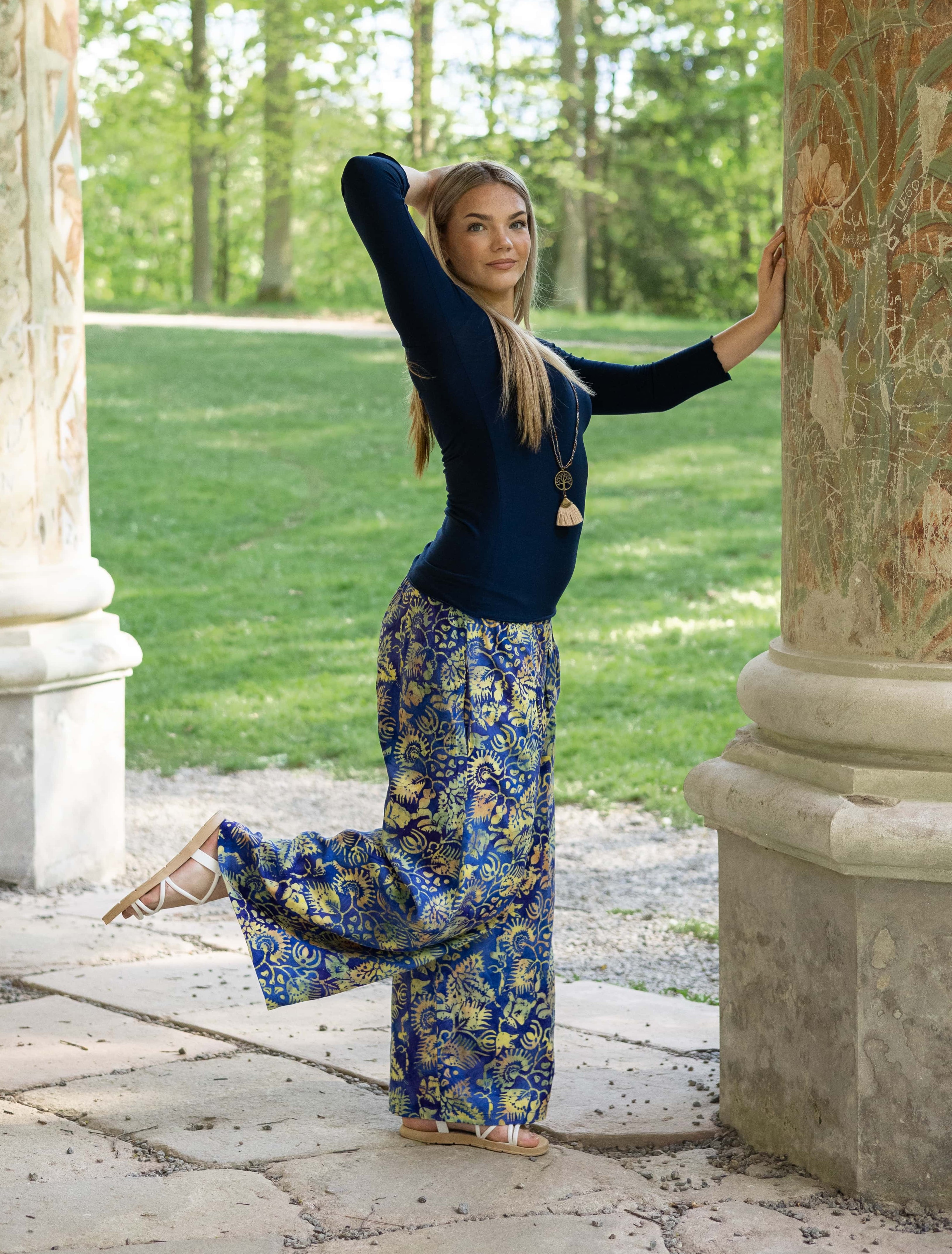 Jsou vyrobeny z lehké, splývavé viskózy a zdobeny jedinečným ručně batikovaným vzorem, který dodává každému kusu originalitu. Široký pružný pas se přizpůsobí vaší postavě a zajišťuje komfort po celý den. Trendy široký střih nohavic nejen skvěle vypadá, ale také poskytuje volnost pohybu.