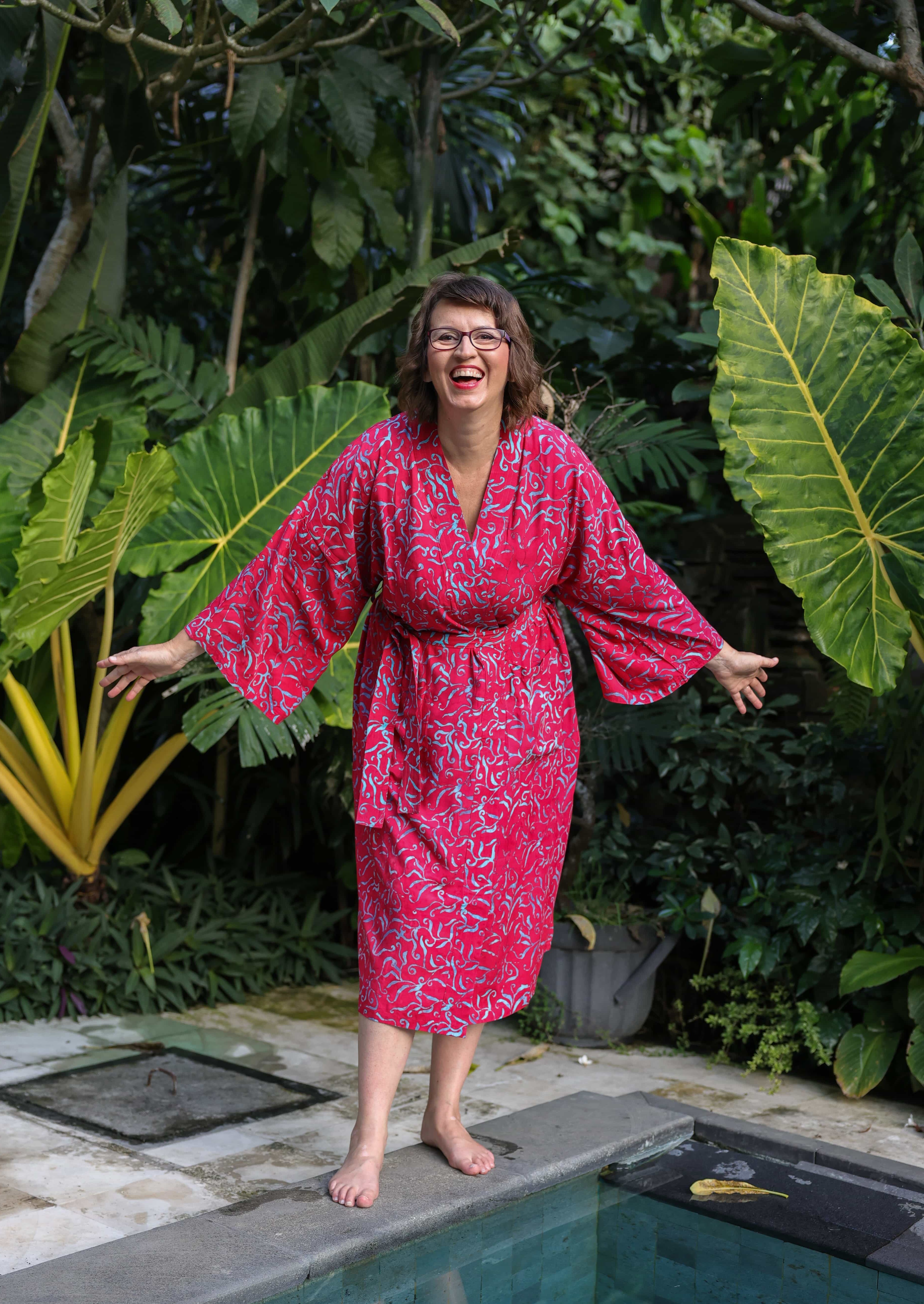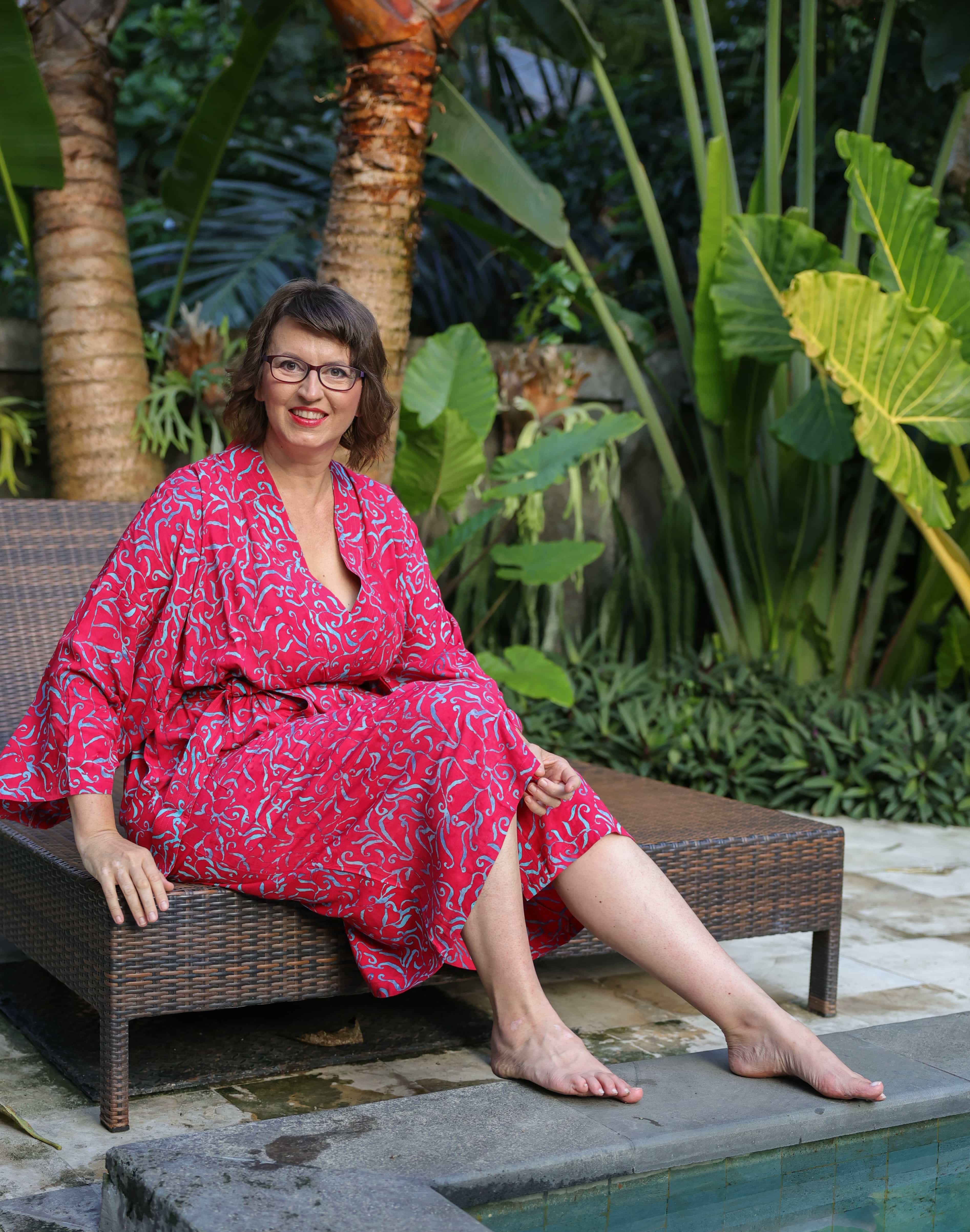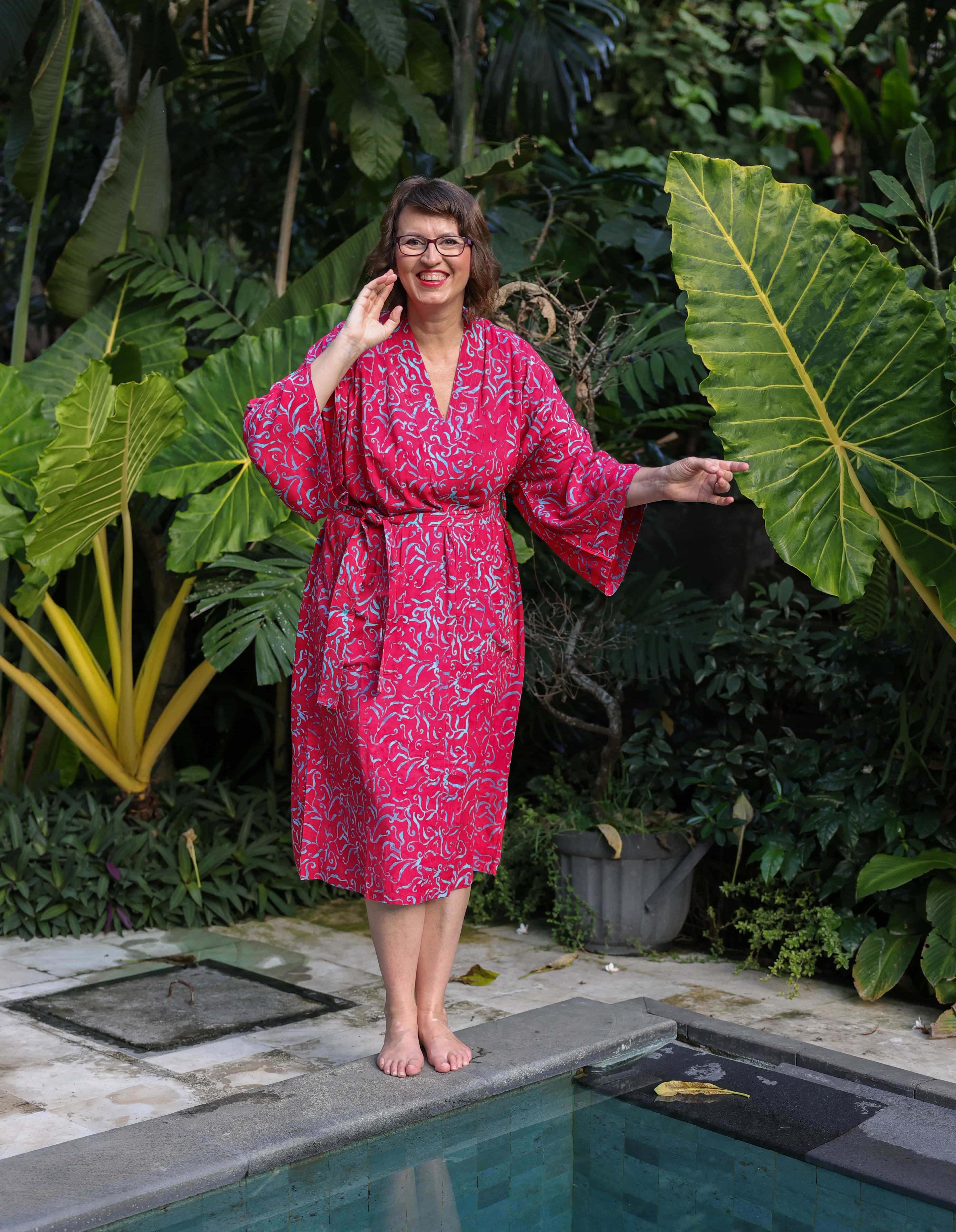 Kimona pro vás ručně ušily a nabatikovali ve spřátelené rodinné dílně paní Nyoman, takže stejný kus na pláži nebo v sauně prostě nepotkáte. Navíc nákupem podporujete konkrétní lidi, kteří za svou práci dostávají férově zaplaceno.