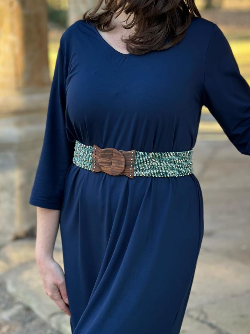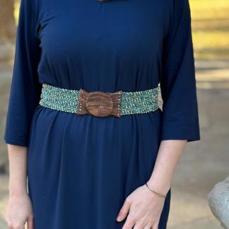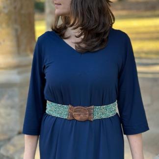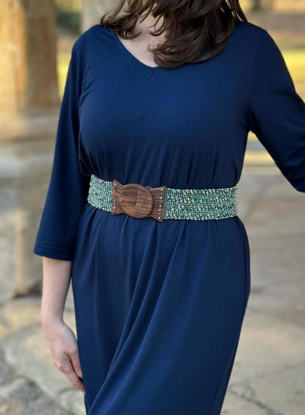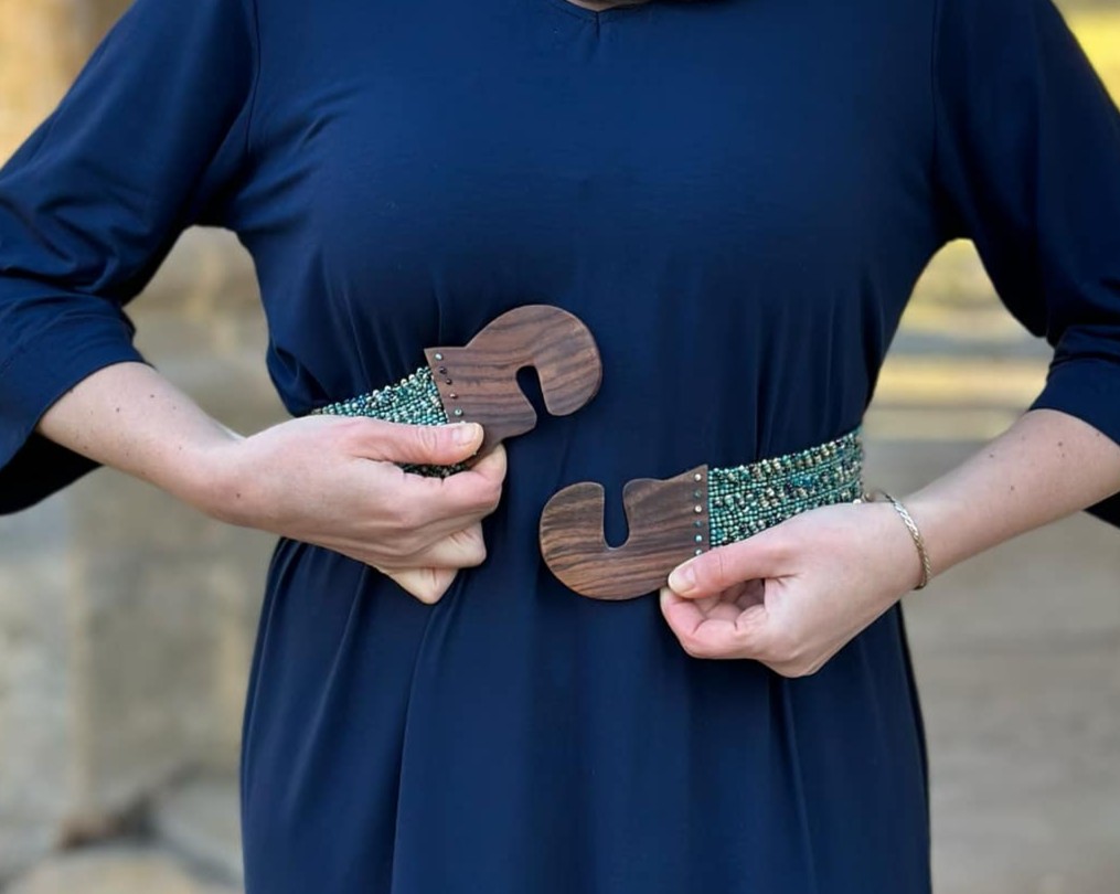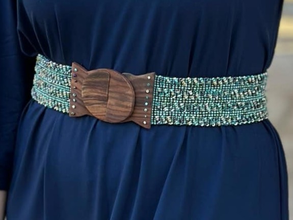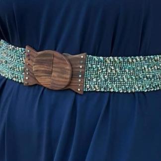 Dodejte svému outfitu dokonalý tvar s naším pružným korálkovým opaskem v boho stylu. Ručně vyráběný z jemně třpytivých skleněných korálků a zakončený výraznou dřevěnou sponou, krásně zvýrazní váš pas a podtrhne ladné ženské křivky. Přizpůsobivý a pohodlný – skvěle se přizpůsobí vaší postavě díky pružným gumičkám, které umožňují natažení až do 130 cm.
