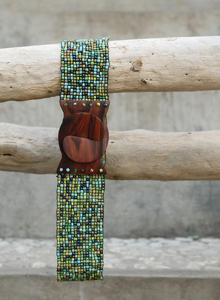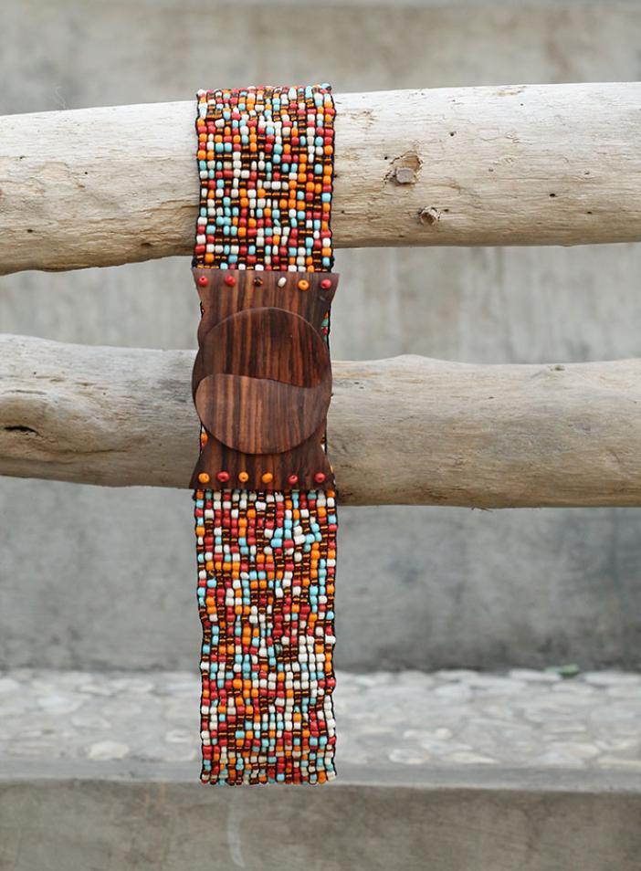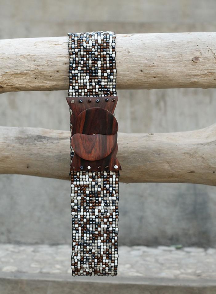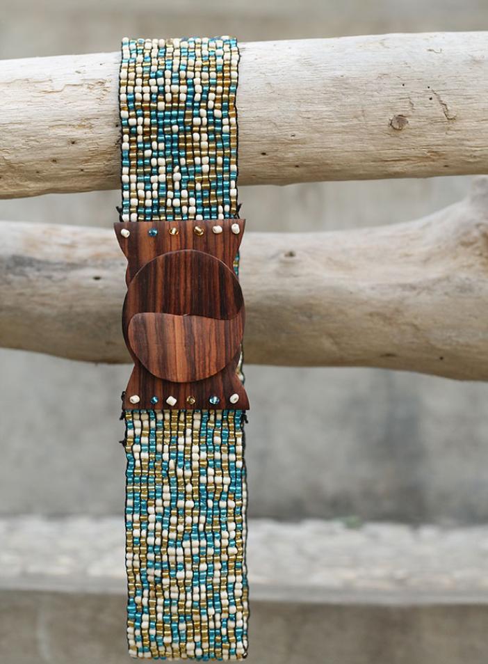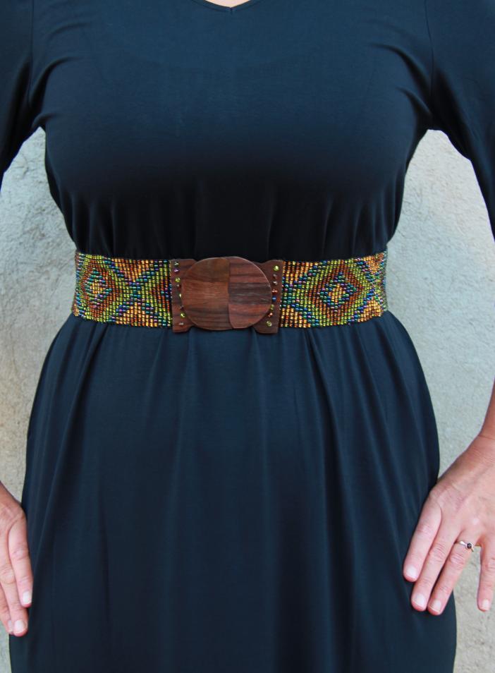 Korálkové opasky s dřevěnou přezkou zvýrazní váš pas a nechají vyniknout křivky. Originální opasky ze skleněných korálků necháváme vyrábět ručně u manželů Budyho a Visky, kteří díky tomu dostávají za svou práci férově zaplaceno.
