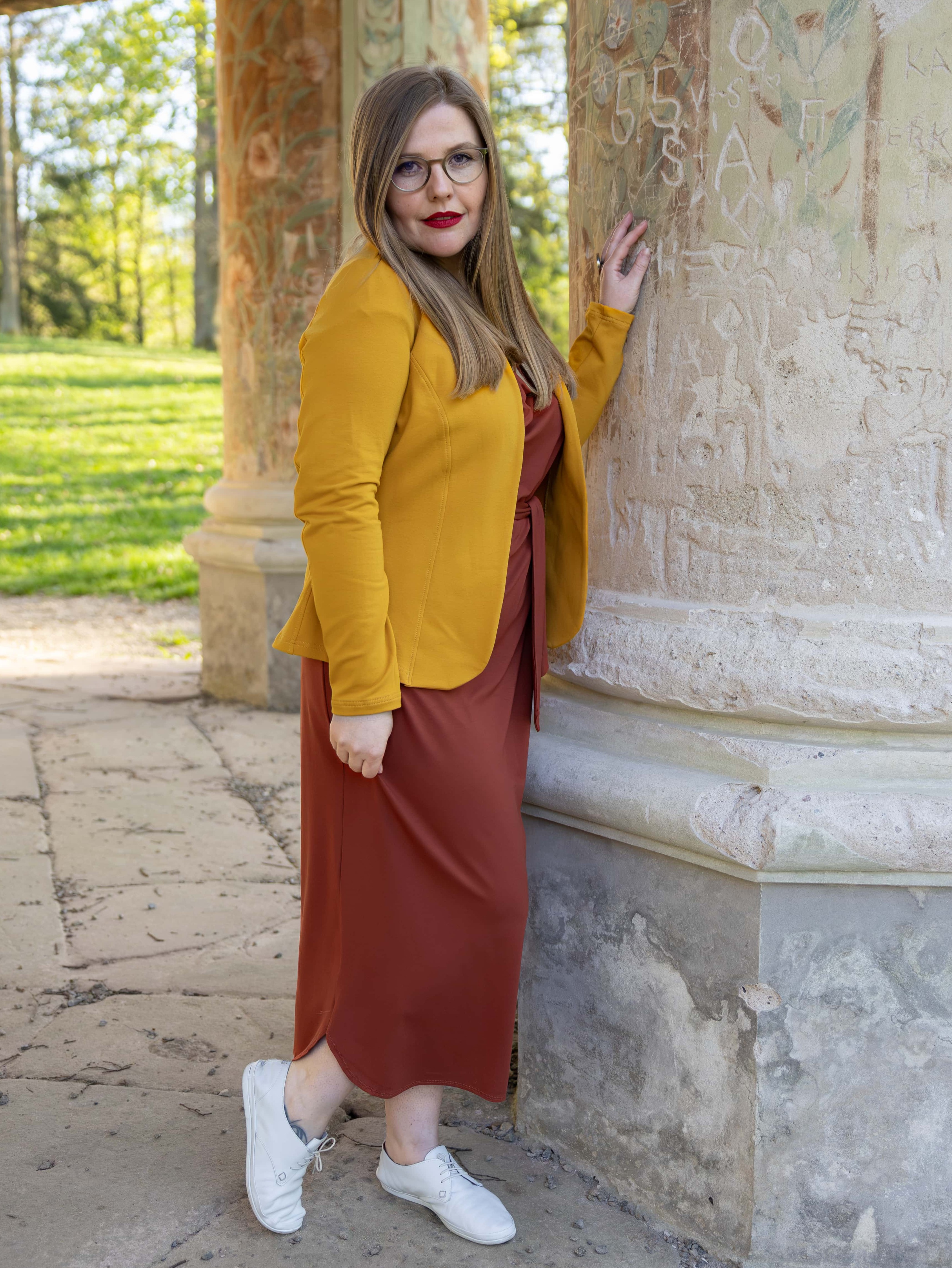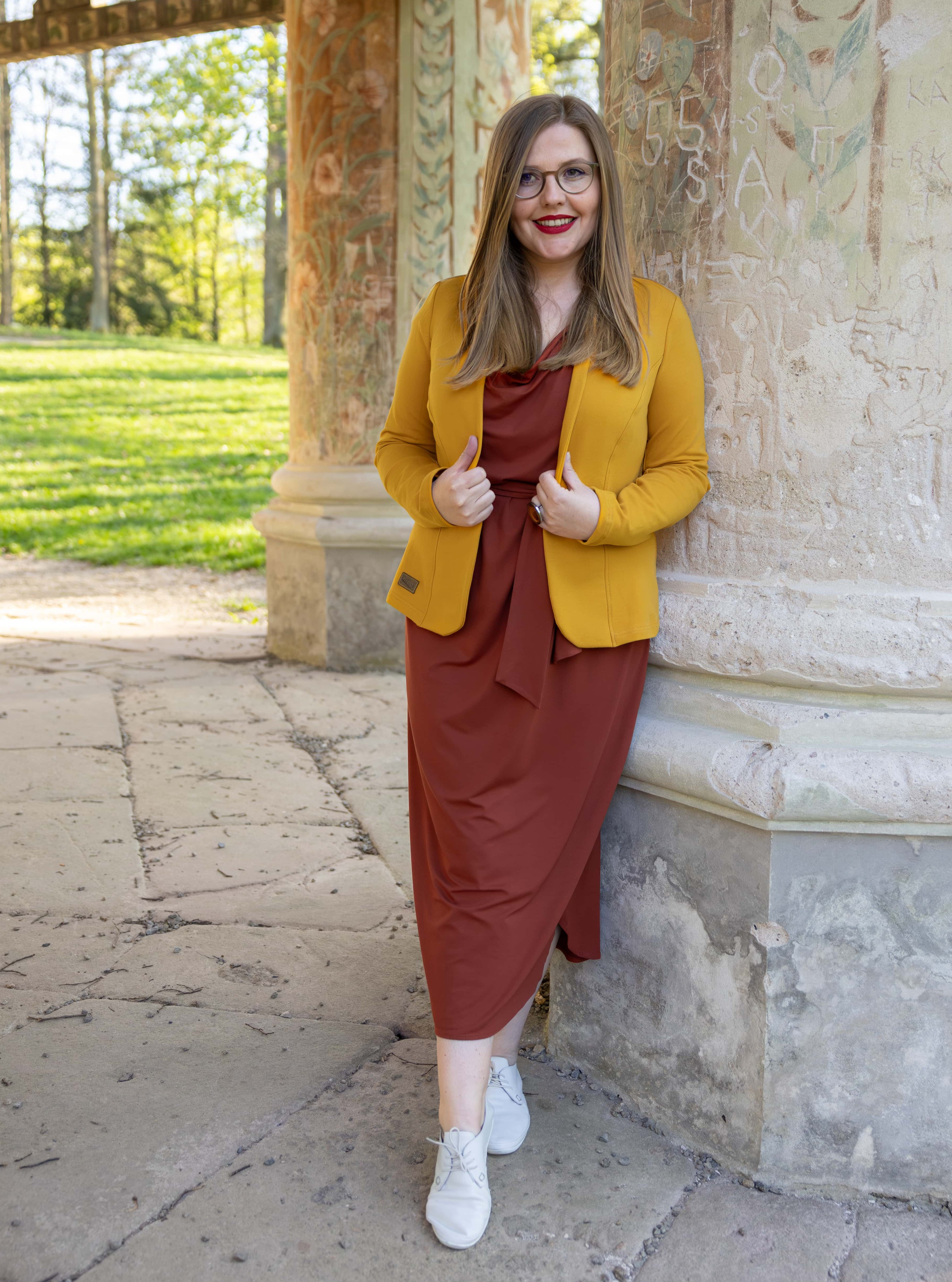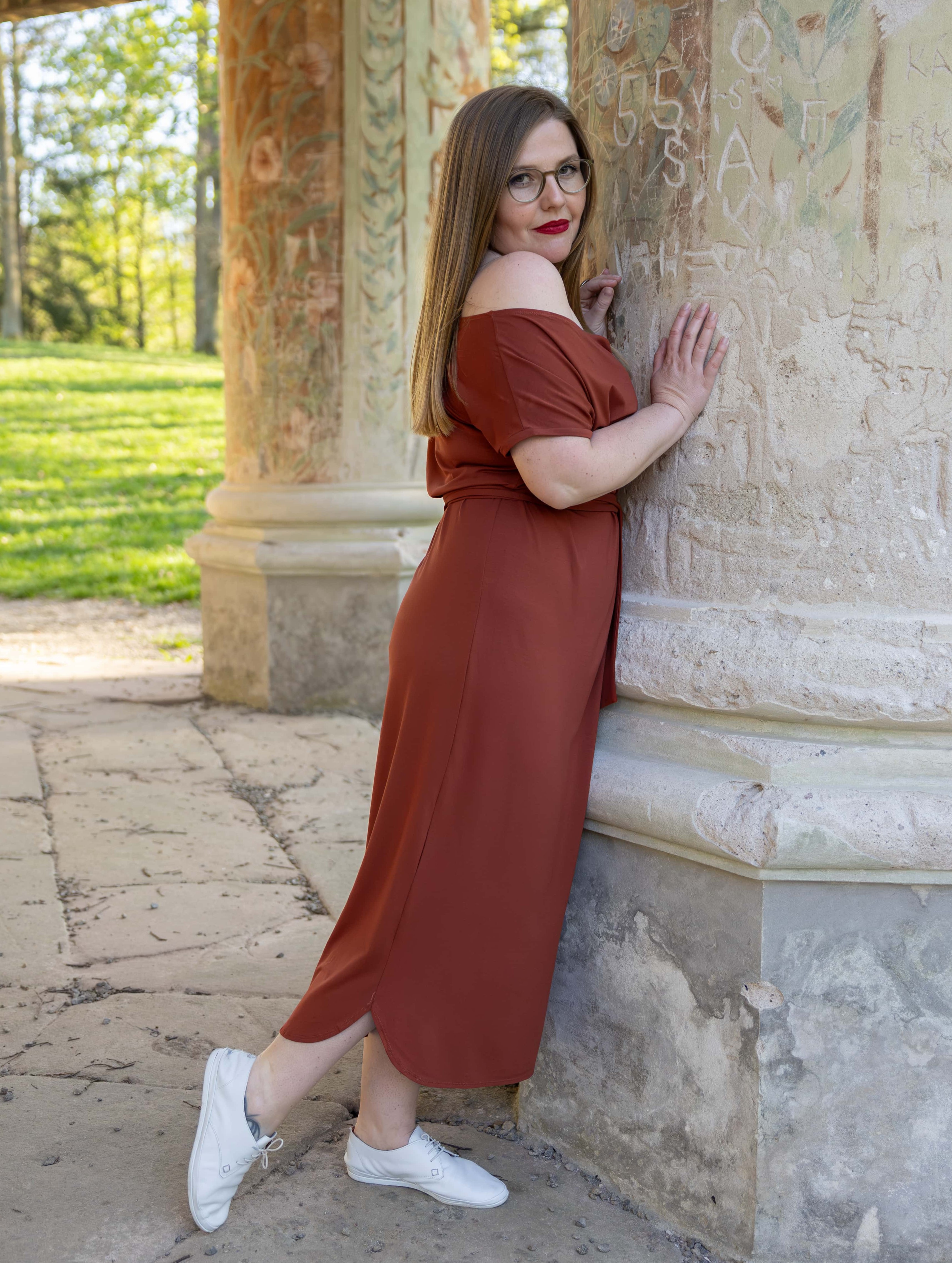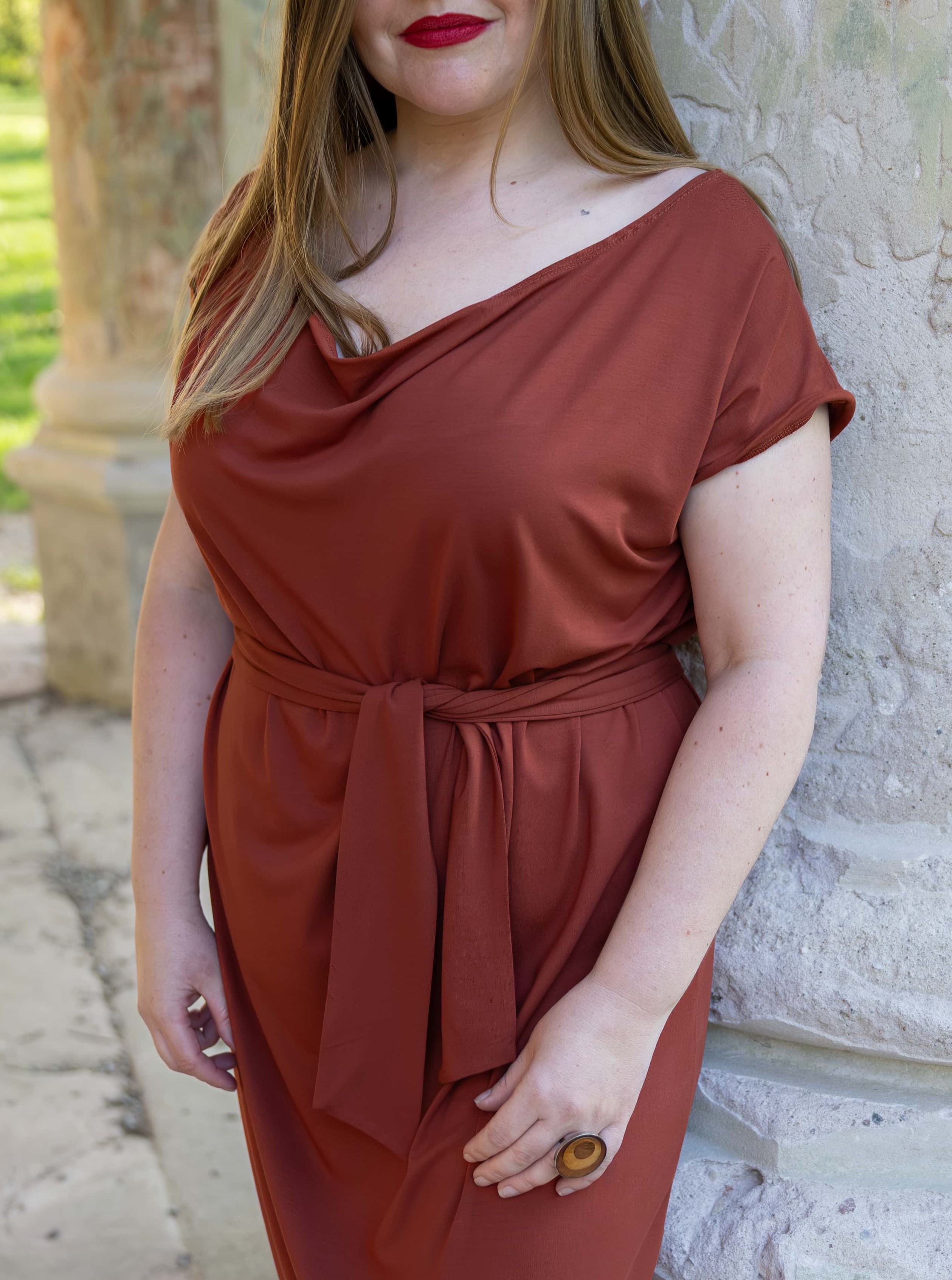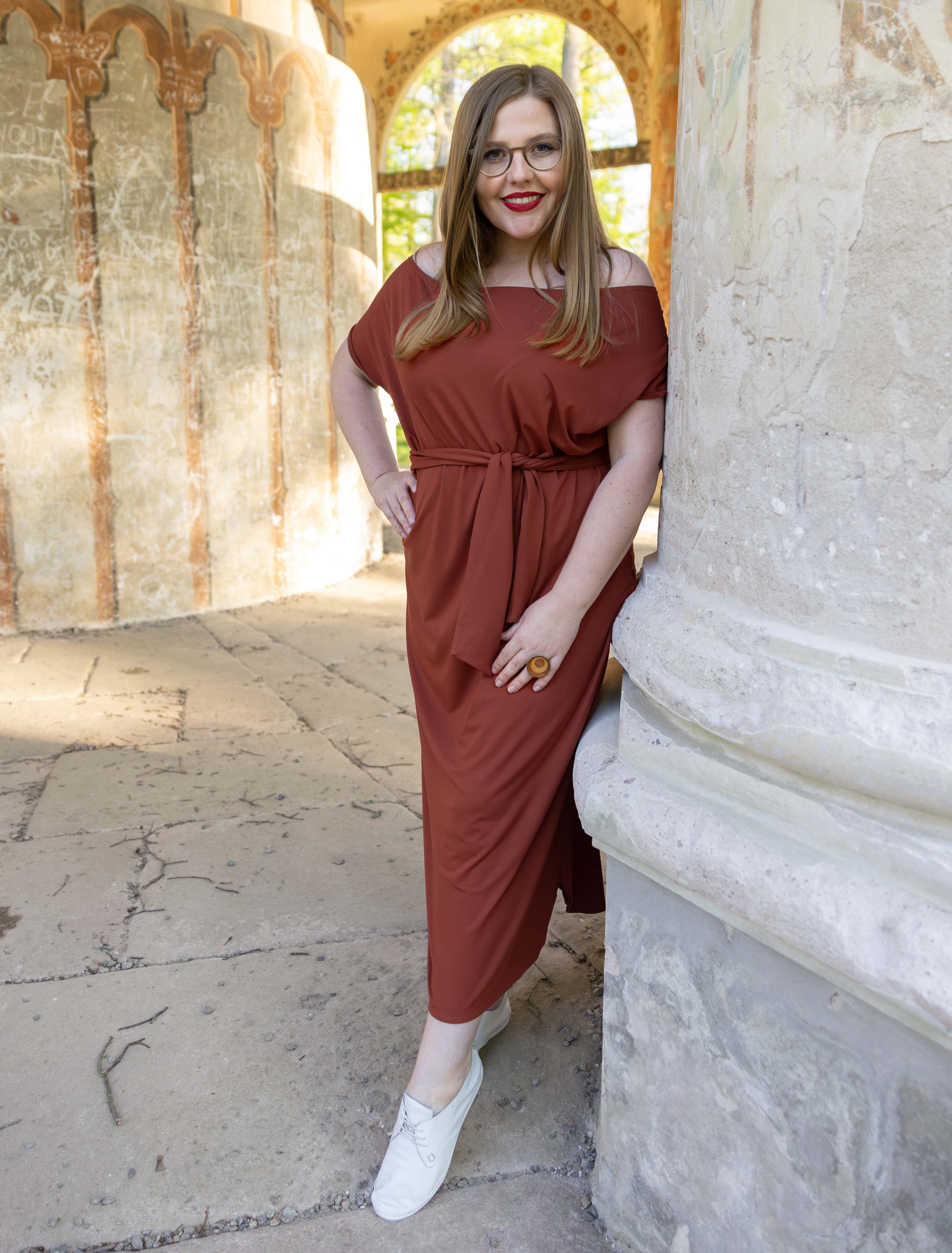 • Siluetu zvýrazníte širším páskem ze stejného materiálu. Díky splývavé a pružné viskóze nikde nevznikne zbytečný objem, látka se krásně přizpůsobí postavě a ukáže jen to, co chcete.