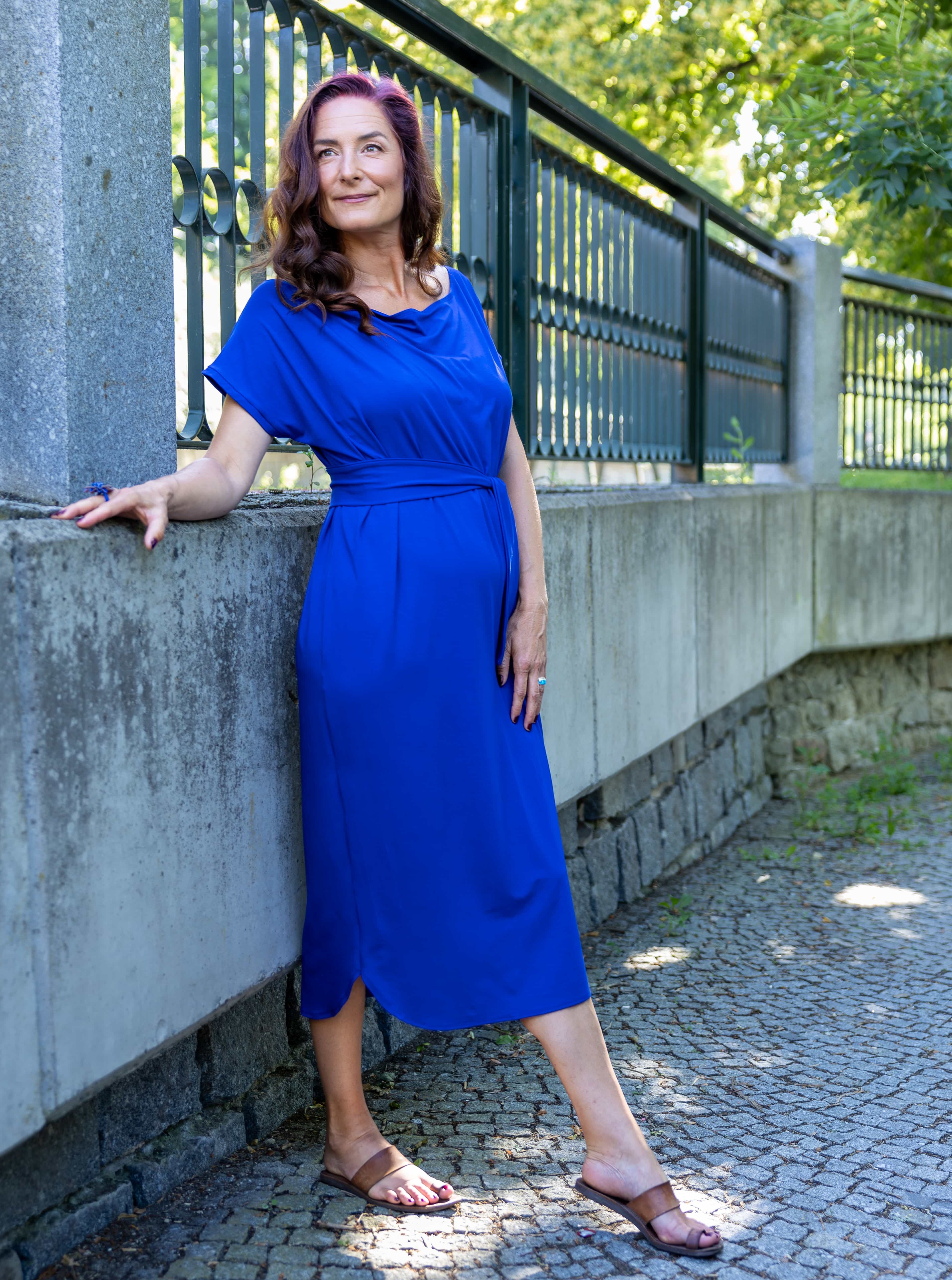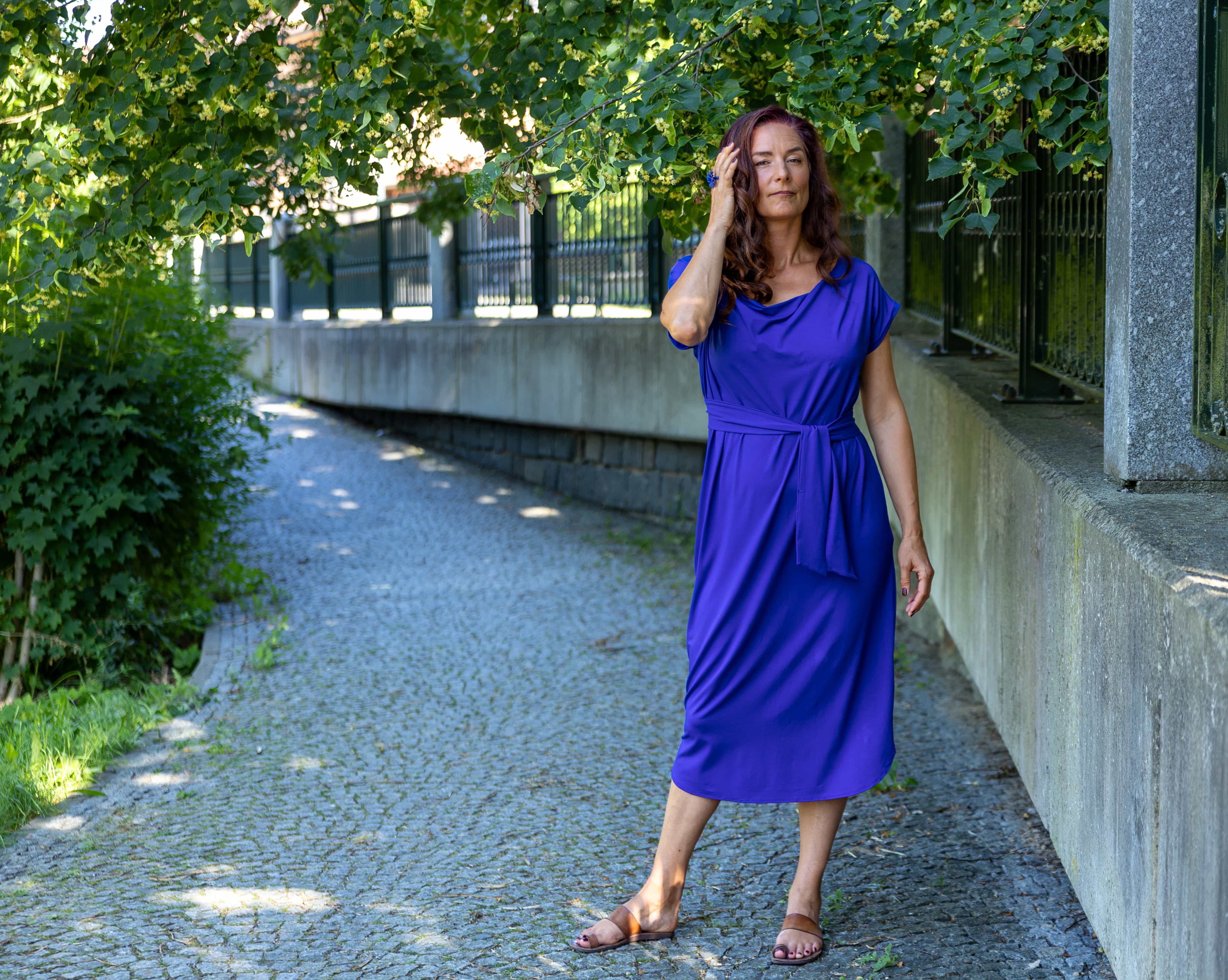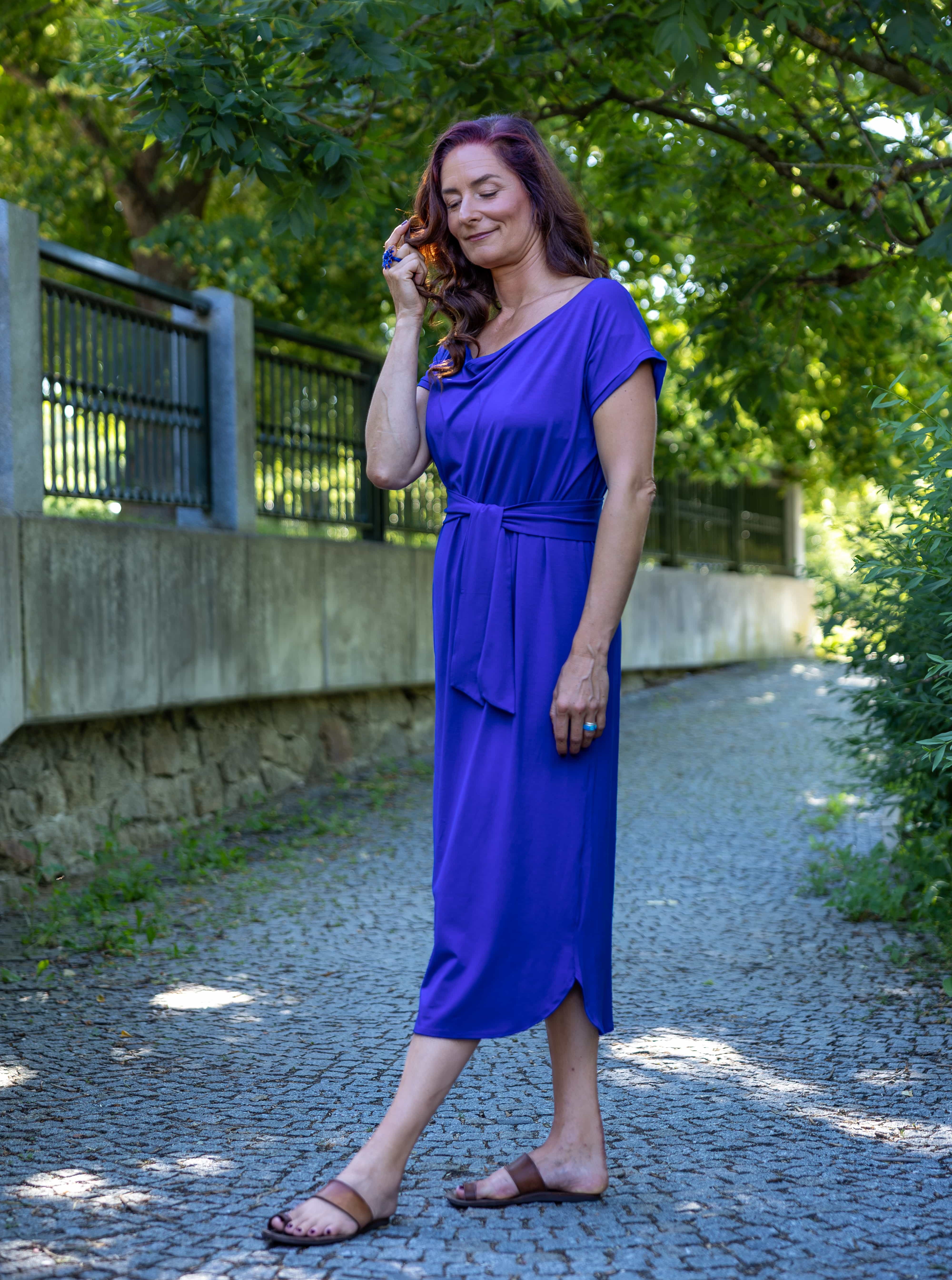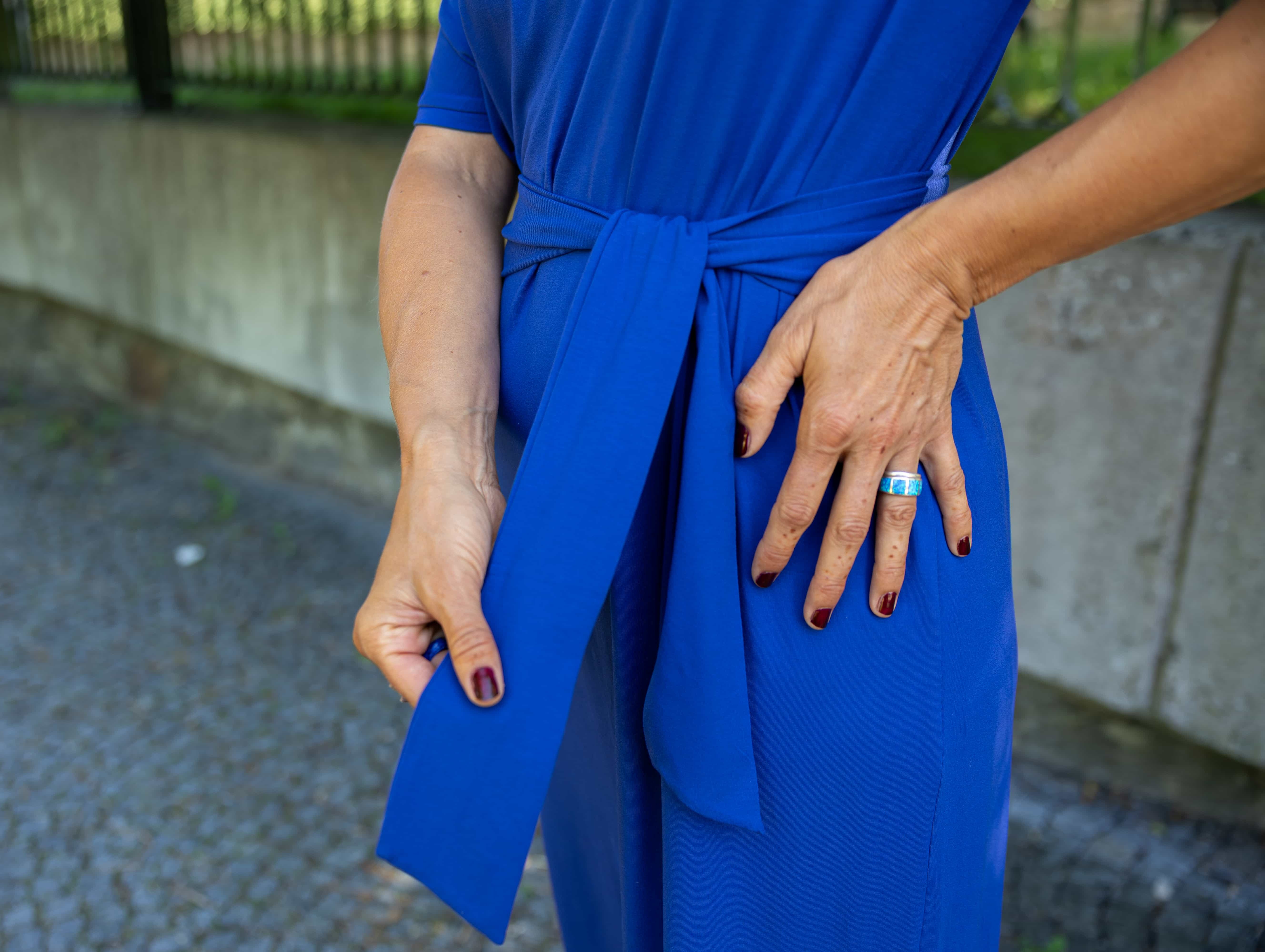 • Siluetu zvýrazníte širším páskem ze stejného materiálu. Díky splývavé a pružné viskóze nikde nevznikne zbytečný objem, látka se krásně přizpůsobí postavě a ukáže jen to, co chcete.