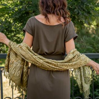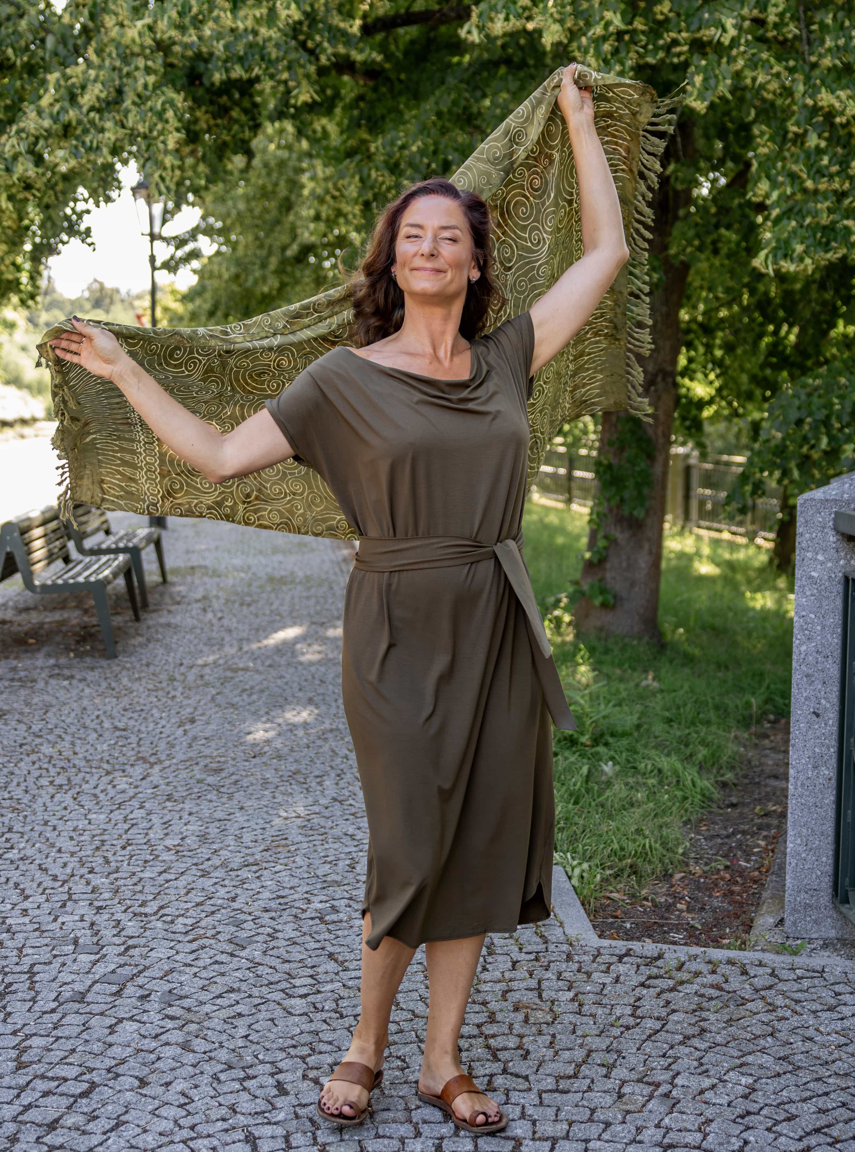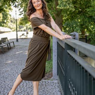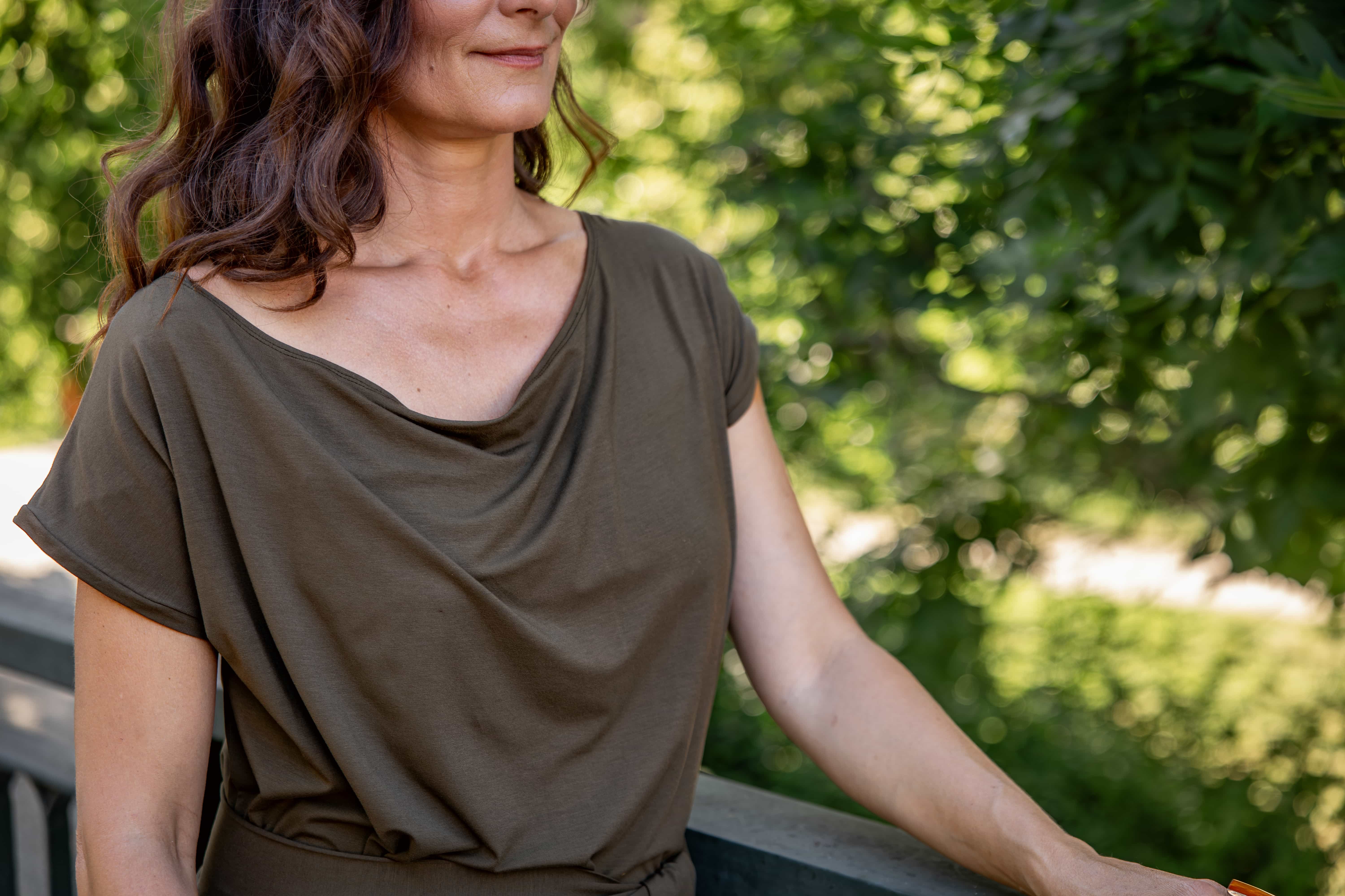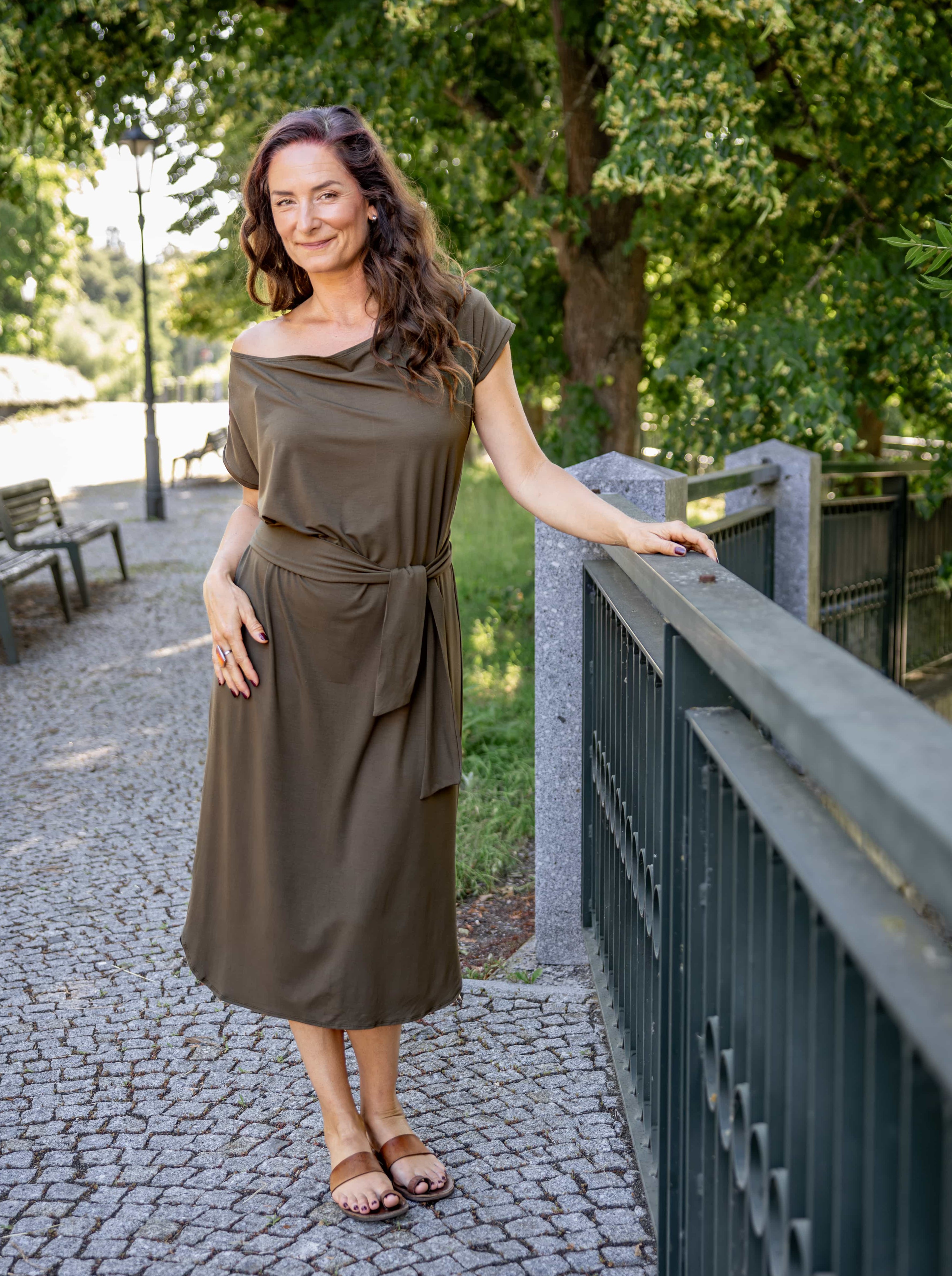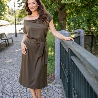 • Siluetu zvýrazníte širším páskem ze stejného materiálu. Díky splývavé a pružné viskóze nikde nevznikne zbytečný objem, látka se krásně přizpůsobí postavě a ukáže jen to, co chcete.