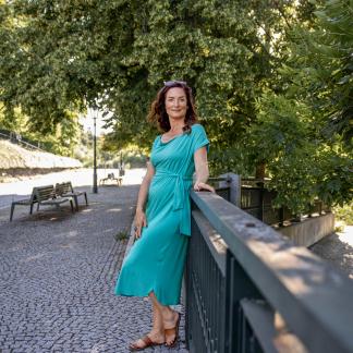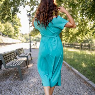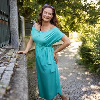• Siluetu zvýrazníte širším páskem ze stejného materiálu. Díky splývavé a pružné viskóze nikde nevznikne zbytečný objem, látka se krásně přizpůsobí postavě a ukáže jen to, co chcete.
