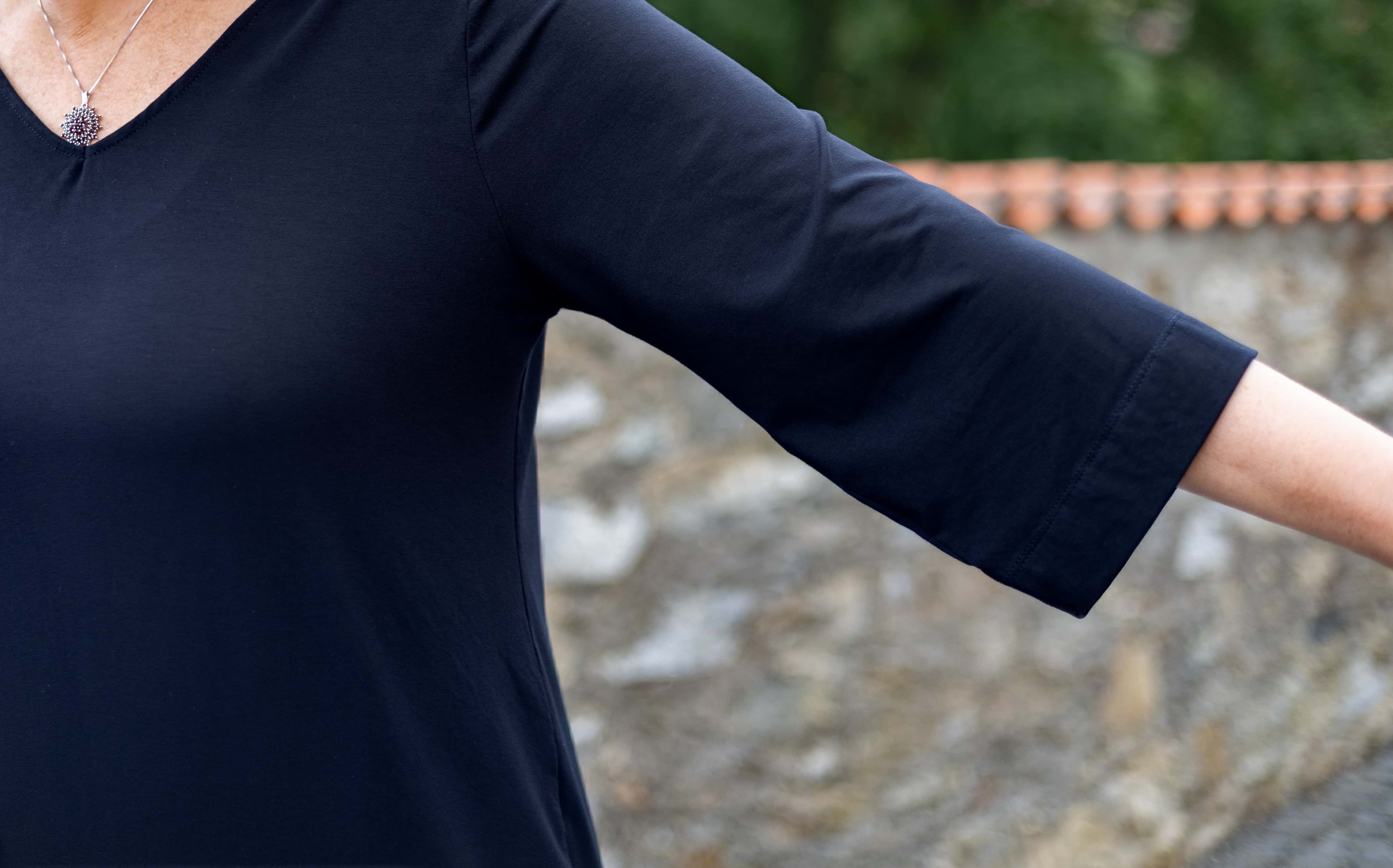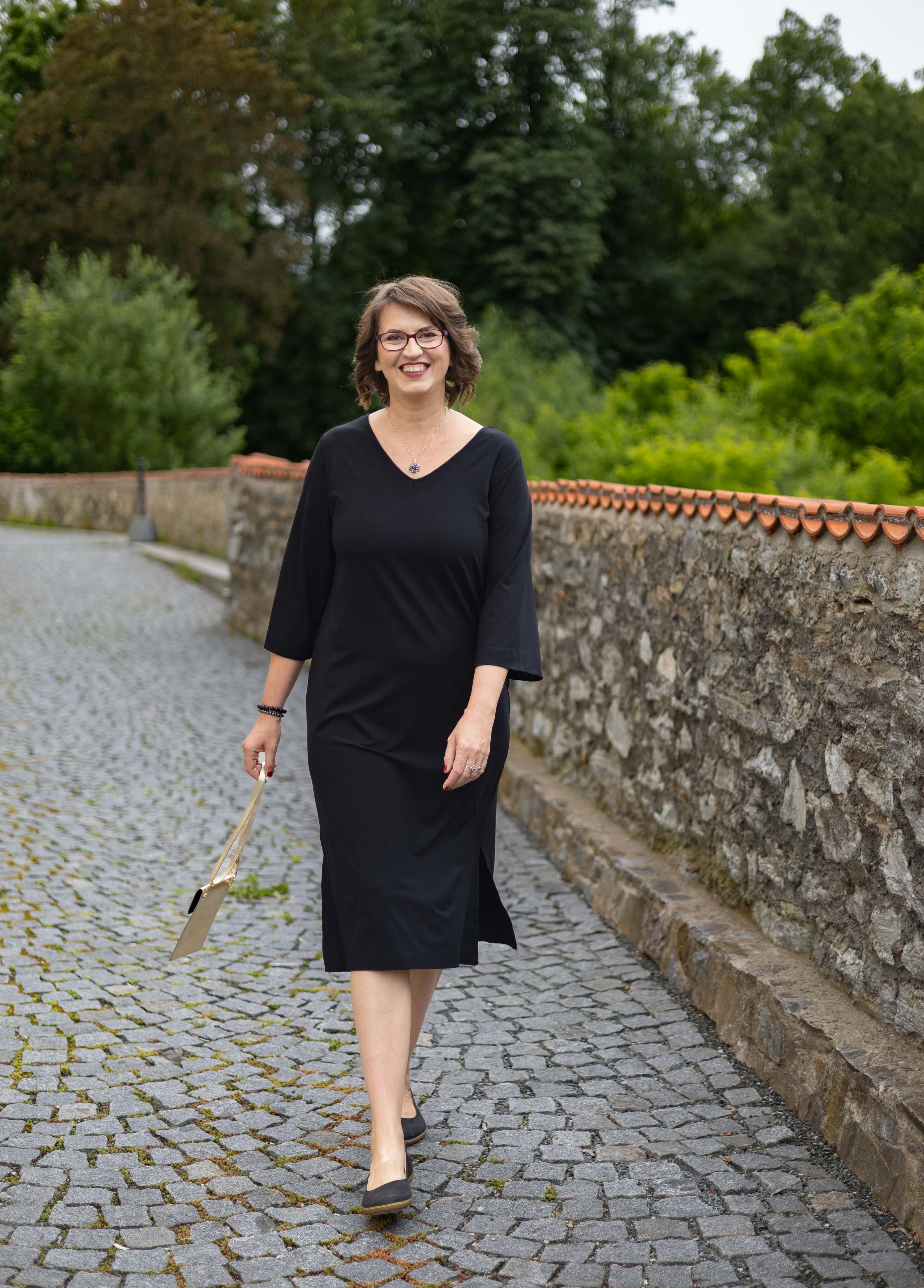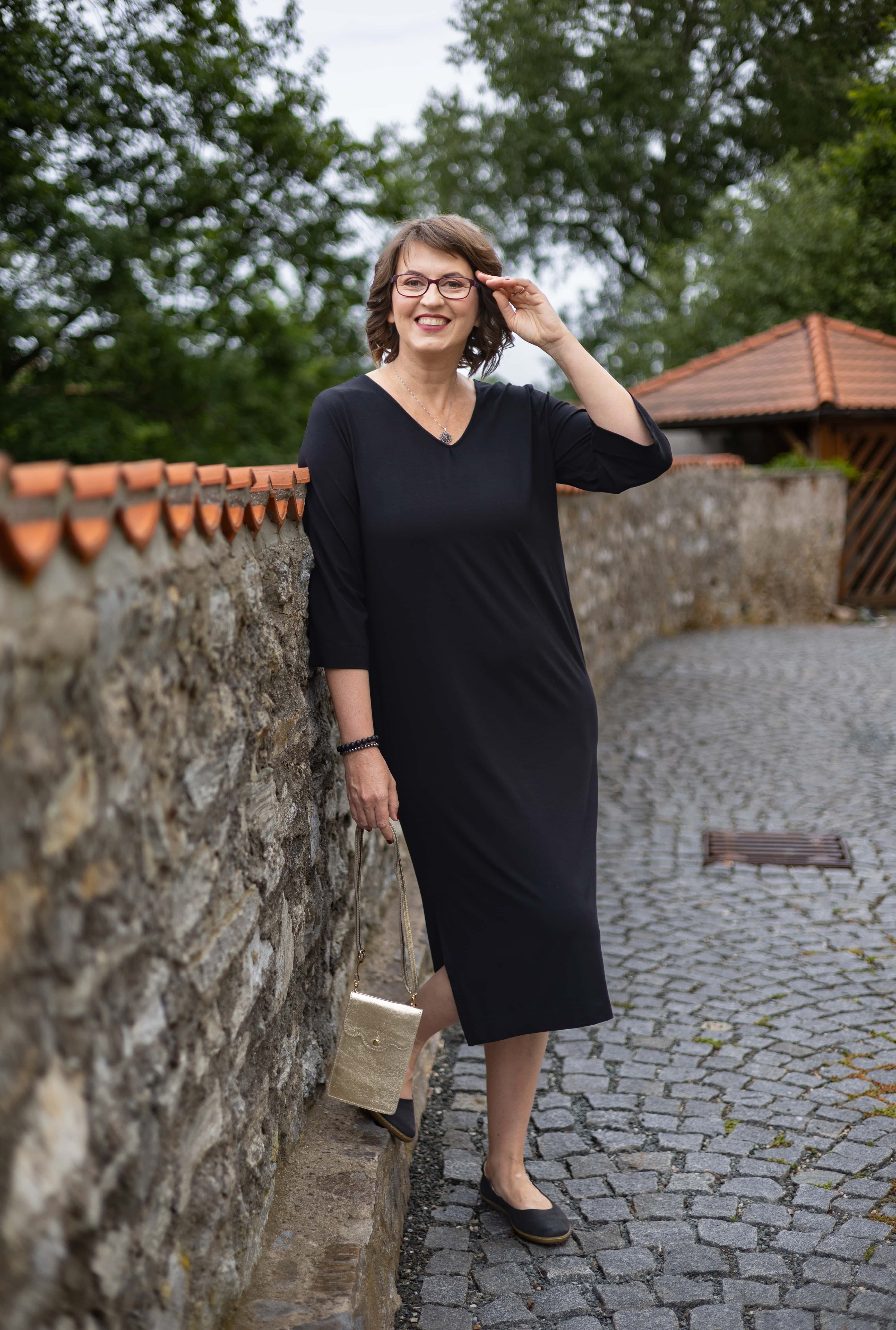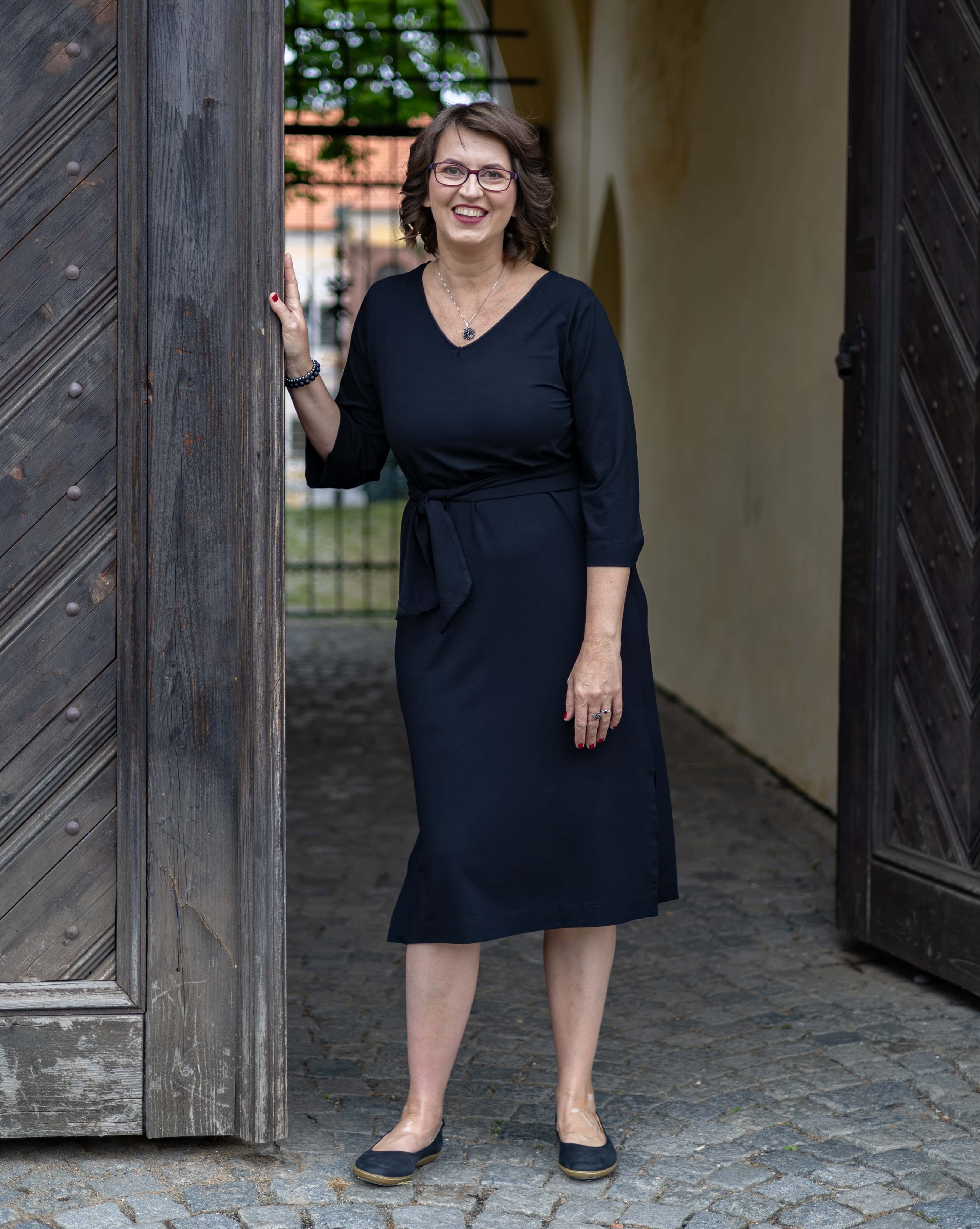 • Siluetu zvýrazníte širším černým páskem ze stejného materiálu. Díky splývavé viskóze nikde nevznikne zbytečný objem, látka se krásně přizpůsobí postavě a ukáže jen to, co chcete.