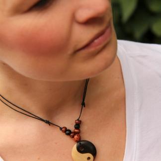 Náhrdelník vyrobený z lehkého tropického dřeva s originálním designem v přírodním tmavěhnědém/světle žlutém odstínu.