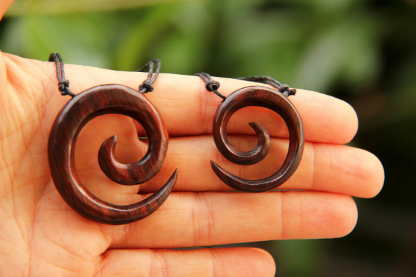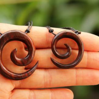 Přírodní šperk ve tvaru spirály, vyrobený z tropického dřeva, kterému v Indonésii říkají "sono wood".