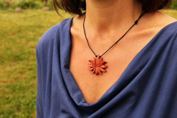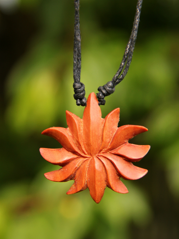 Dokonale ručně zhotovený dřevěný náhrdelník ve tvaru lotosu. Díky klouzavému uzlíku lze náhrdelník přizpůsobit požadované délce. Vyrobeno z lehkého a kvalitního tropického dřeva, kterému v Indonésii říkají "sawo wood".