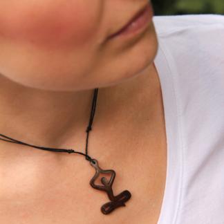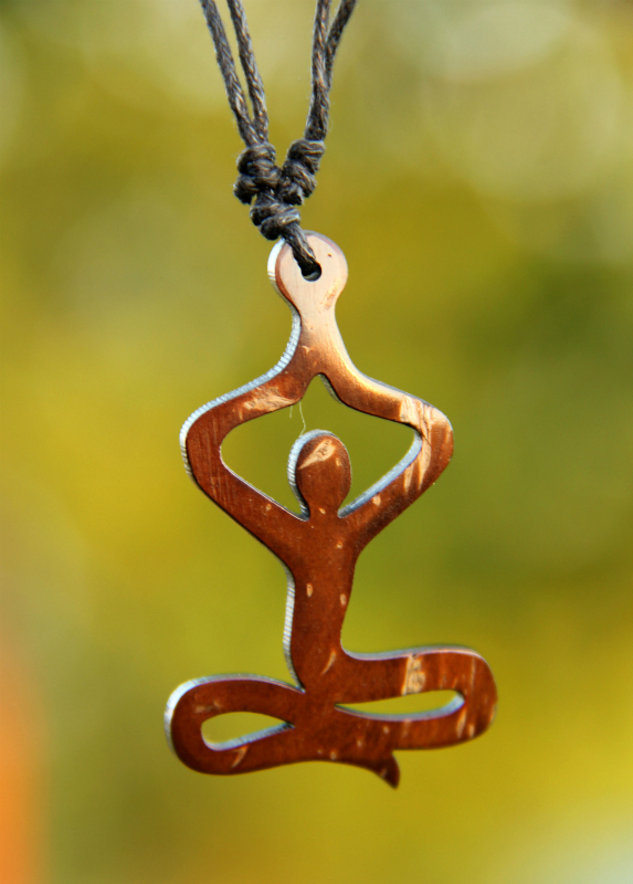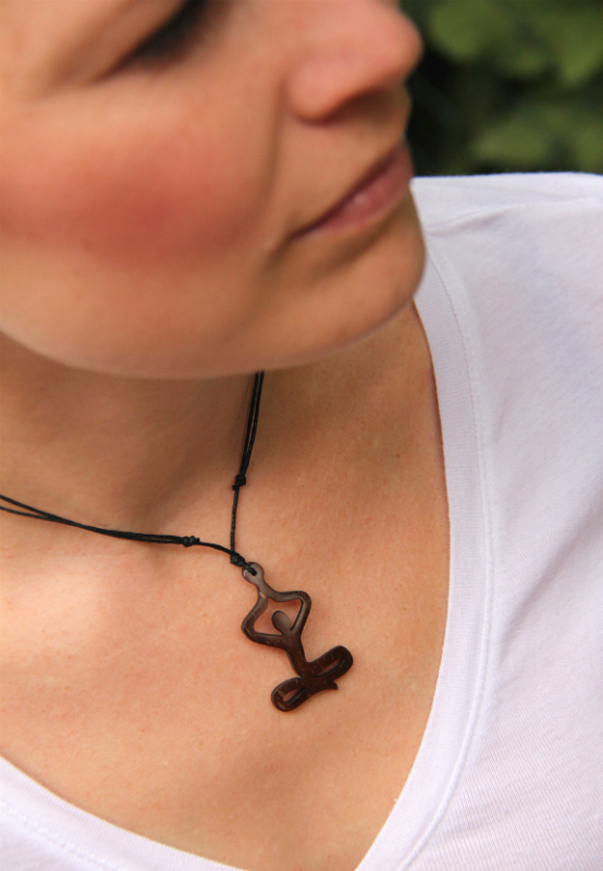 Přírodní přívěsek se symbolem "Love Yoga" vyroben a vyřezán z dřevnaté slupky kokosového ořechu. Tento materiál je velmi tvrdý a odolný. Přívěsek lze díky klouzavým uzlíkům nastavit do požadované délky. Zavěšeno na bavlněné šňůrce.