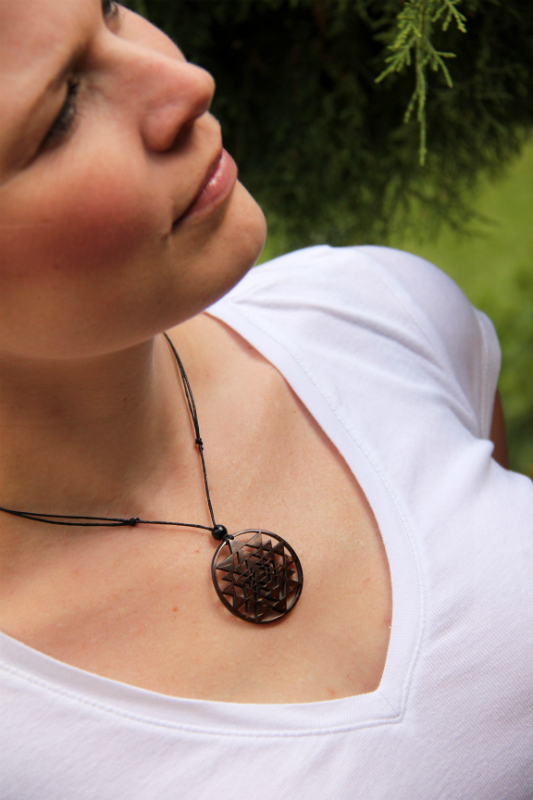 Přírodní přívěsek se symbolem "Šrí Jantra" vyrobený z dřevnaté slupky kokosového ořechu. Tento materiál je velmi tvrdý a odolný. Přívěsek lze díky jezdícím uzlíkům nastavit do požadované délky. Zavěšeno na bavlněné šňůrce.