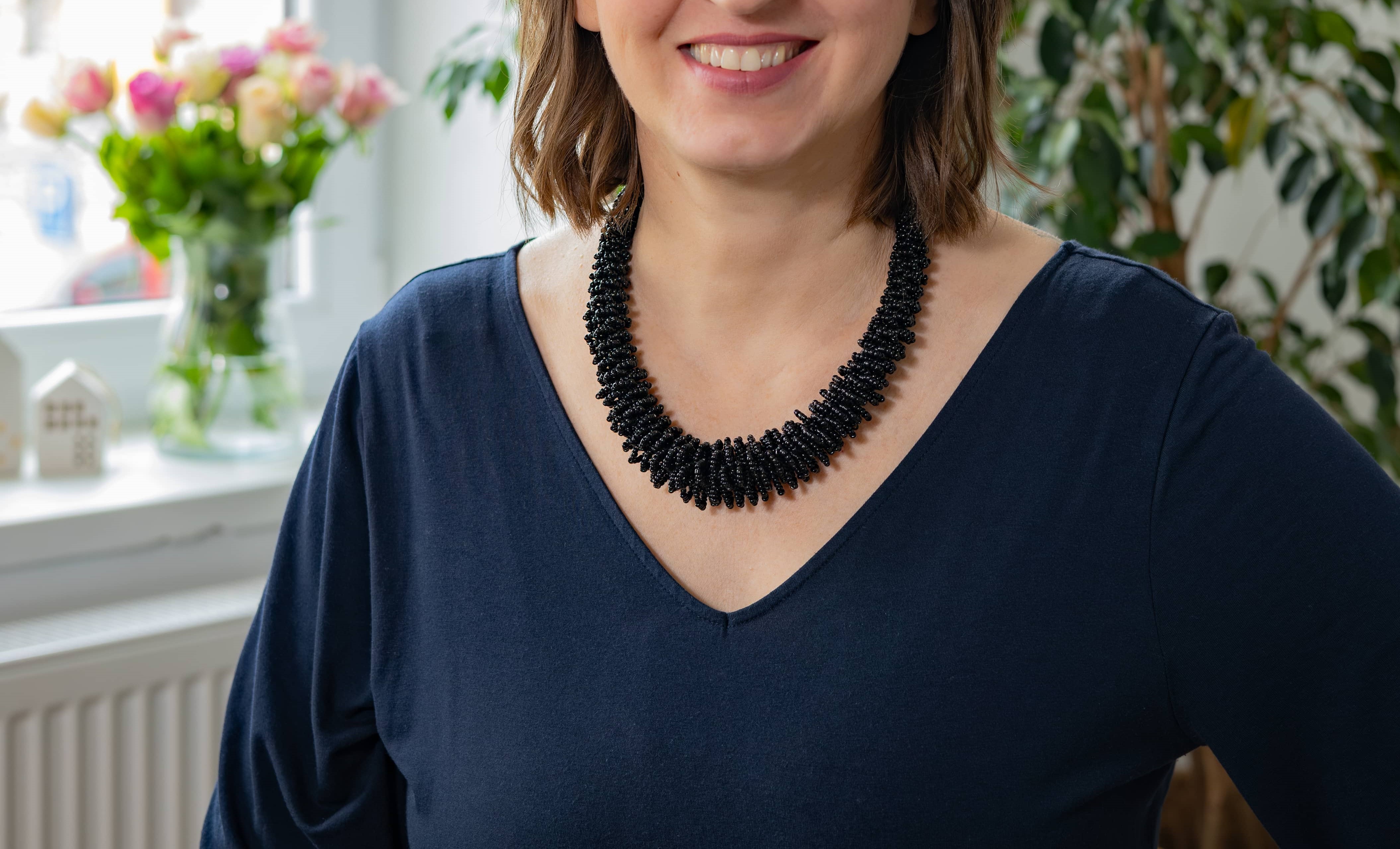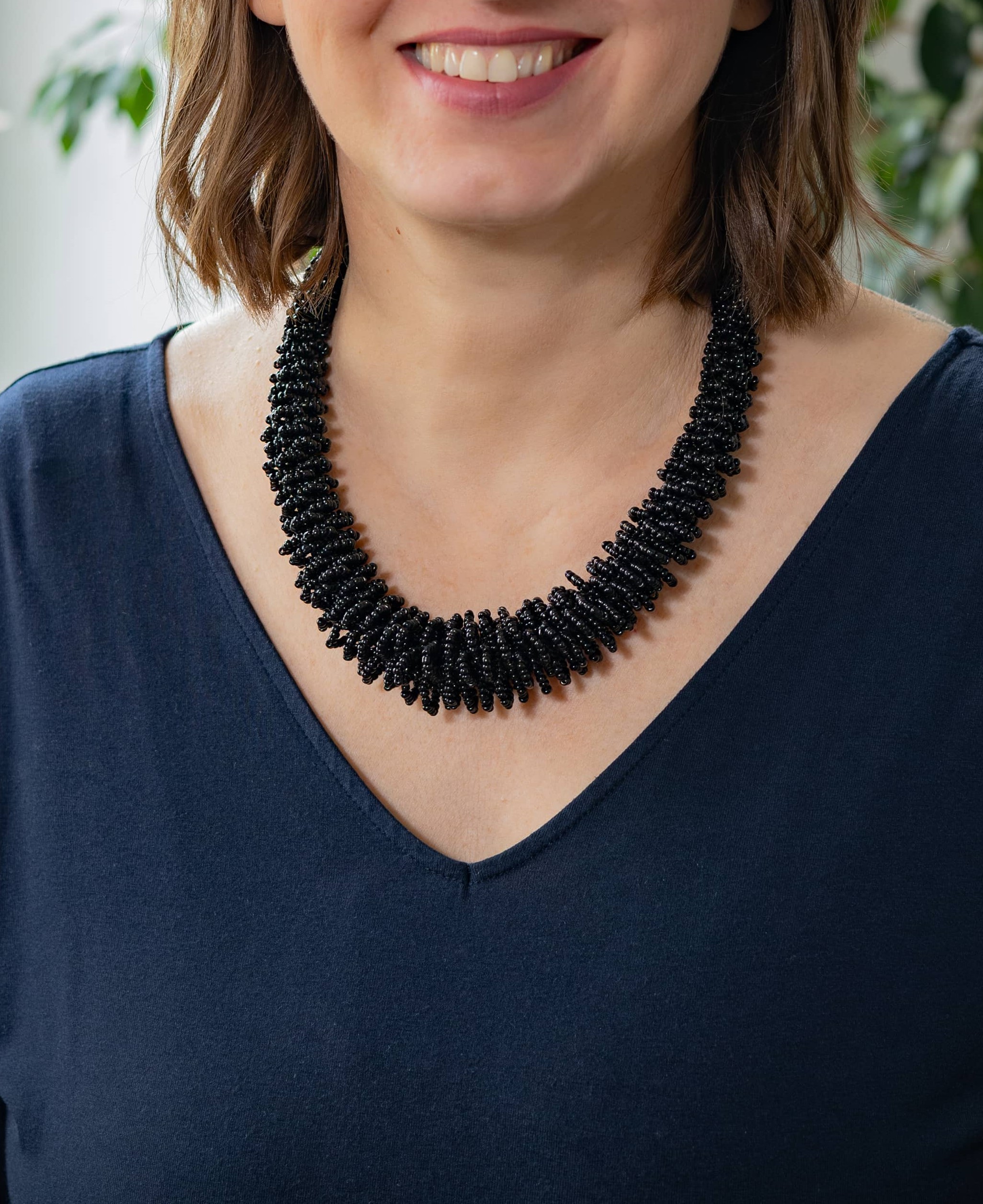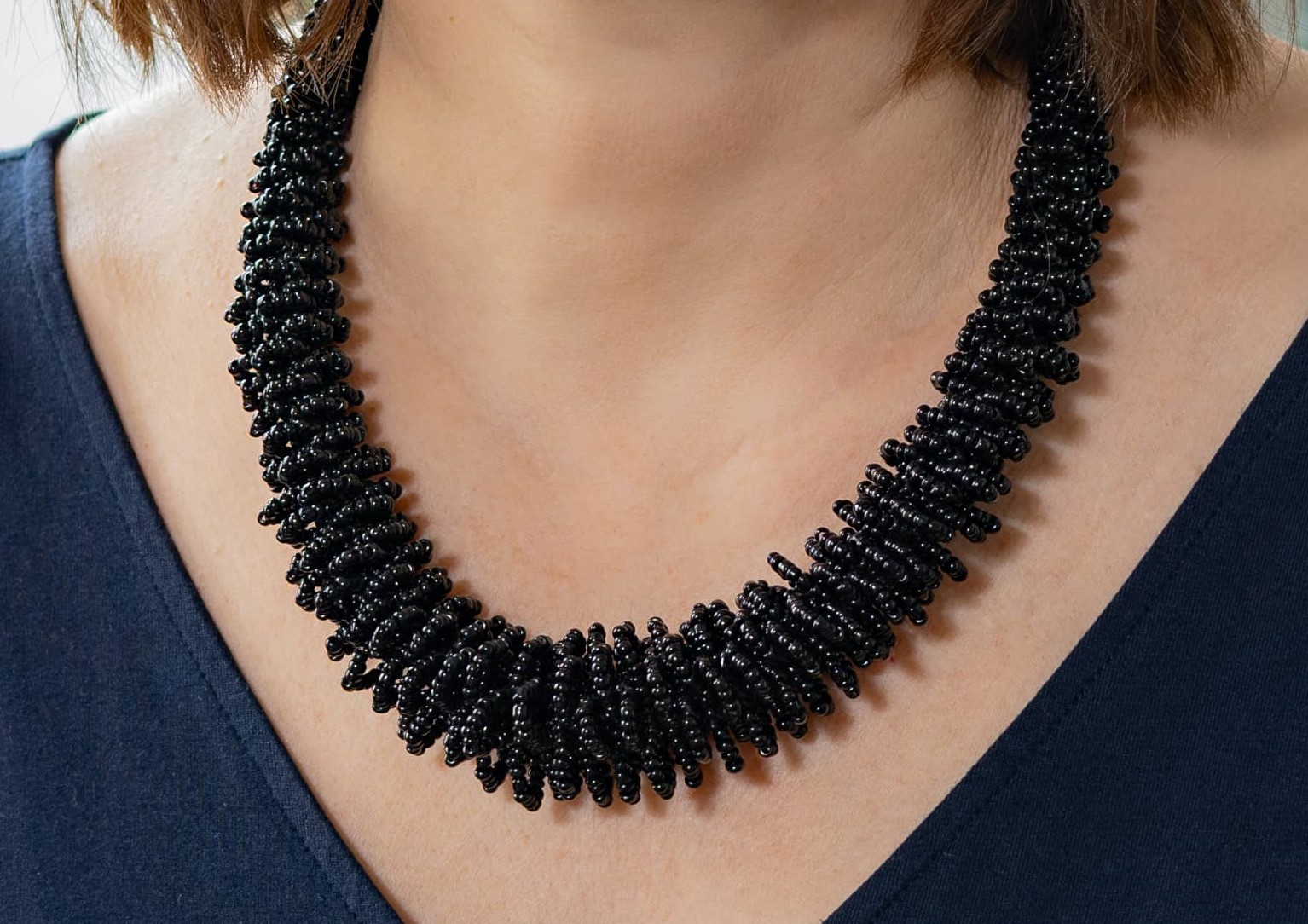 Výrazný korálkový náhrdelník.