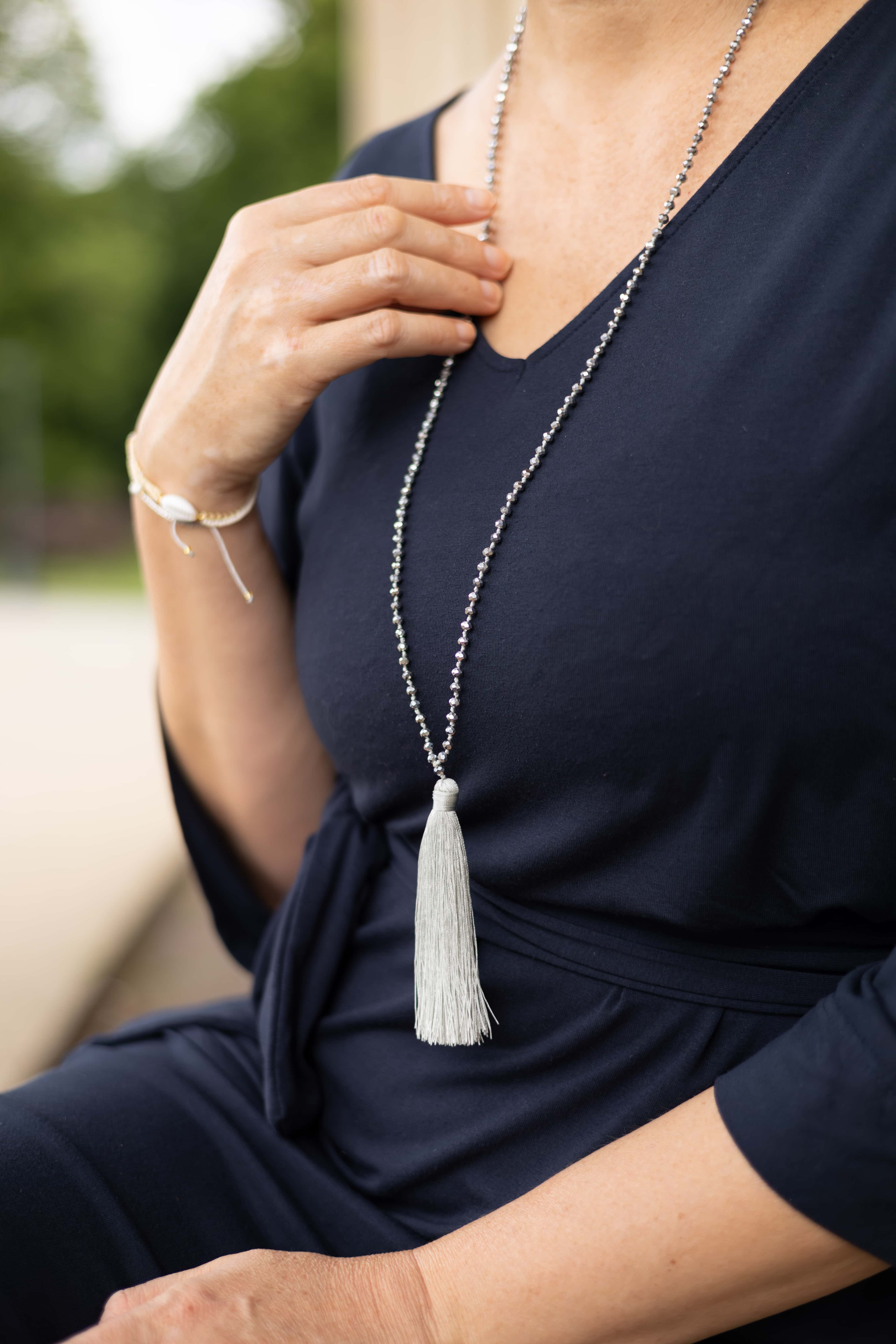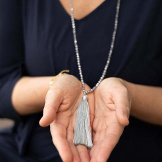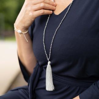 Tento náhrdelník vás okouzlí stříbrnými korálky a šedostříbrným střapcem, který dodává náhrdelníku jemný a stylový vzhled.