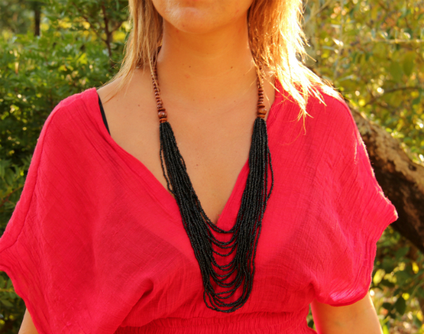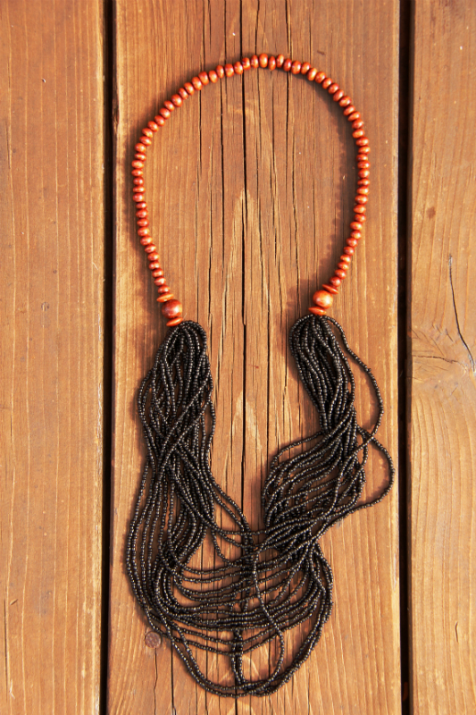 Jednoduchý náhrdelník s kombinací dřevěných a skleněných korálků. Vhodné pro běžné nošení i speciální příležitosti. Bez zapínání a kovových komponentů.