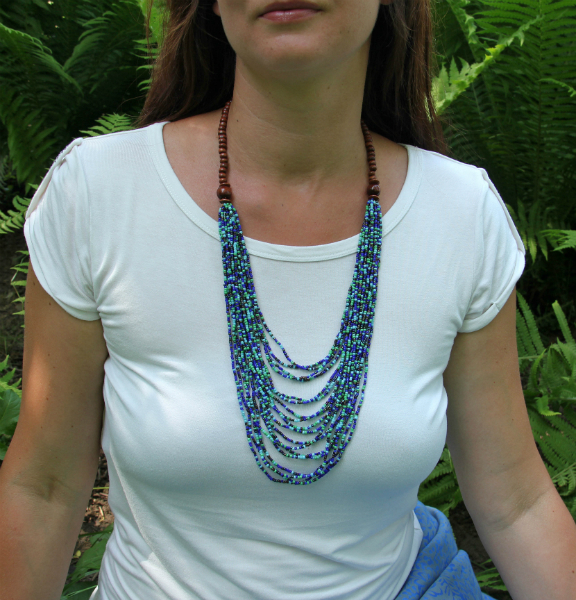 Jednoduchý náhrdelník s kombinací dřevěných a skleněných korálků. Vhodné pro běžné nošení i speciální příležitosti. Bez zapínání a kovových komponentů.