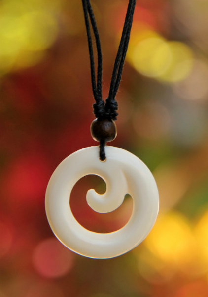 Dokonale ručně zhotovený symbolický kostěný přívešek. Díky klouzavému uzlíku lze náhrdelník přizpůsobit každému výstřihu. Vyrobeno z kosti vodního buvola.