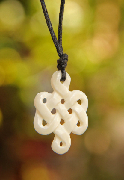 Dokonale ručně zhotovený symbolický kostěný přívešek. Díky klouzavému uzlíku lze náhrdelník přizpůsobit každému výstřihu. Vyrobeno z kosti vodního buvola.