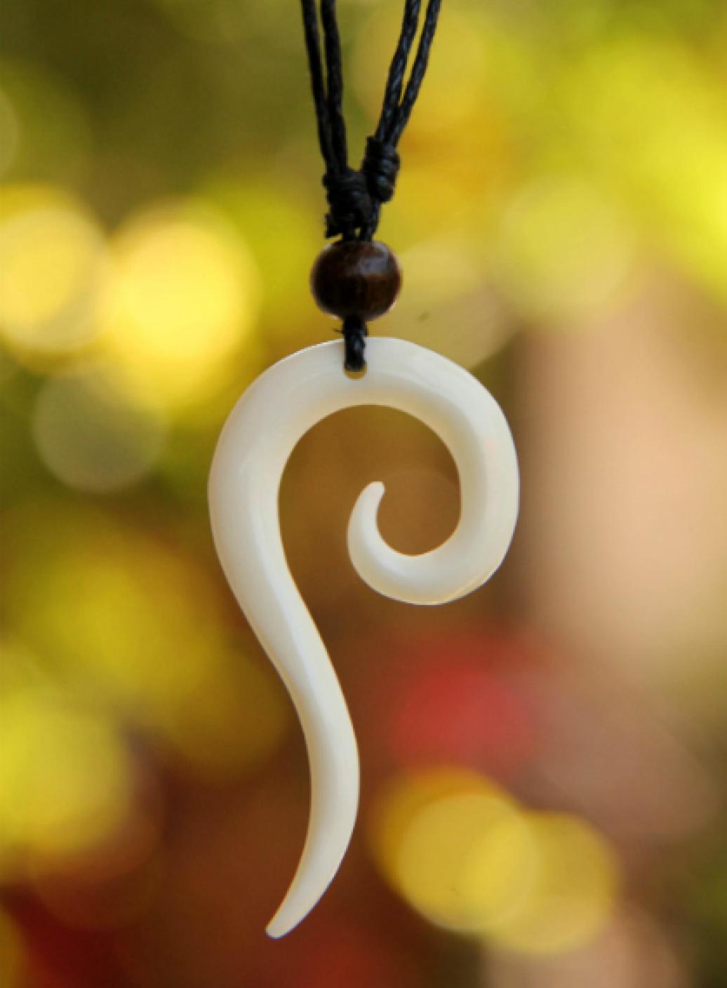 Dokonale ručně zhotovený symbolický kostěný přívešek. Díky klouzavému uzlíku lze náhrdelník přizpůsobit každému výstřihu. Vyrobeno z kosti vodního buvola.