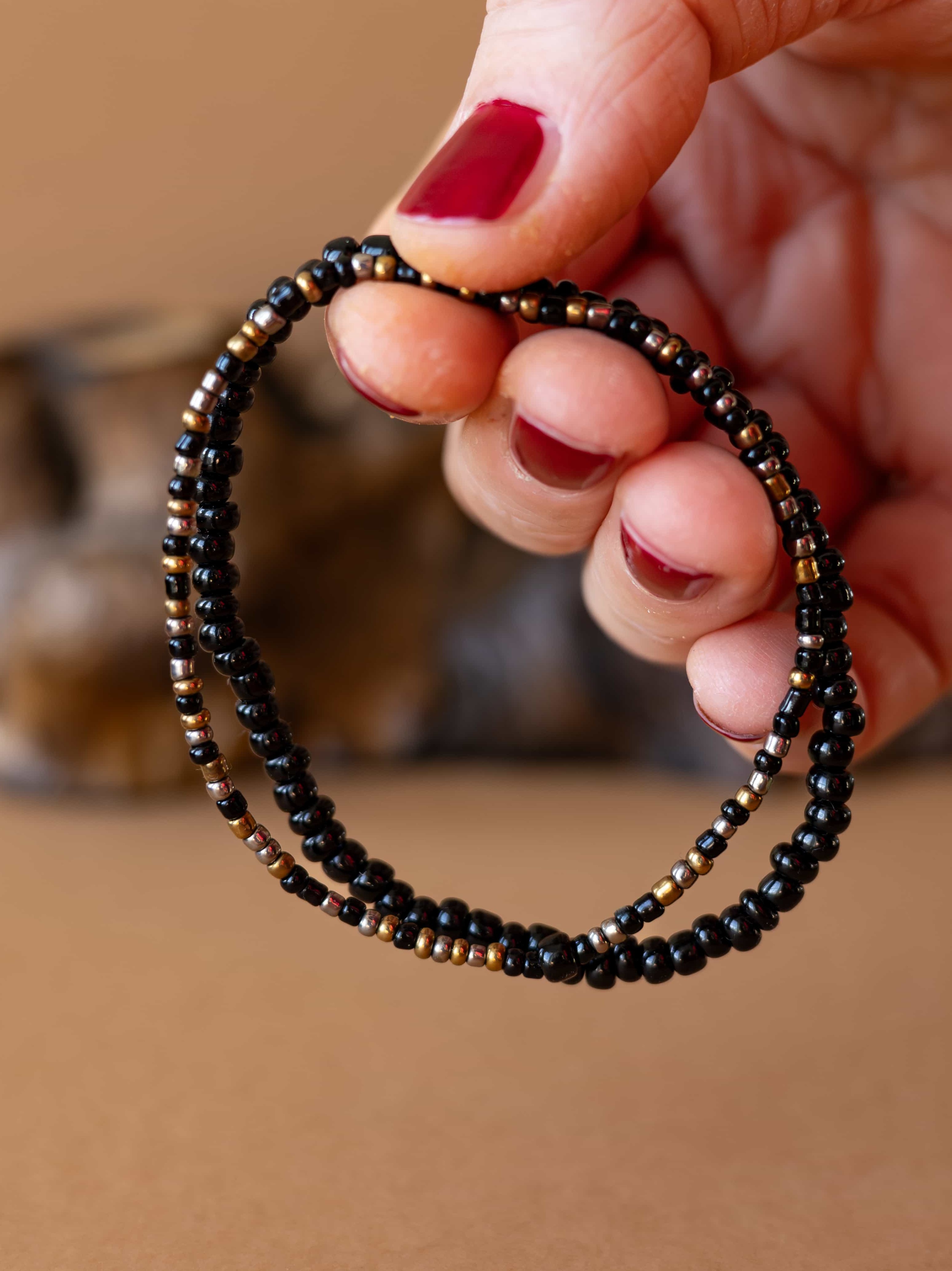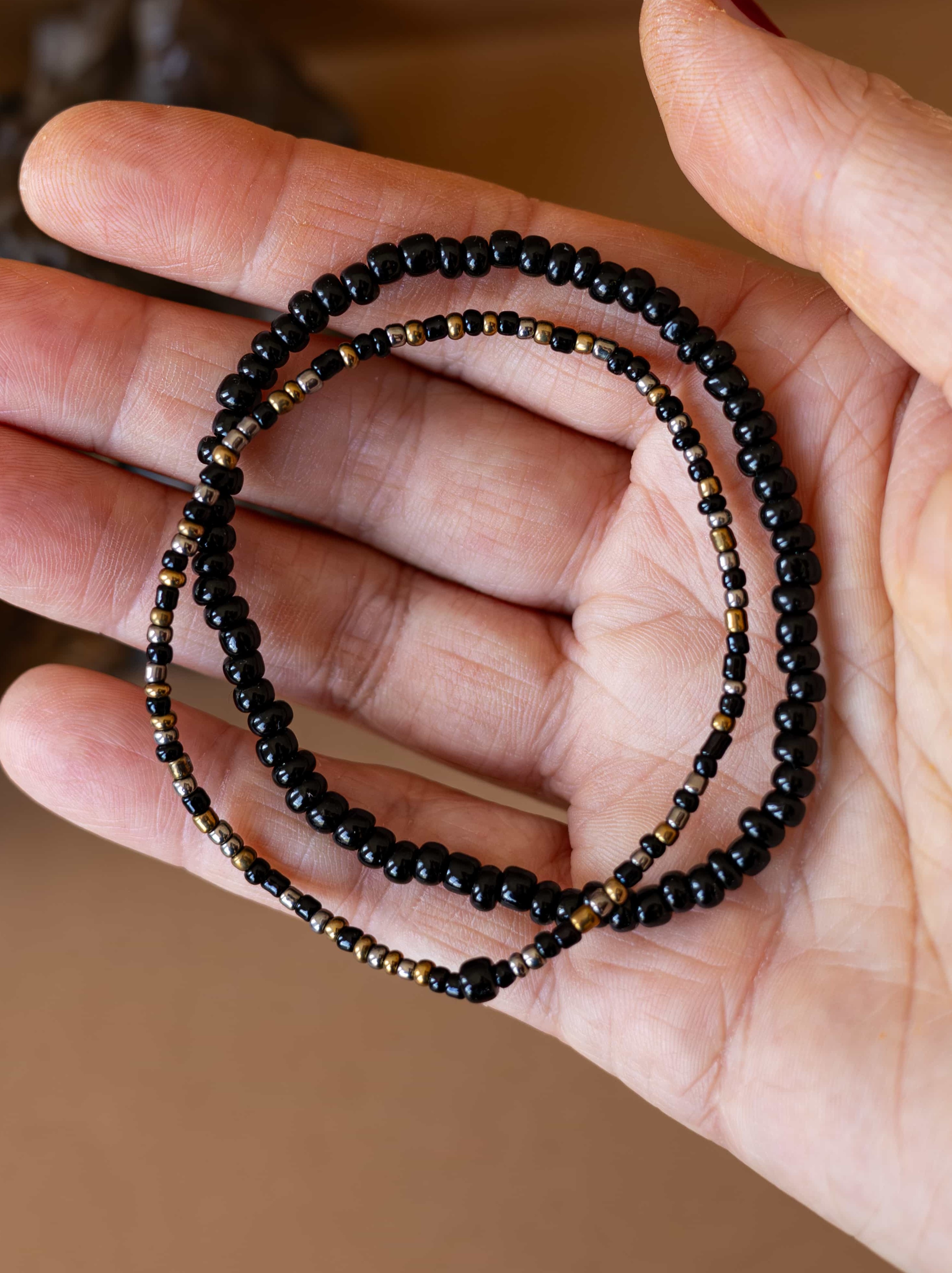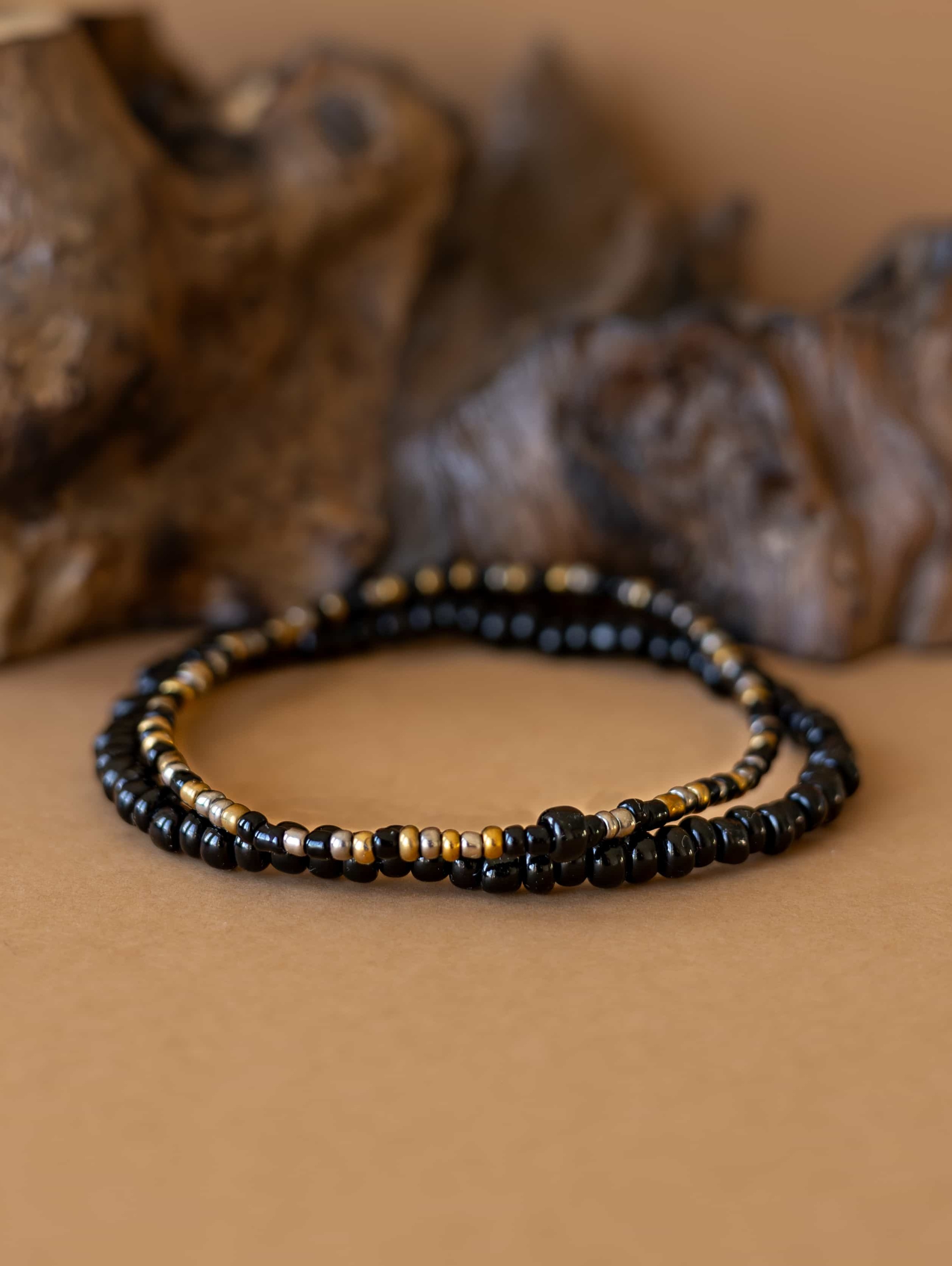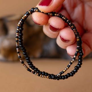 Černé rokajl korálky dodávají náramku hloubku a univerzální eleganci.