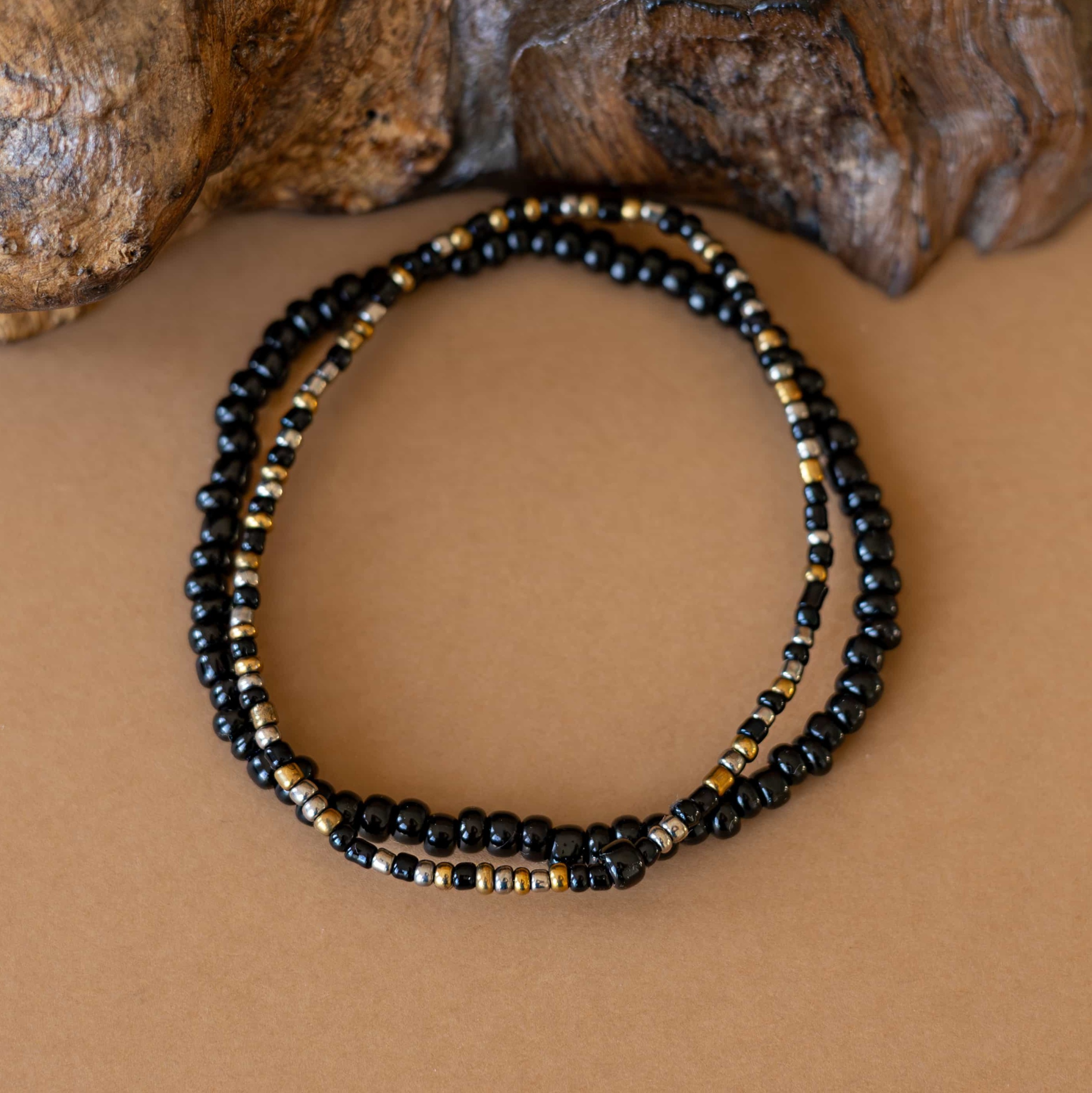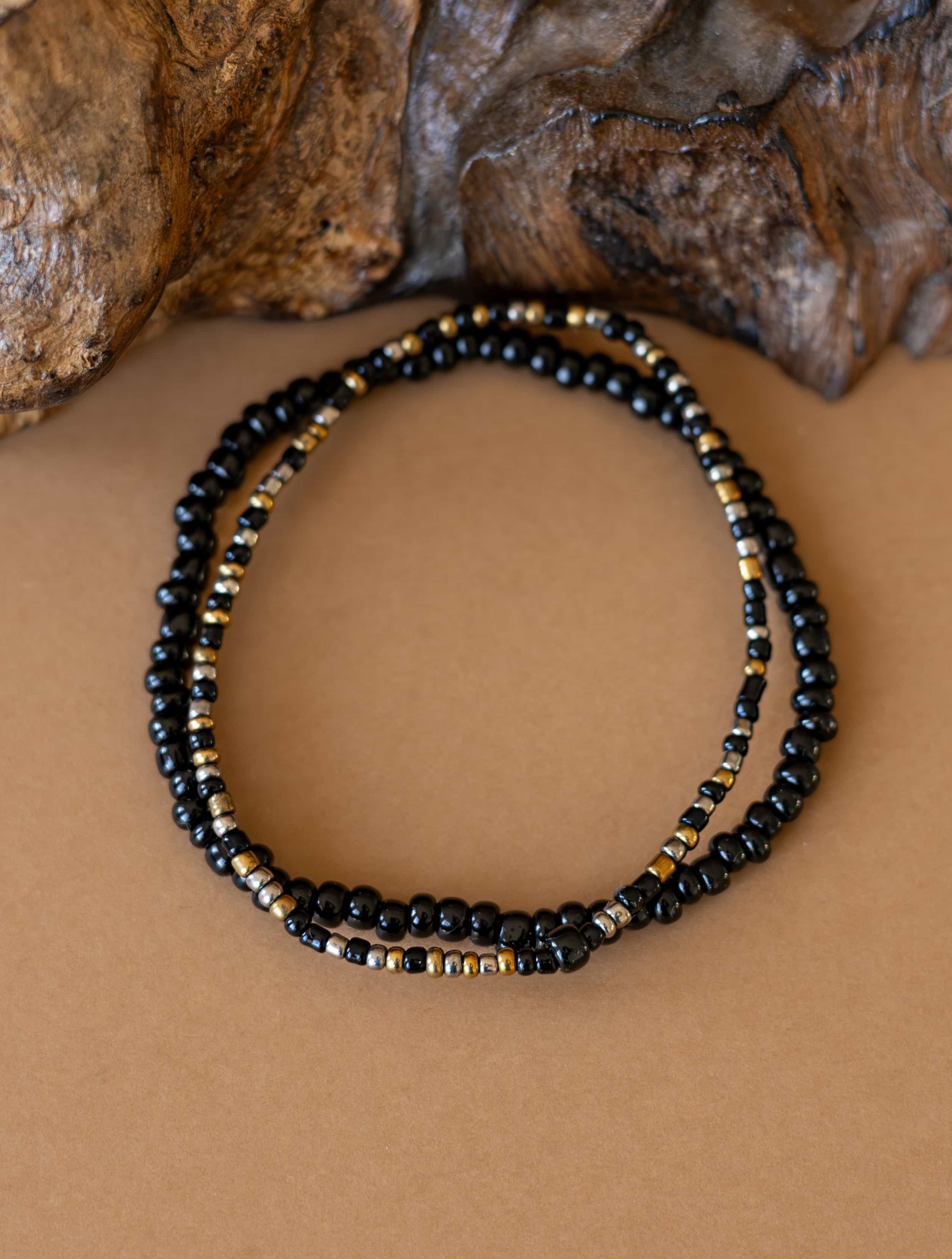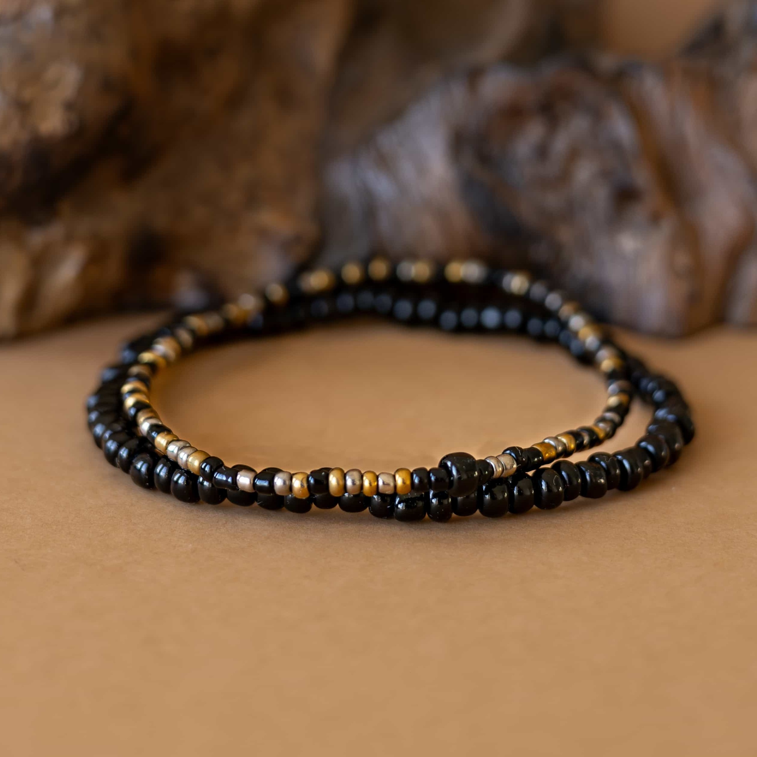 Černé rokajl korálky dodávají náramku hloubku a univerzální eleganci.