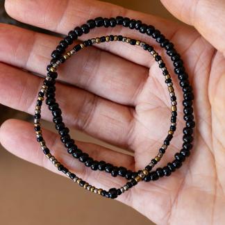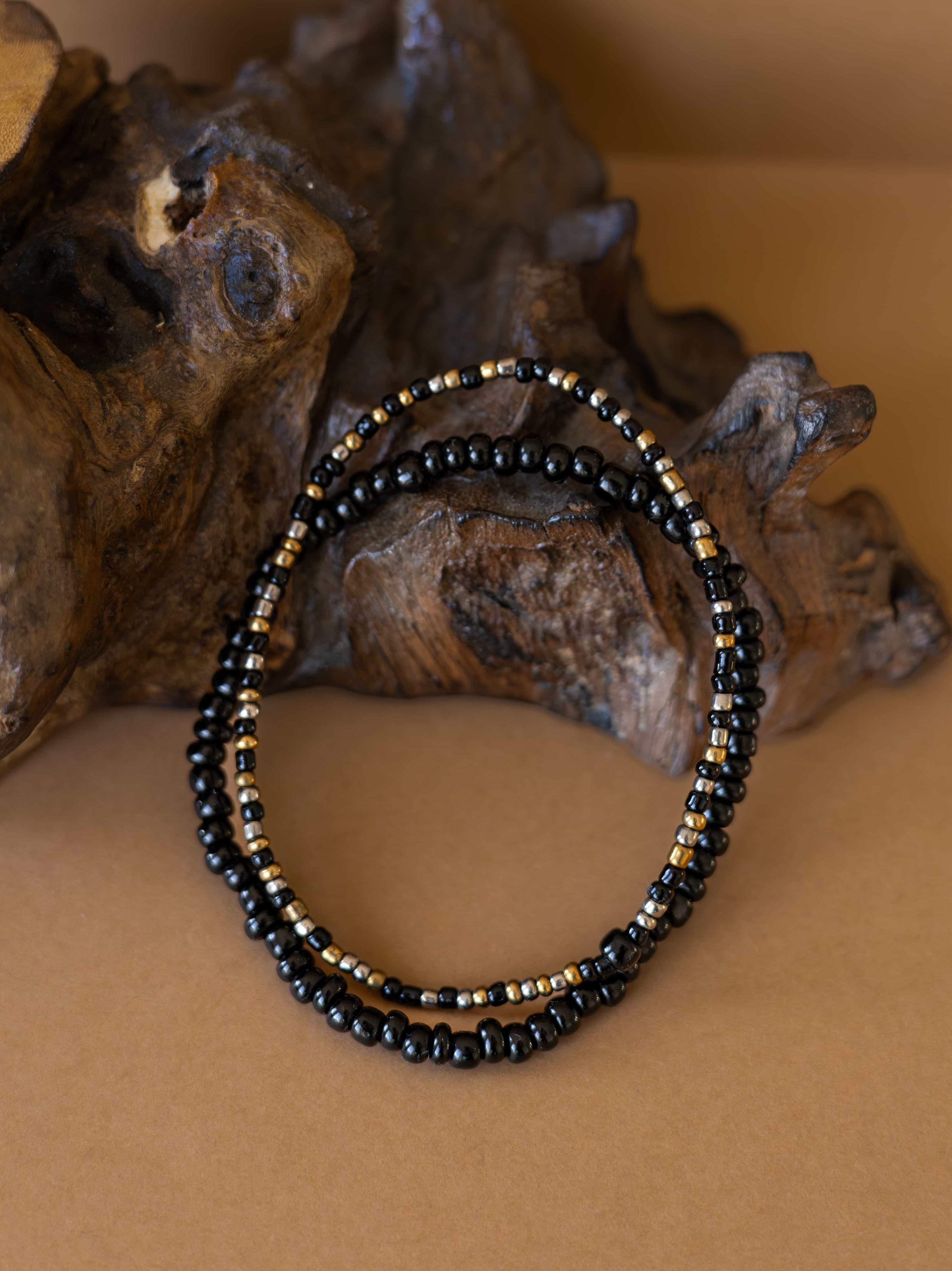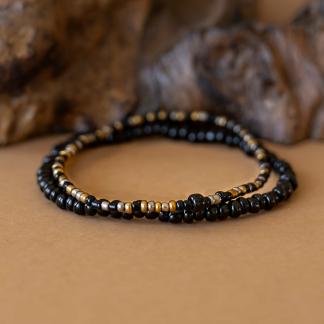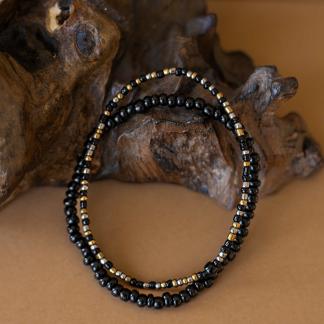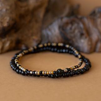 Tento jemný set dvou náramků z drobných rokajl korálků v elegantní černé a sofistikované metalické kombinaci zlatých a stříbrných tónů přináší sofistikovanost, lesk a nadčasovou eleganci.