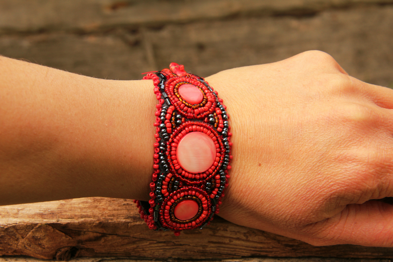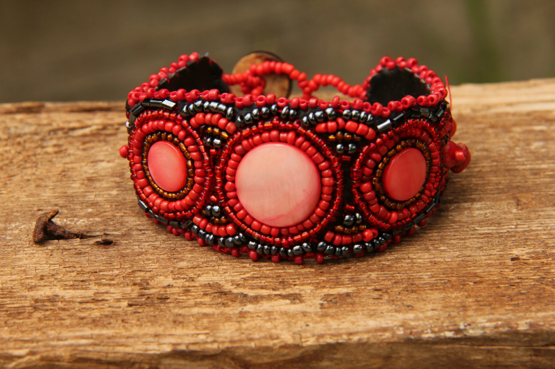 Šperk s harmonicky sladěnou paletou barevných přišívaných korálků a perleťových nuget.