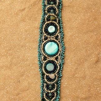 Šperk s harmonicky sladěnou paletou barevných přišívaných korálků a perleťových nuget.