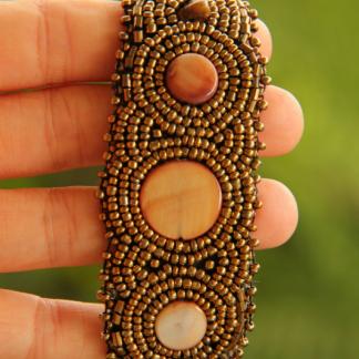 Šperk s harmonicky sladěnou paletou barevných přišívaných korálků a perleťových nuget.