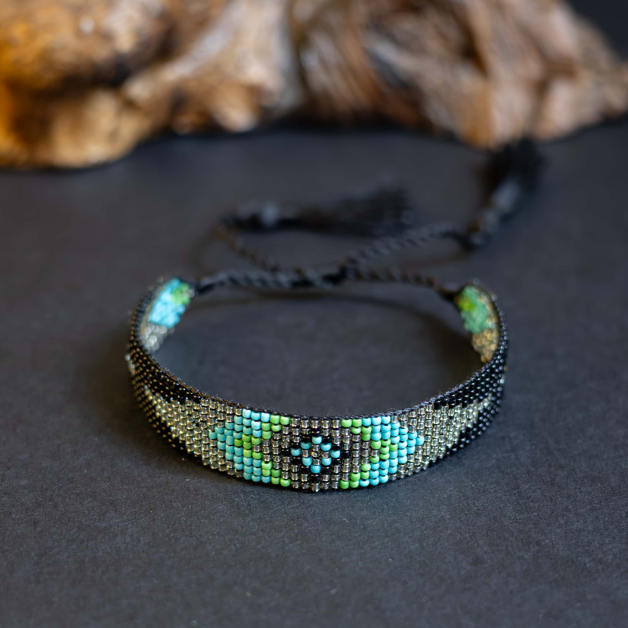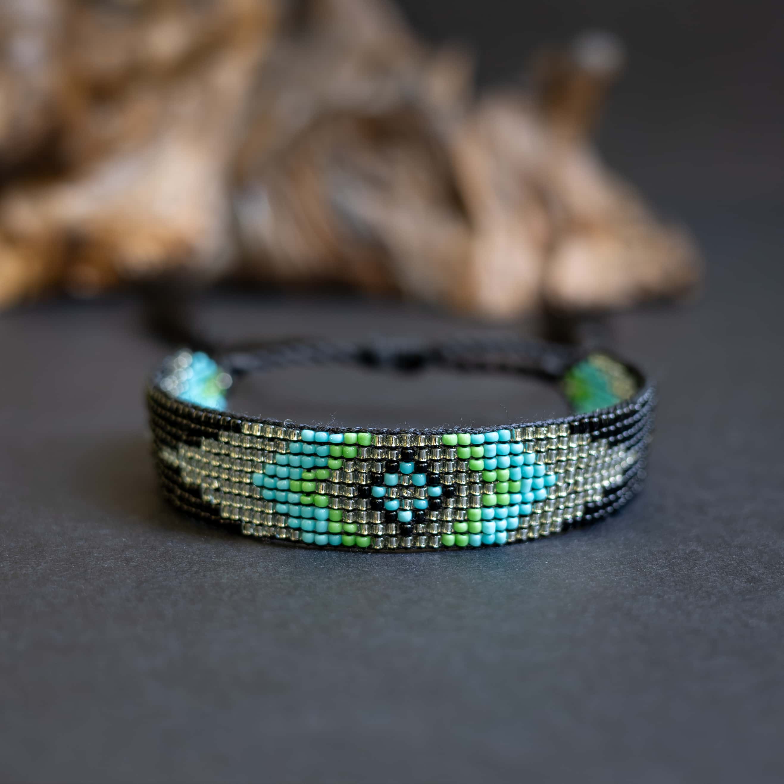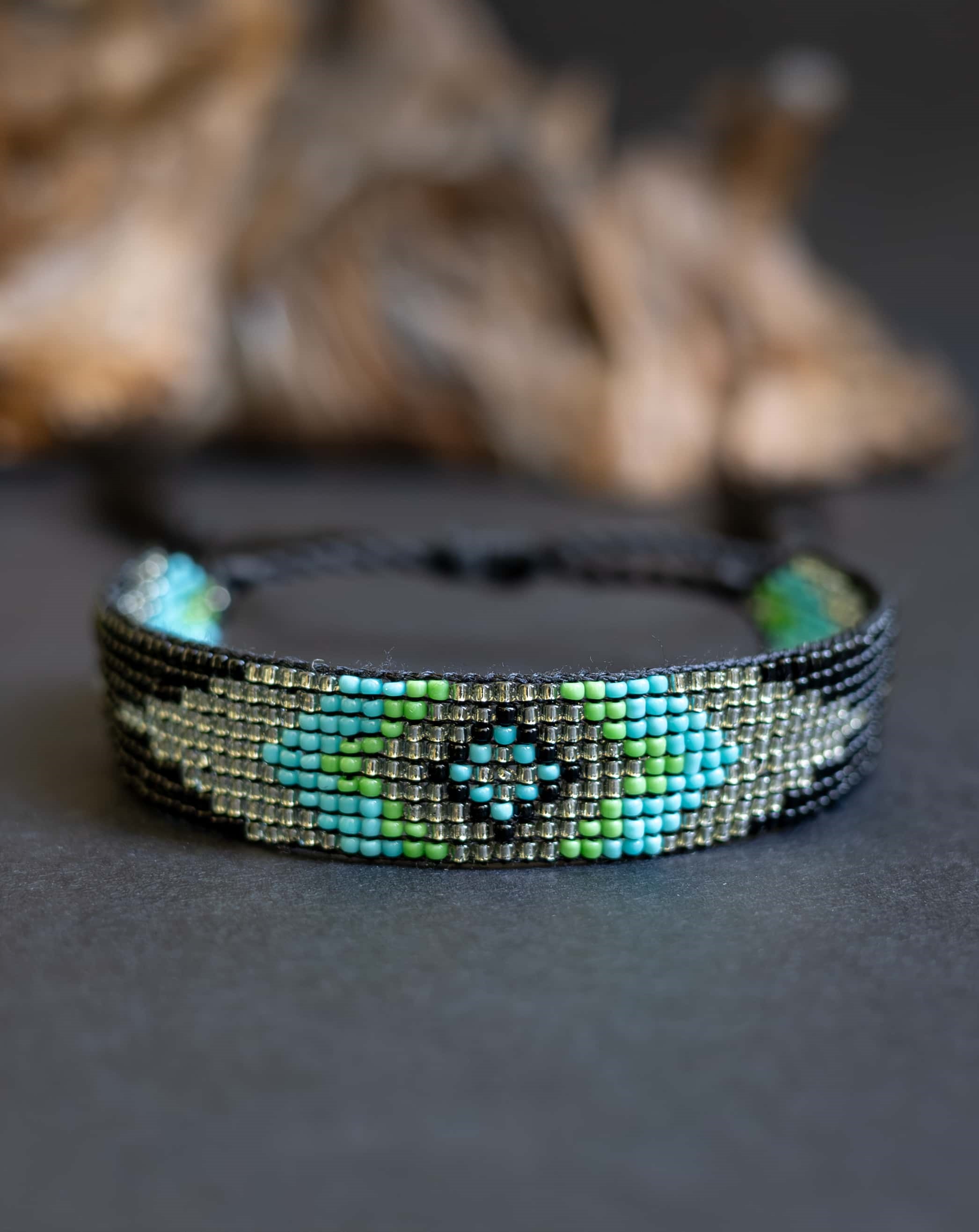 Elegantní a nadčasový náramek ručně vyrobený z drobných japonských korálků Miyuki. Tento jedinečný kousek má 9 řad korálků, které vytvářejí jemný geometrický vzor, a jeho šířka 1 cm z něj dělá nepřehlédnutelný doplněk.