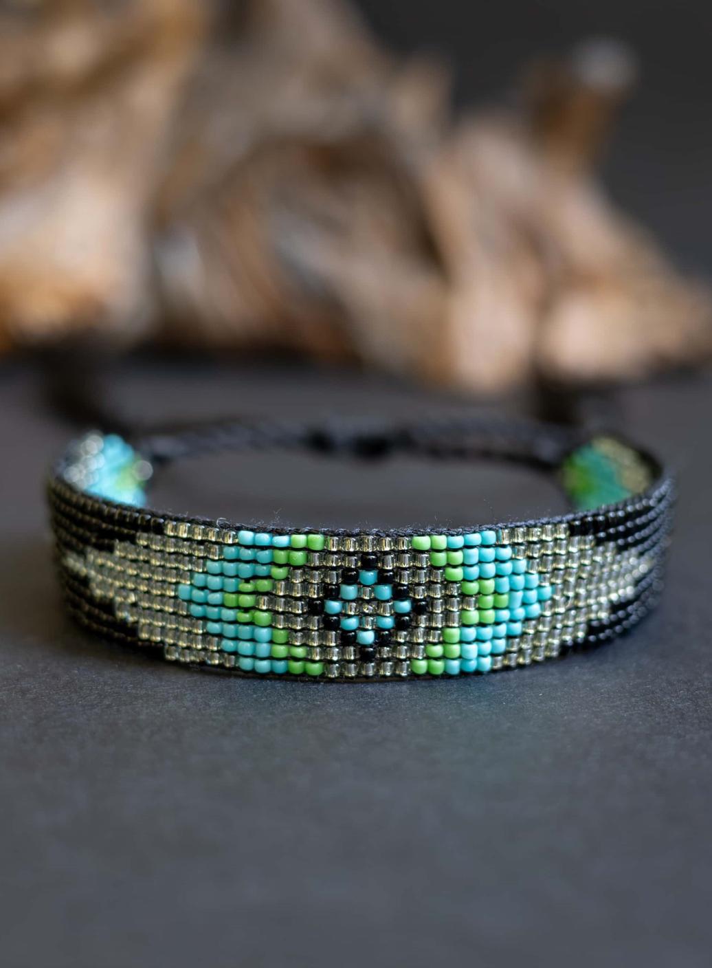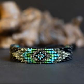 Elegantní a nadčasový náramek ručně vyrobený z drobných japonských korálků Miyuki. Tento jedinečný kousek má 9 řad korálků, které vytvářejí jemný geometrický vzor, a jeho šířka 1 cm z něj dělá nepřehlédnutelný doplněk.