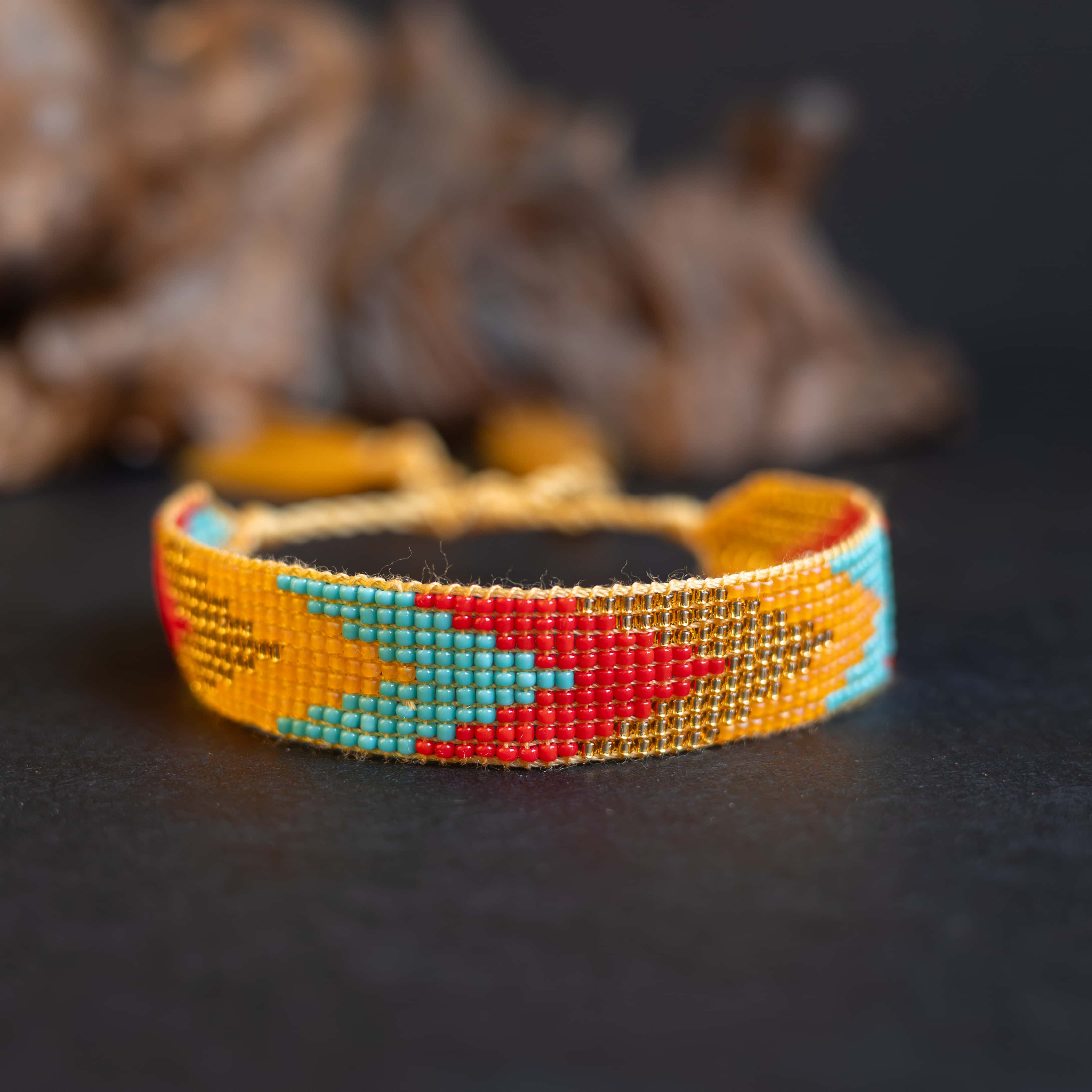Elegantní a nadčasový náramek ručně vyrobený z drobných japonských korálků Miyuki. Tento jedinečný kousek má 9 řad korálků, které vytvářejí jemný geometrický vzor, a jeho šířka 1 cm z něj dělá nepřehlédnutelný doplněk.