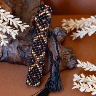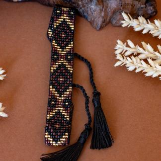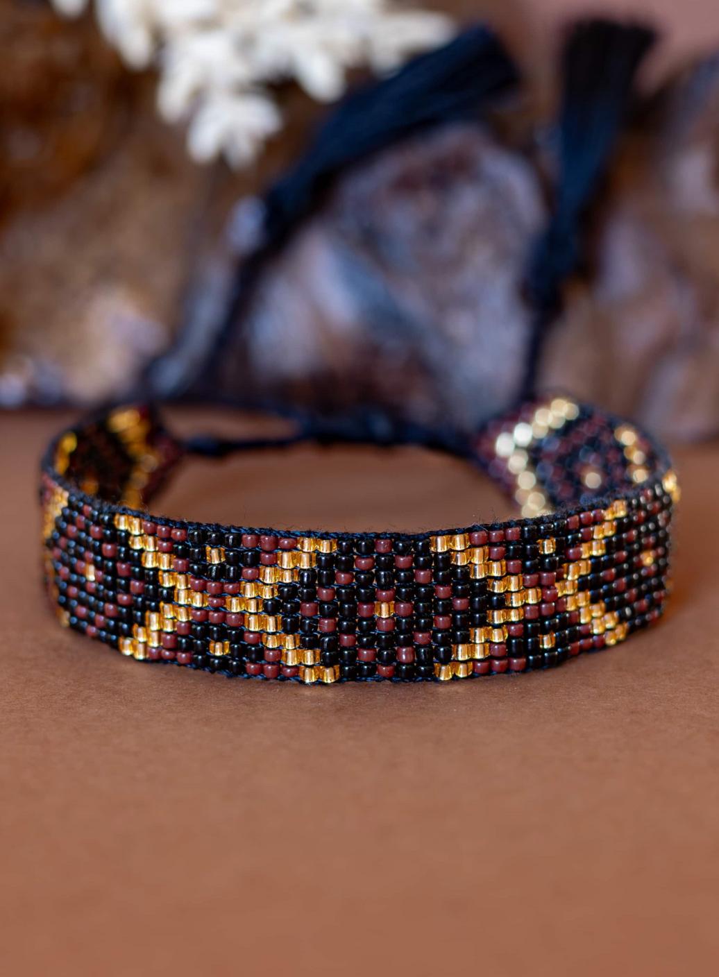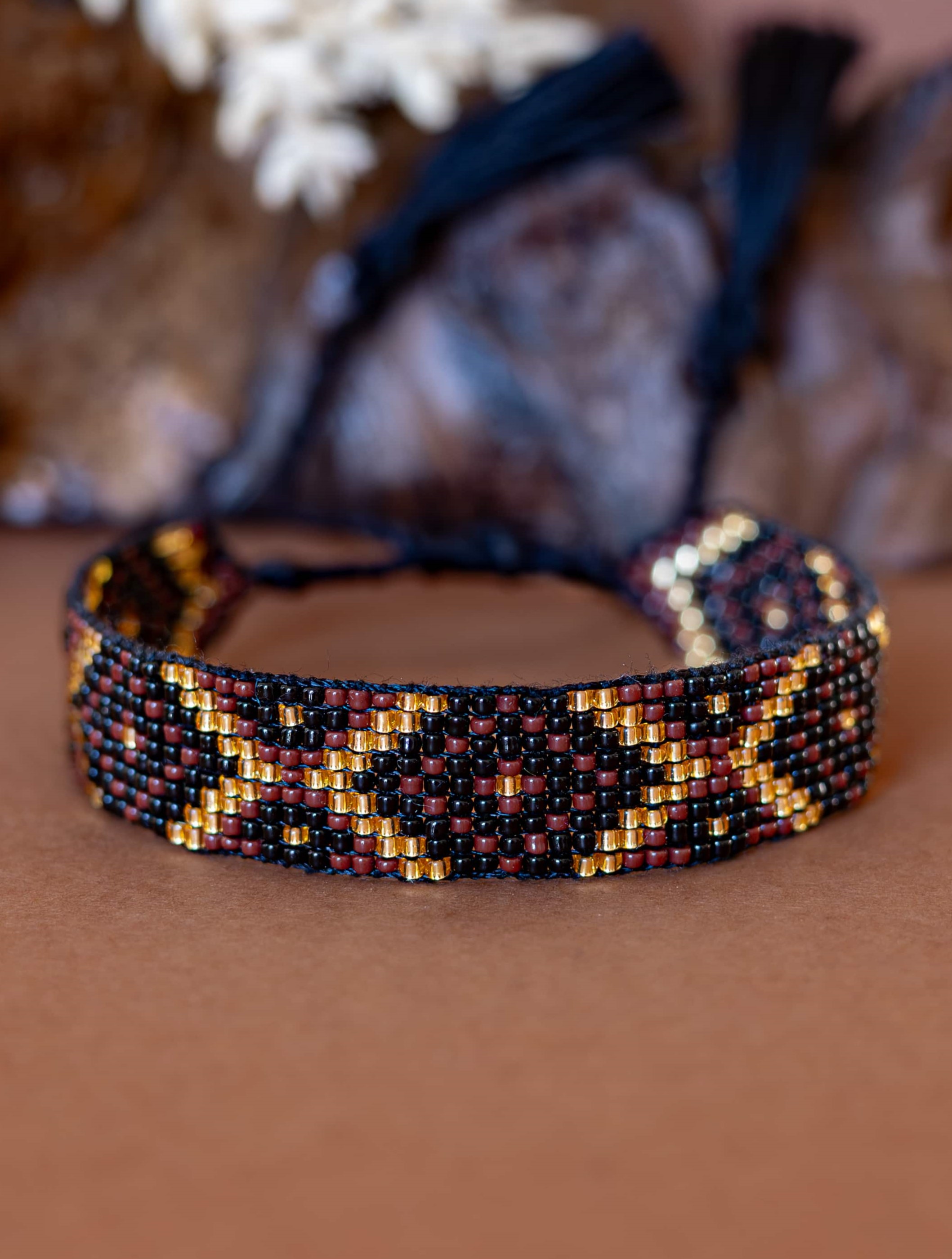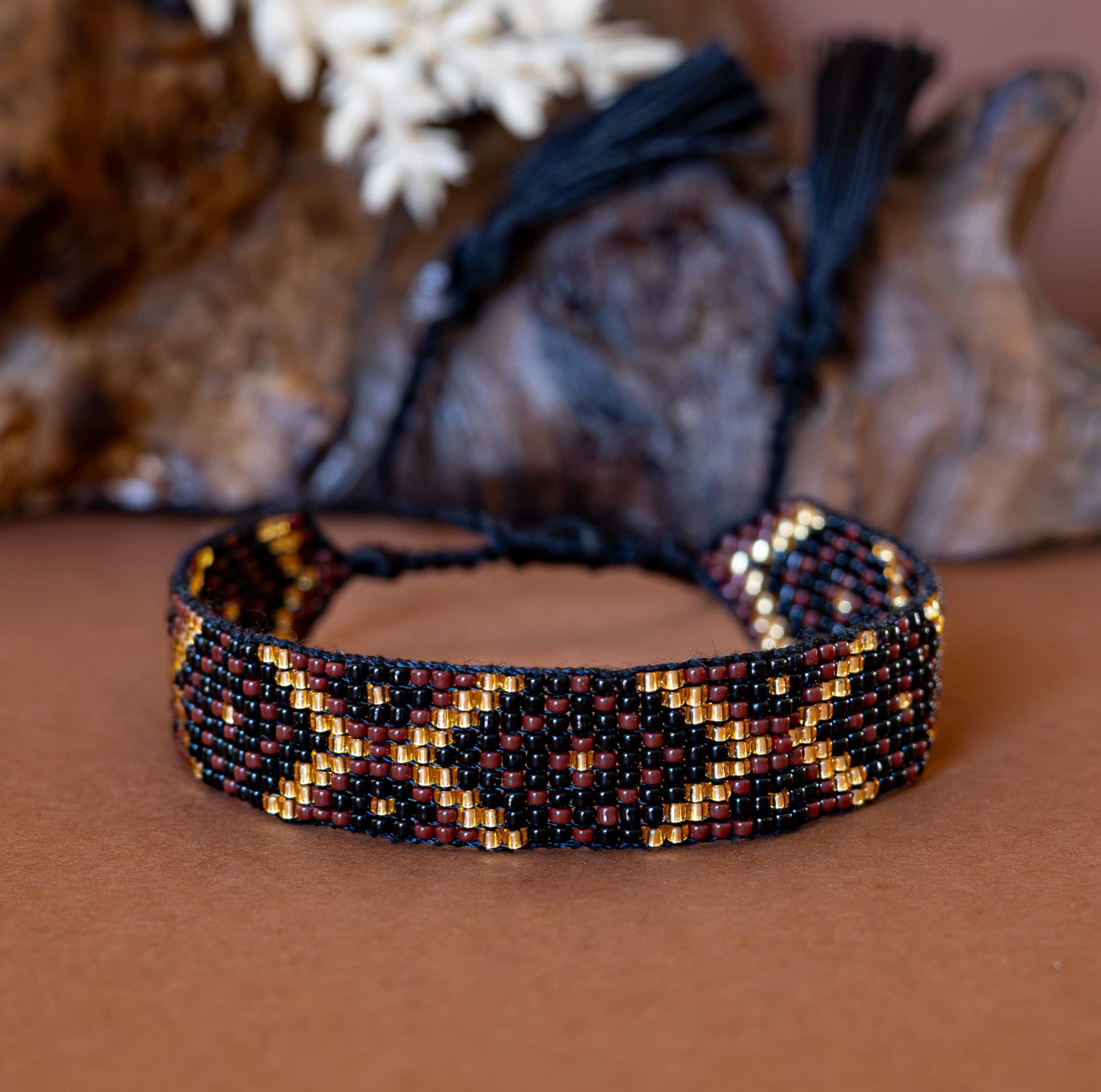 Elegantní a nadčasový náramek ručně vyrobený z drobných japonských korálků Miyuki. Tento jedinečný kousek má 9 řad korálků, které vytvářejí jemný geometrický vzor, a jeho šířka 1 cm z něj dělá nepřehlédnutelný doplněk.