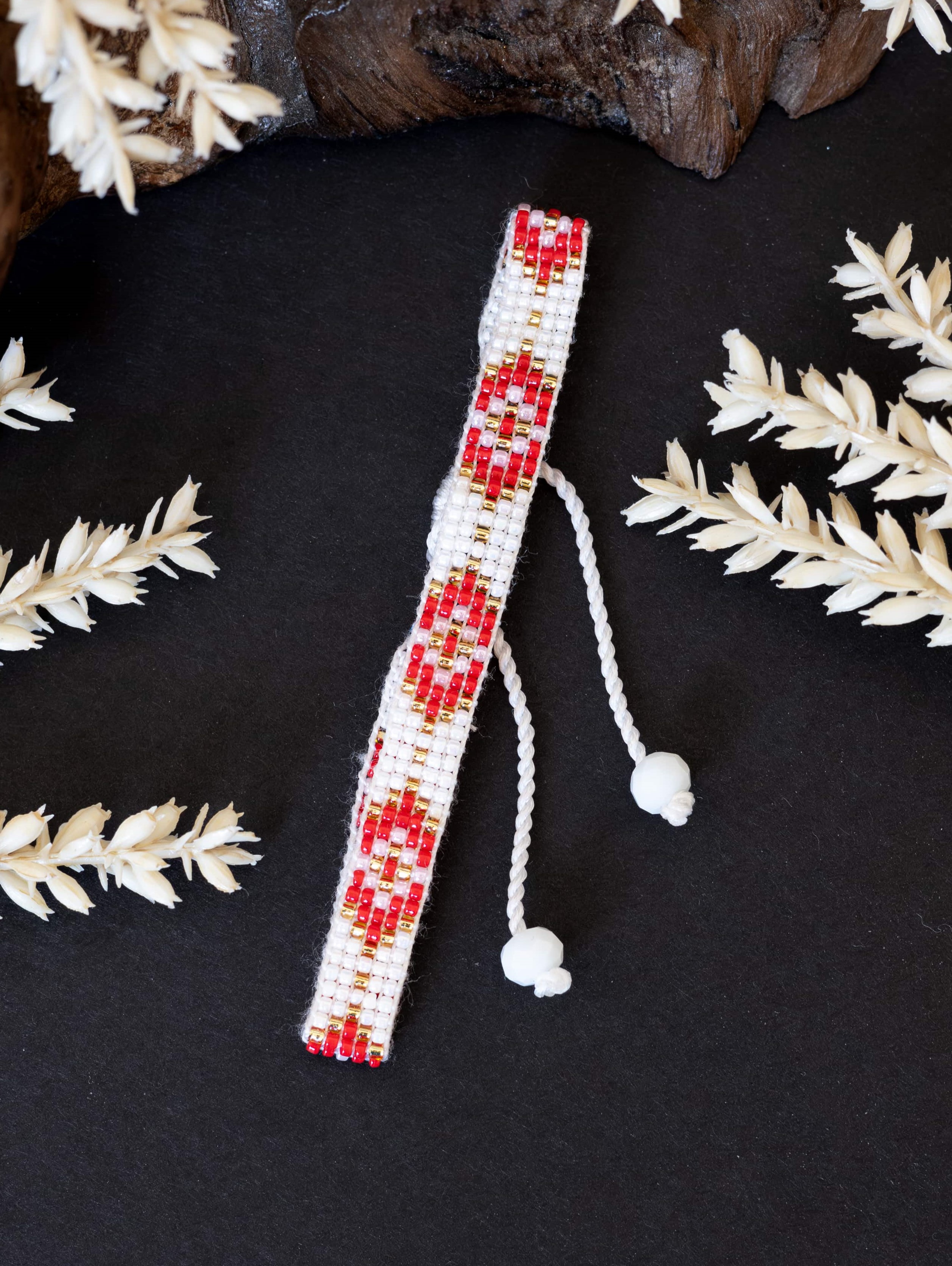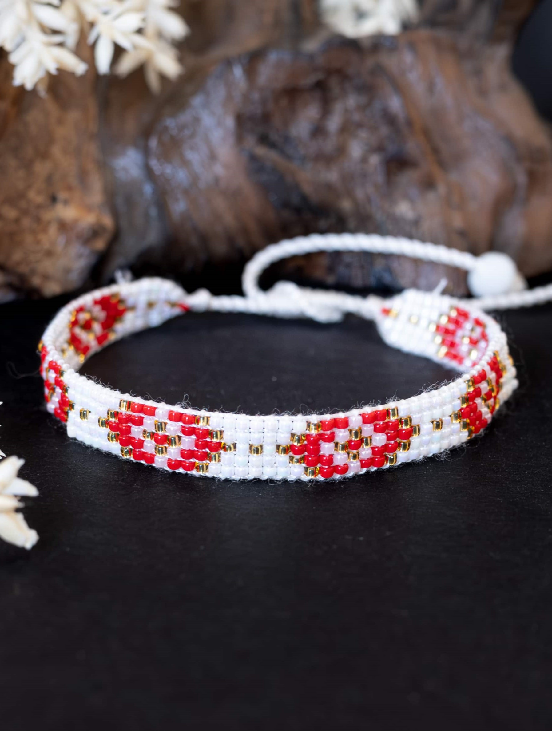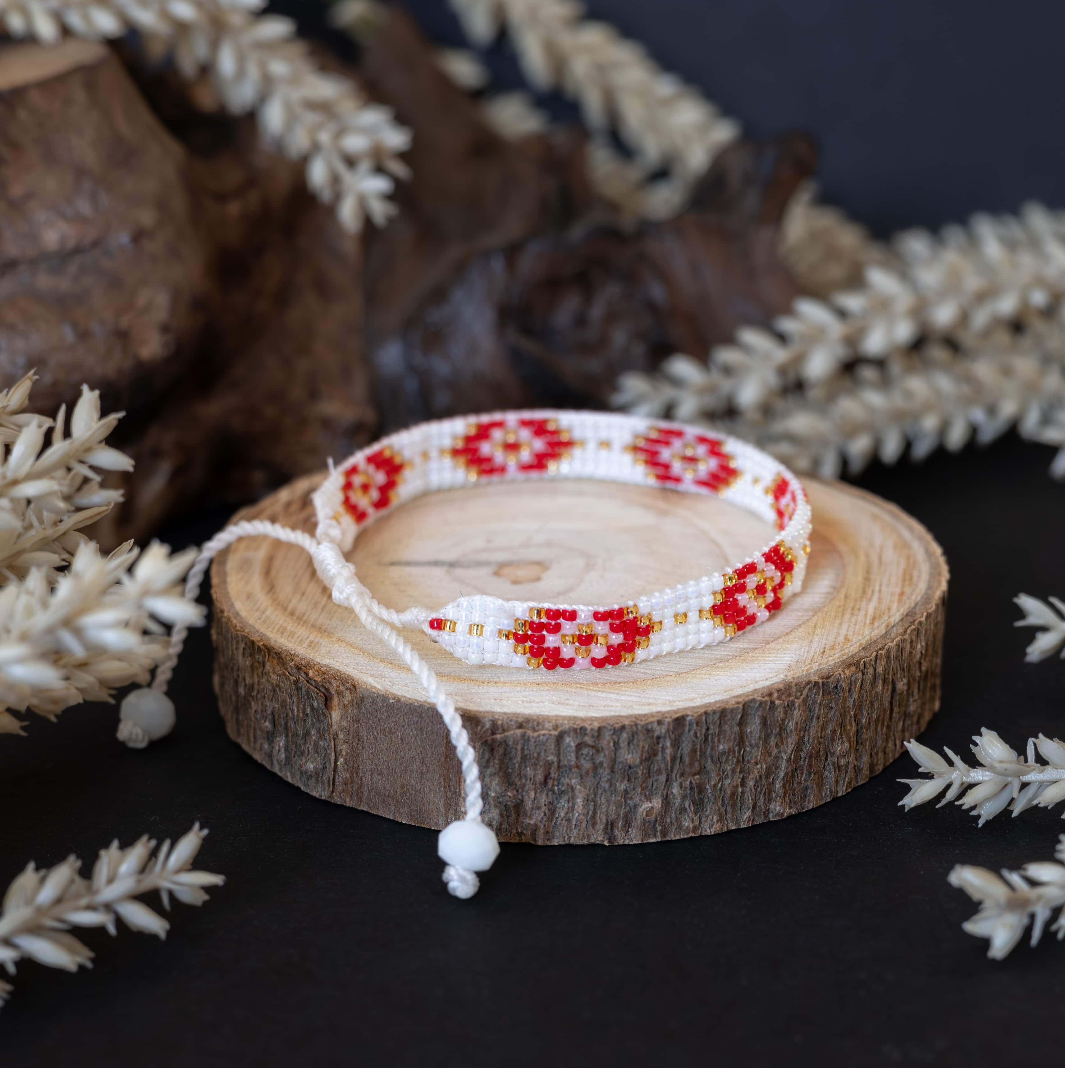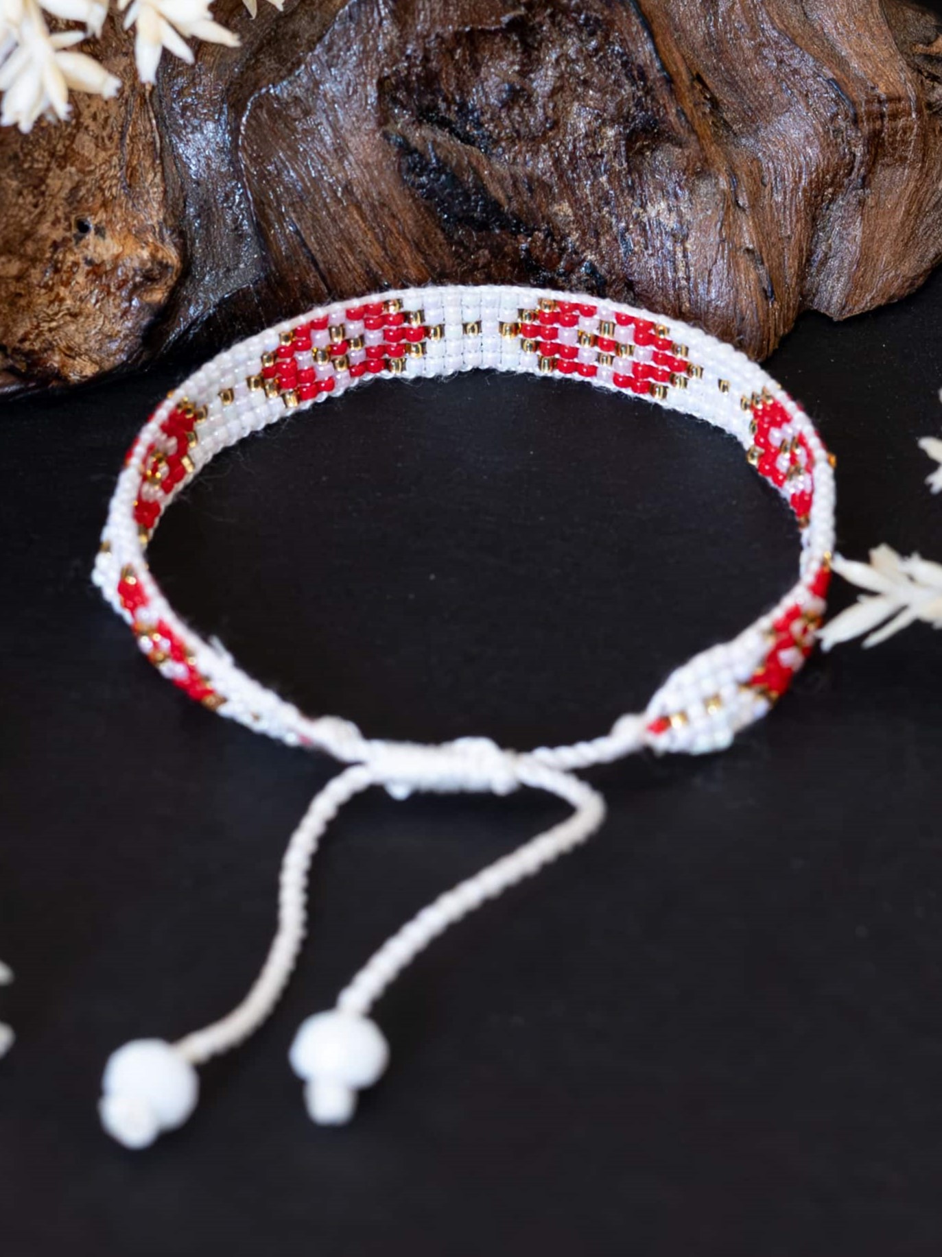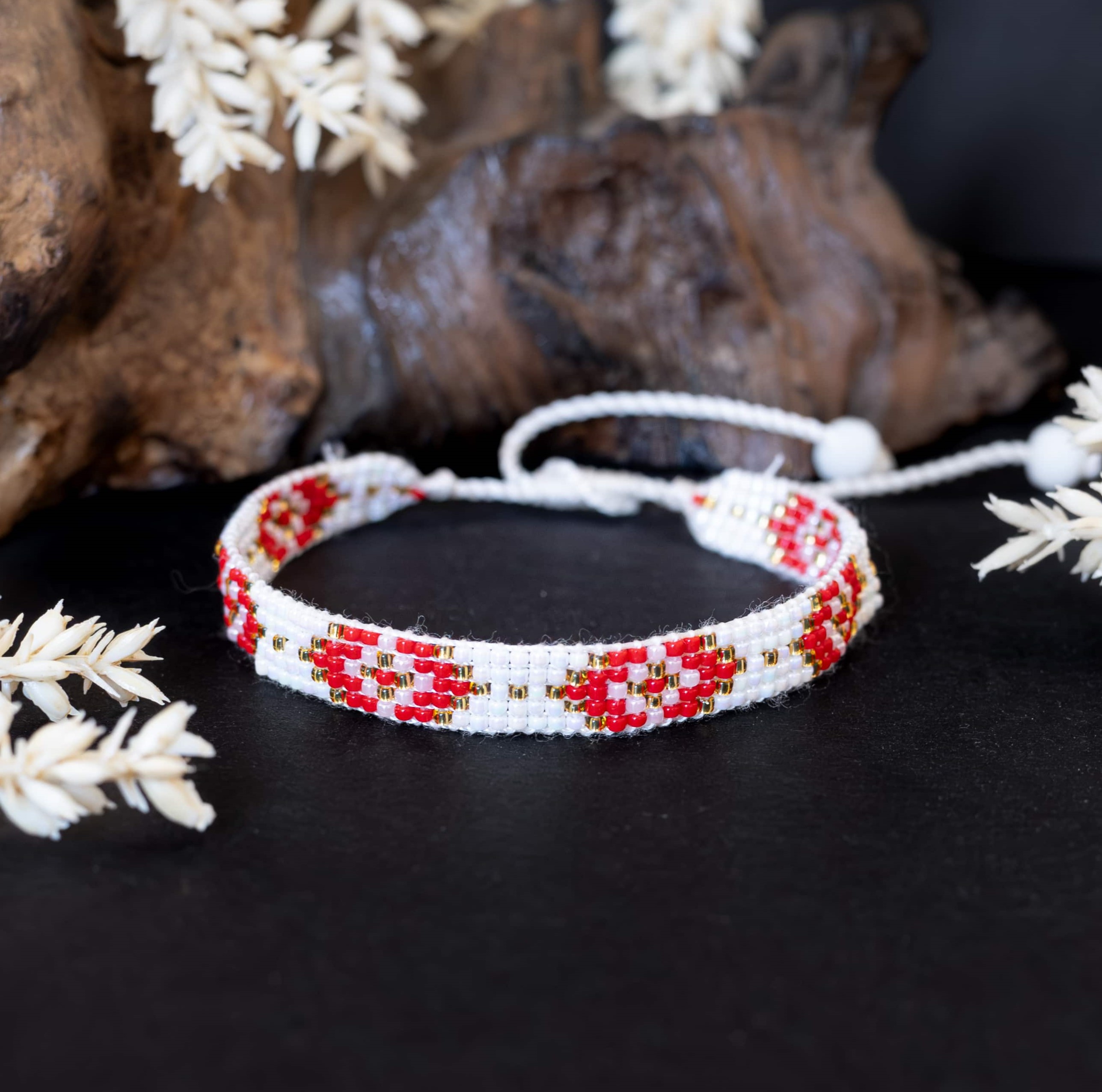 Elegantní a nadčasový náramek ručně vyrobený z drobných japonských korálků Miyuki. Tento jedinečný kousek má 5 řad korálků, které vytvářejí jemný geometrický vzor, a jeho šířka 1 cm z něj dělá nepřehlédnutelný doplněk.