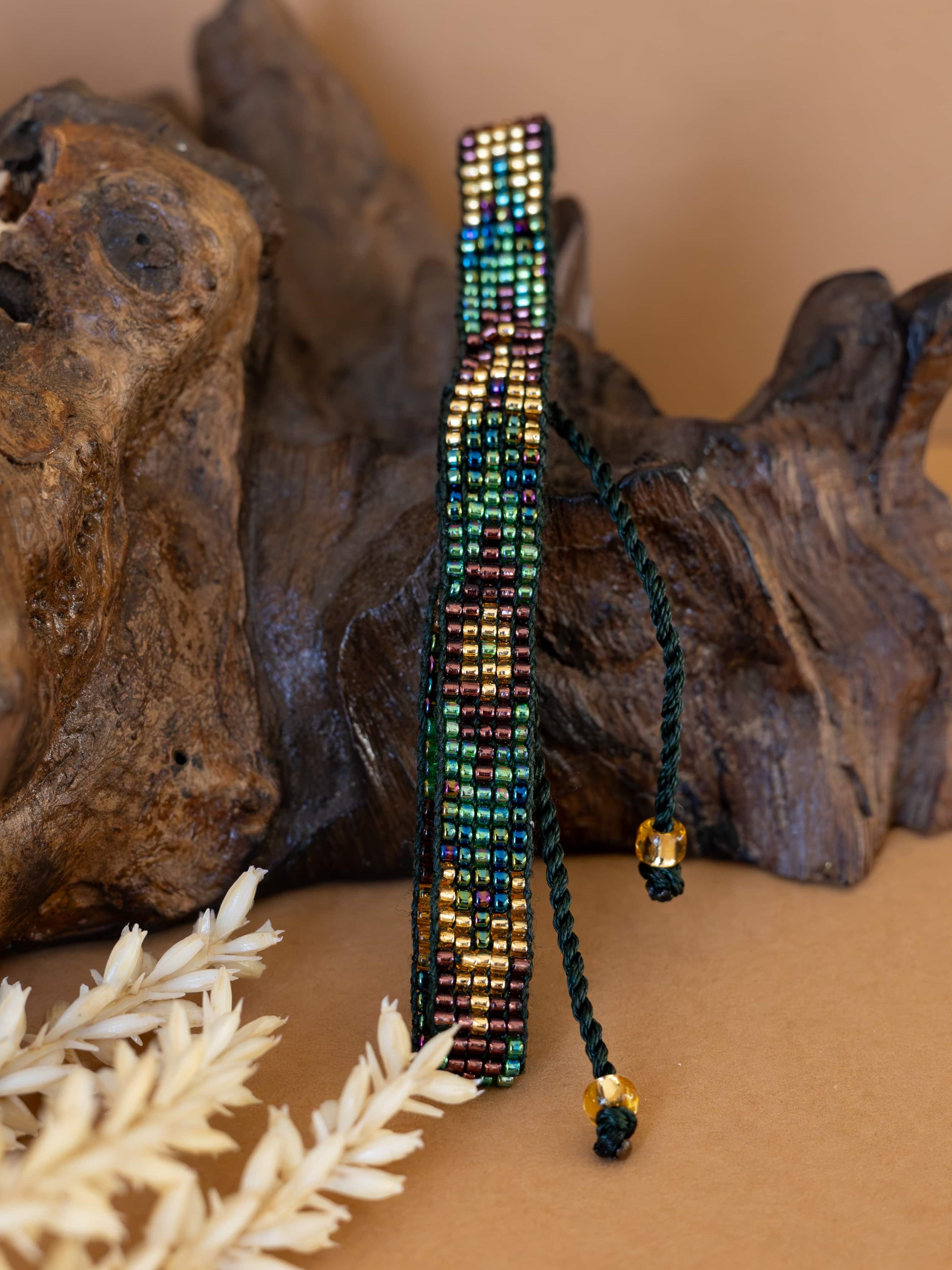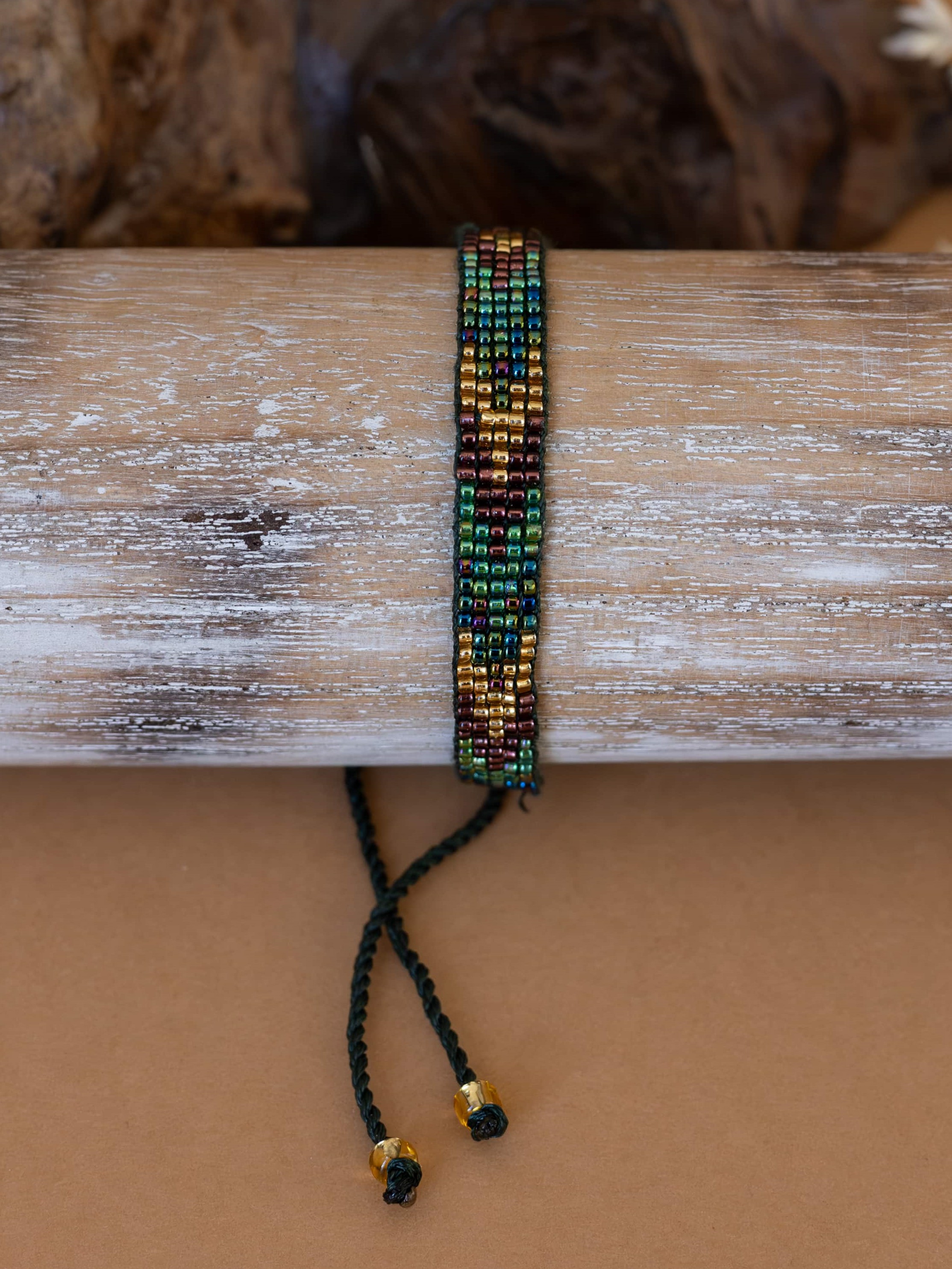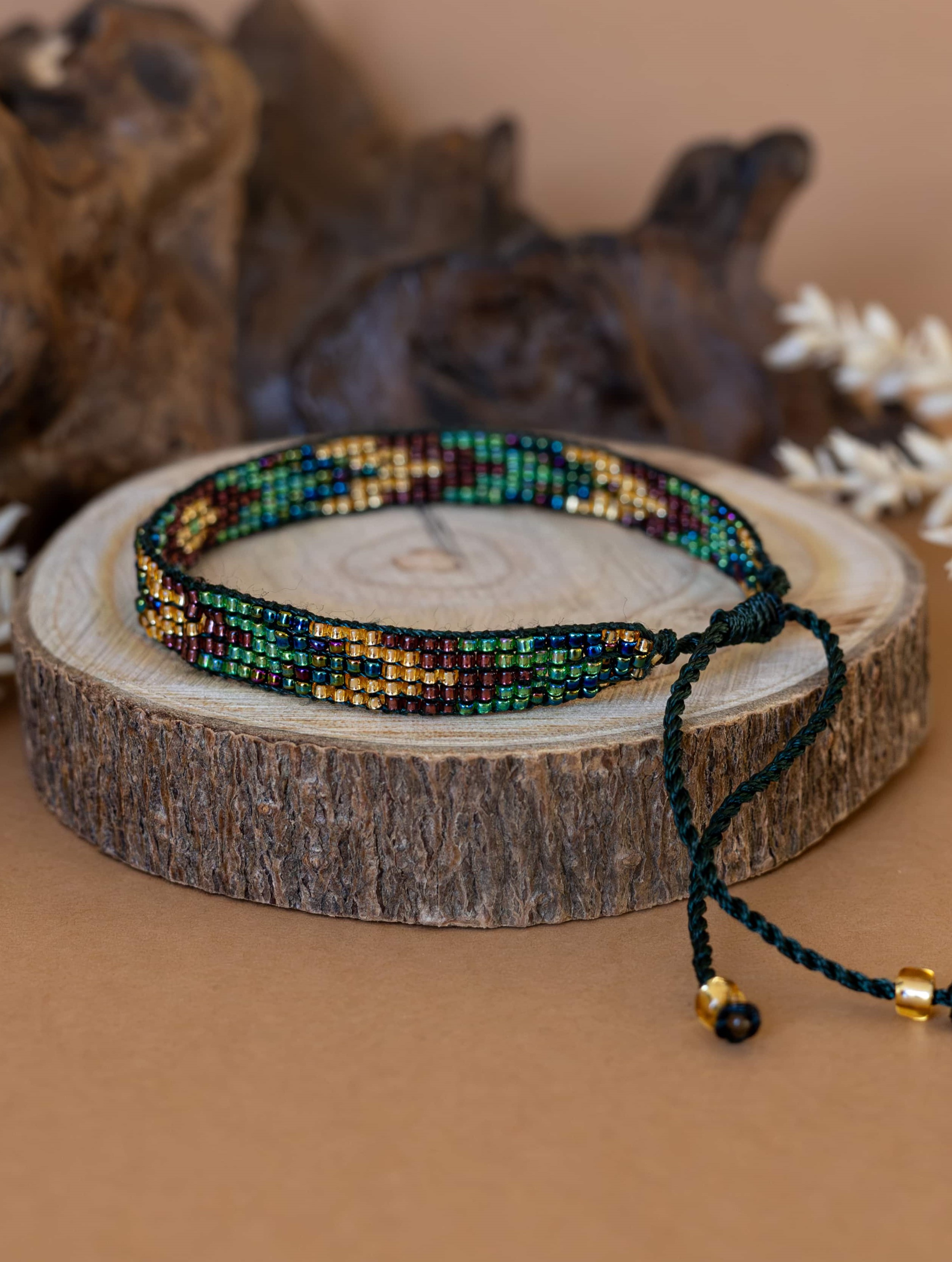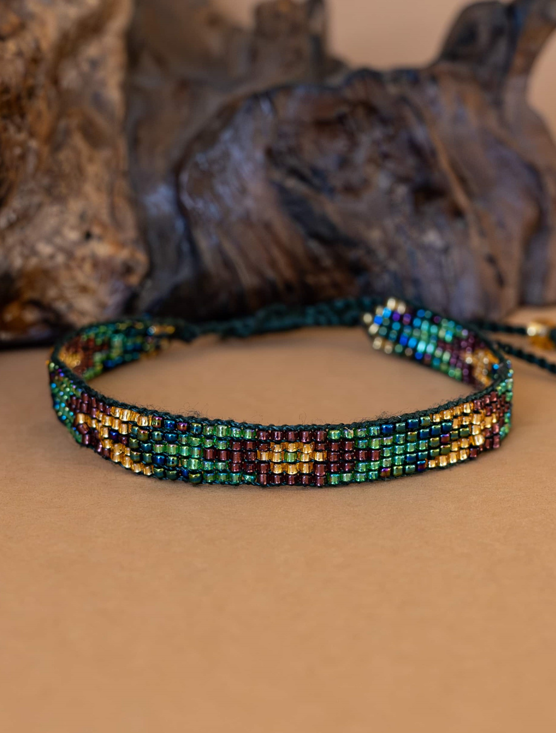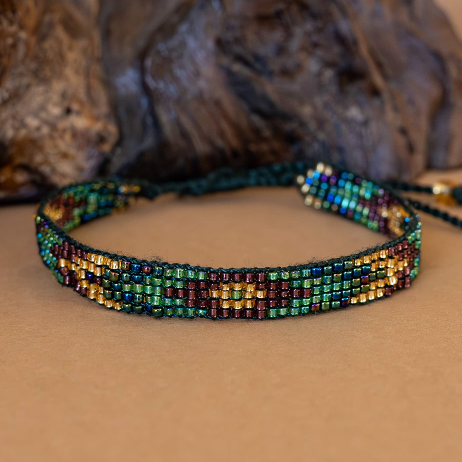 Elegantní a nadčasový náramek ručně vyrobený z drobných japonských korálků Miyuki. Tento jedinečný kousek má 5 řad korálků, které vytvářejí jemný geometrický vzor, a jeho šířka 1 cm z něj dělá nepřehlédnutelný doplněk.
