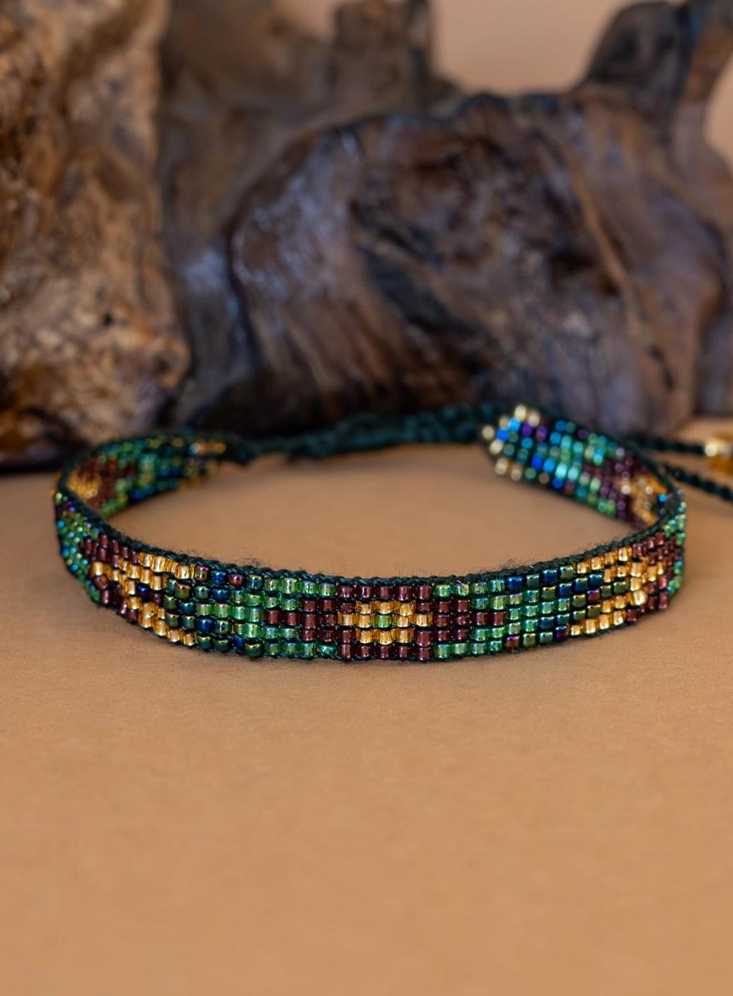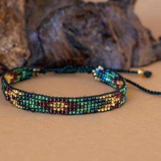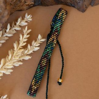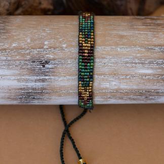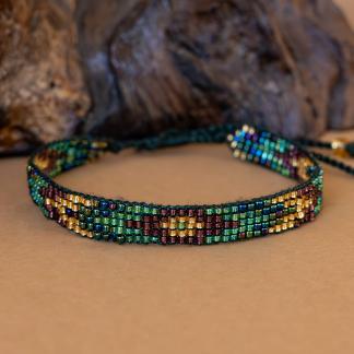 Elegantní a nadčasový náramek ručně vyrobený z drobných japonských korálků Miyuki. Tento jedinečný kousek má 5 řad korálků, které vytvářejí jemný geometrický vzor, a jeho šířka 1 cm z něj dělá nepřehlédnutelný doplněk.