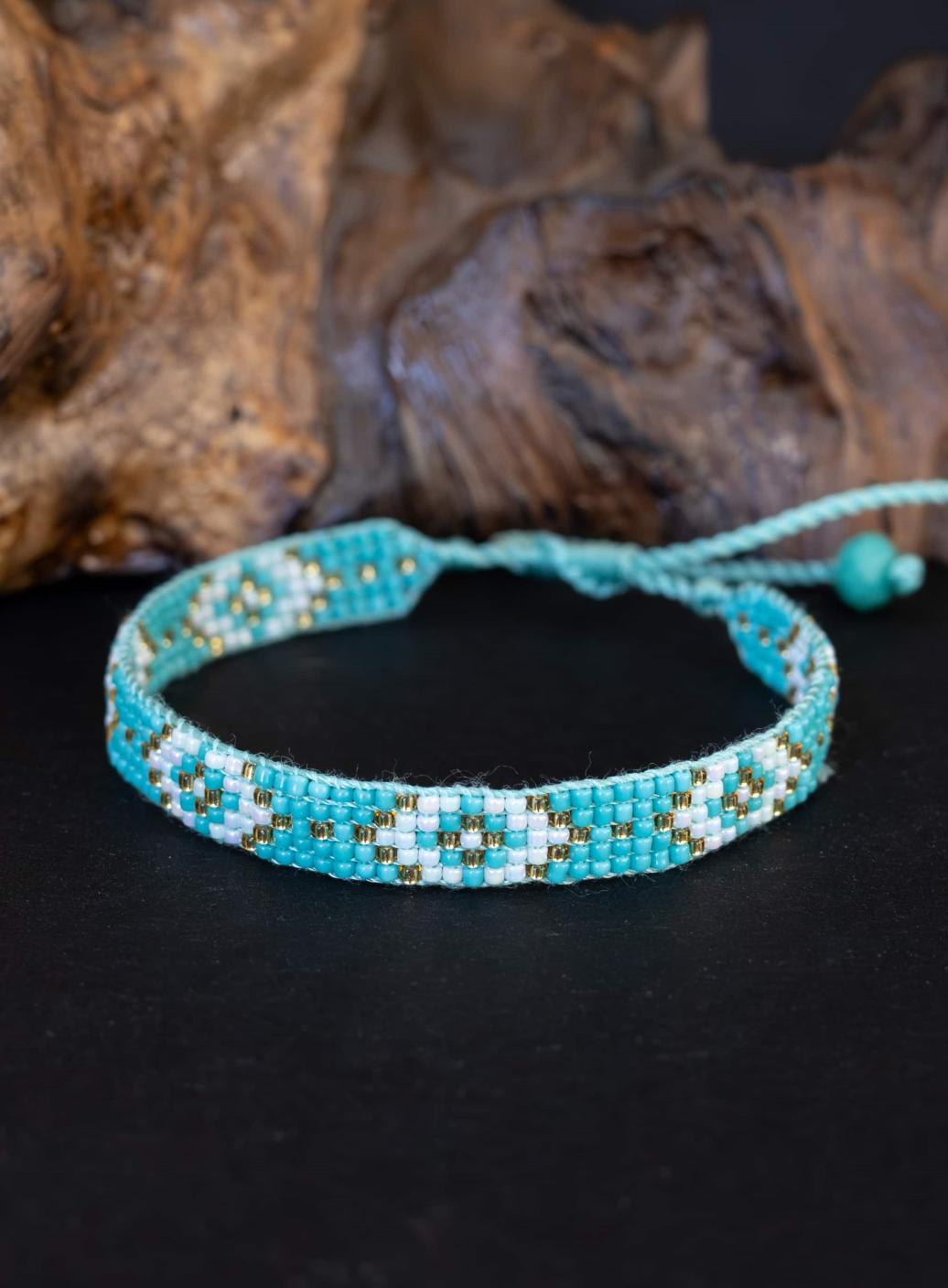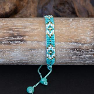 Elegantní a nadčasový náramek ručně vyrobený z drobných japonských korálků Miyuki. Tento jedinečný kousek má 5 řad korálků, které vytvářejí jemný geometrický vzor, a jeho šířka 1 cm z něj dělá nepřehlédnutelný doplněk.