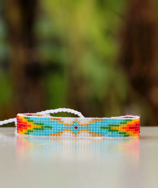 Elegantní a nadčasový náramek ručně vyrobený z drobných japonských korálků Miyuki. Tento jedinečný kousek má 7 řad korálků, které vytvářejí jemný geometrický vzor, a jeho šířka 1 cm z něj dělá nepřehlédnutelný doplněk.