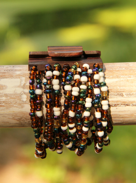 Originální, korálkový náramek se zapínáním na dřevěnou přezku, která je zároveň zajímavým prvkem šperku. Korálky jsou navlečeny na pružných gumičkách.