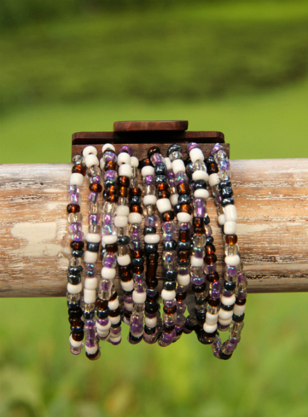 Originální, korálkový náramek se zapínáním na dřevěnou přezku, která je zároveň zajímavým prvkem šperku. Korálky jsou navlečeny na pružných gumičkách.