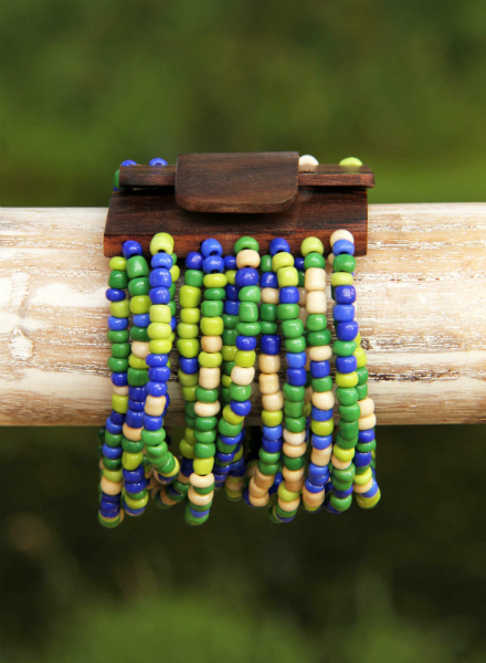 Originální, korálkový náramek se zapínáním na dřevěnou přezku, která je zároveň zajímavým prvkem šperku. Korálky jsou navlečeny na pružných gumičkách.