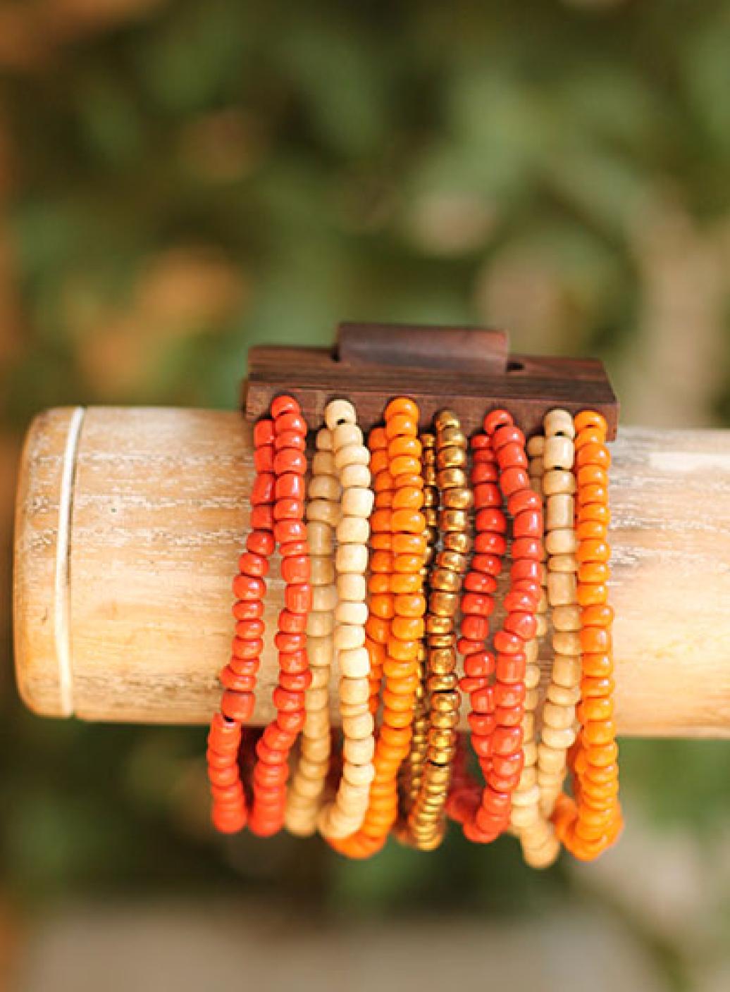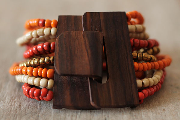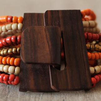 Originální, korálkový náramek se zapínáním na dřevěnou přezku, která je zároveň zajímavým prvkem šperku. Korálky jsou navlečeny na pružných gumičkách.
