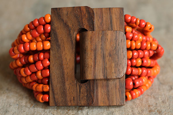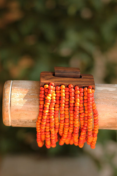 Originální, korálkový náramek se zapínáním na dřevěnou přezku, která je zároveň zajímavým prvkem šperku. Korálky jsou navlečeny na pružných gumičkách.