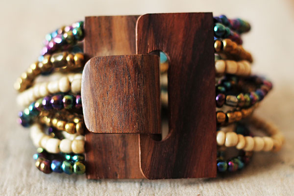 Originální, korálkový náramek se zapínáním na dřevěnou přezku, která je zároveň zajímavým prvkem šperku. Korálky jsou navlečeny na pružných gumičkách.
