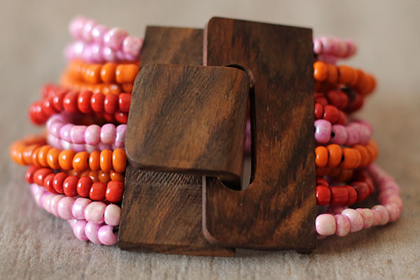 Originální, korálkový náramek se zapínáním na dřevěnou přezku, která je zároveň zajímavým prvkem šperku. Korálky jsou navlečeny na pružných gumičkách.